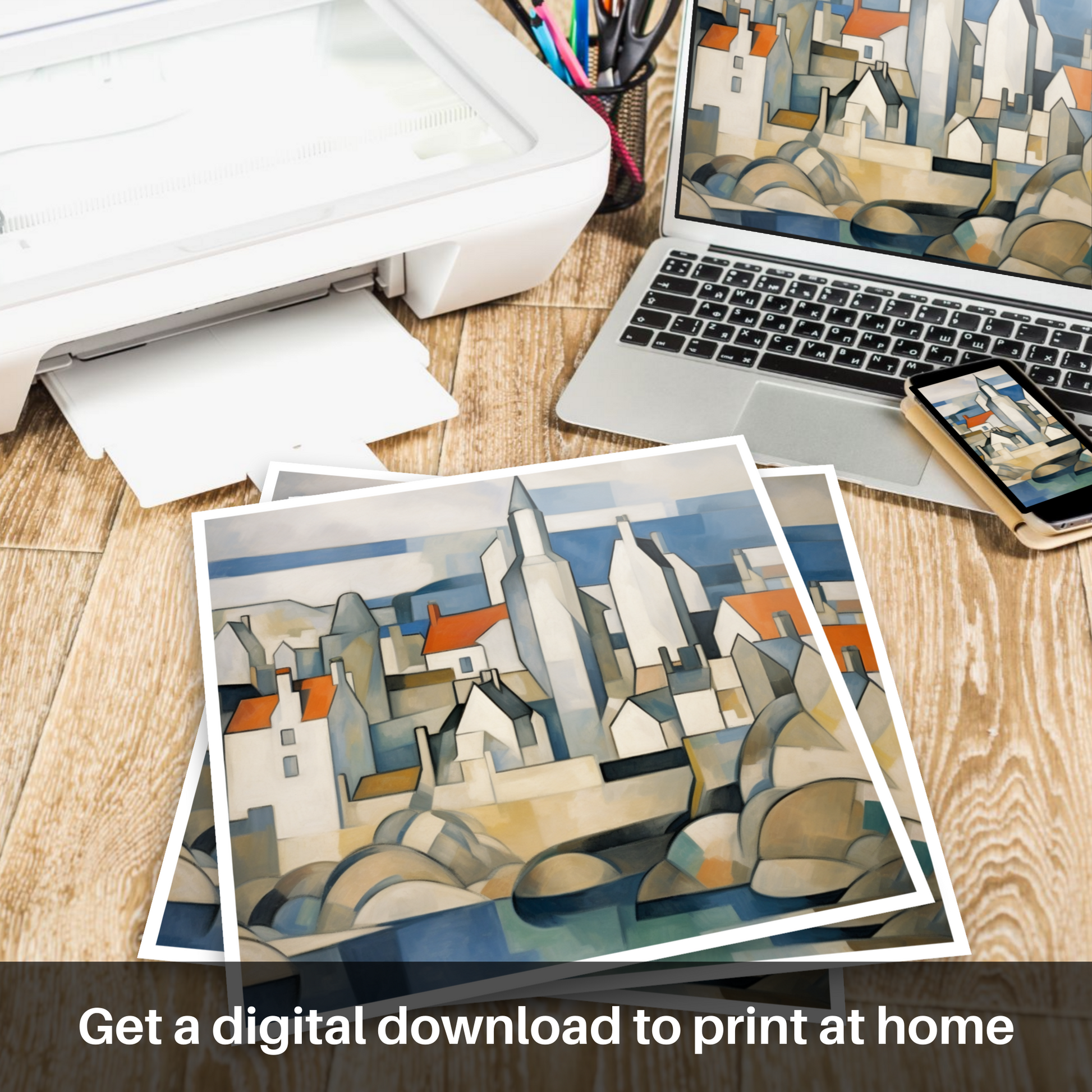 This print from the 'Scottish Villages' collection presents an opportunity to own a moment of visual poetry, a celebration of Scottish heritage through the lens of forward-thinking artistry—a statement piece for any lover of Scotland, Cubism, or the simply sublime.