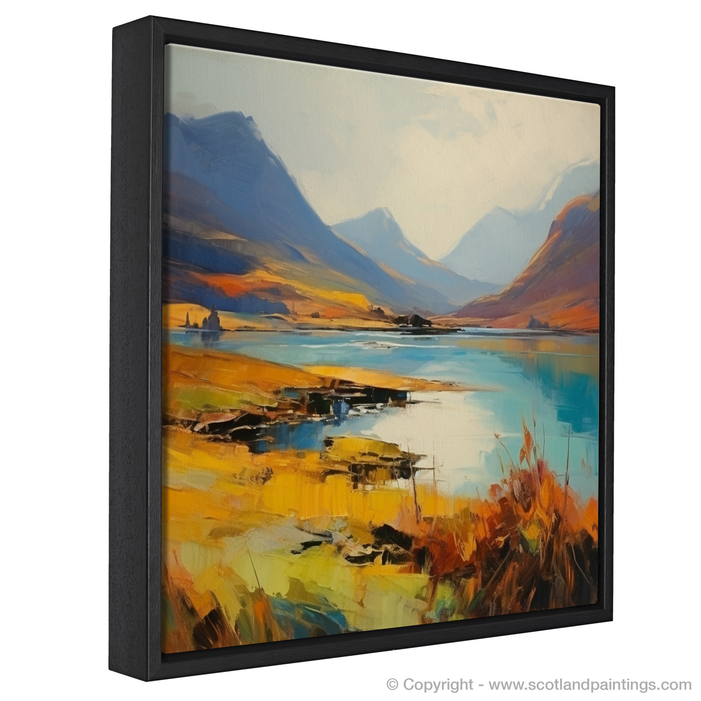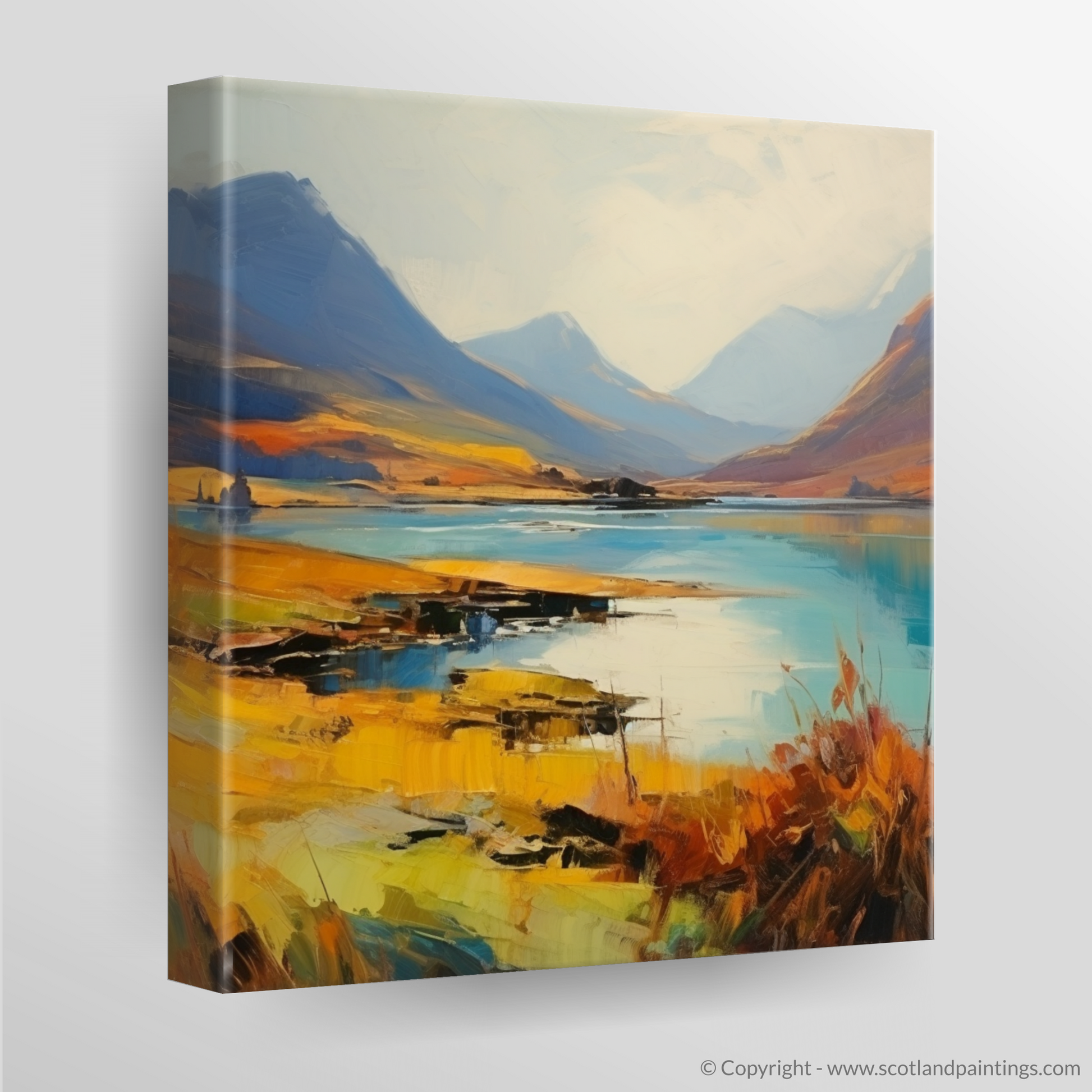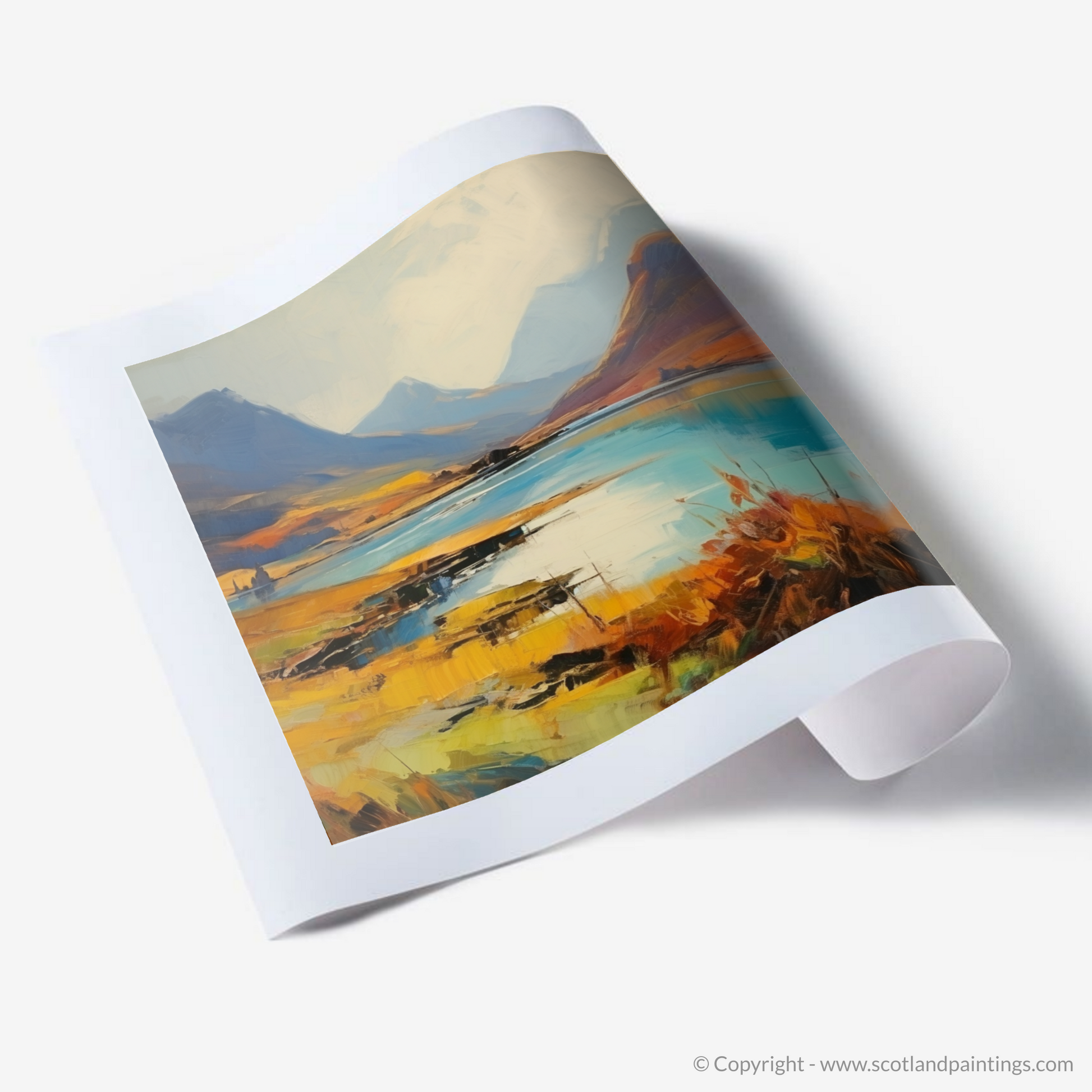 As your gaze settles upon this artwork, you are immediately drawn into a vibrant tableau reminiscent of a placid loch mirroring the fiery hues of a twilight sky. The foreground is rich with abstracted shapes of heather and bracken, their russets and umbers suggesting the wild, untamed flora of the glen. This melange of warm earth tones juxtaposes harmoniously with the cool blues and reflective teal of the water, an homage to the pristine, mirror-like quality of the loch's surface.