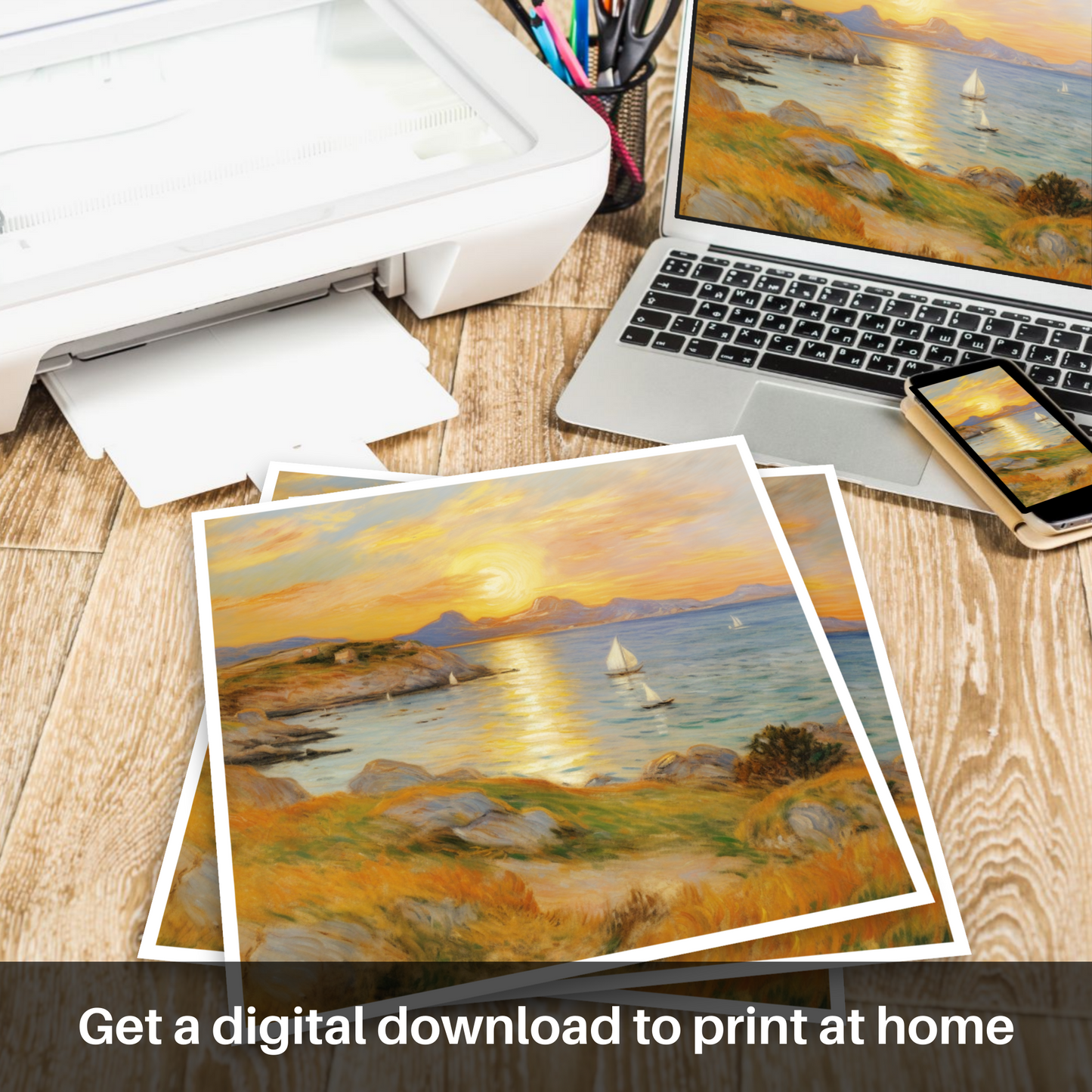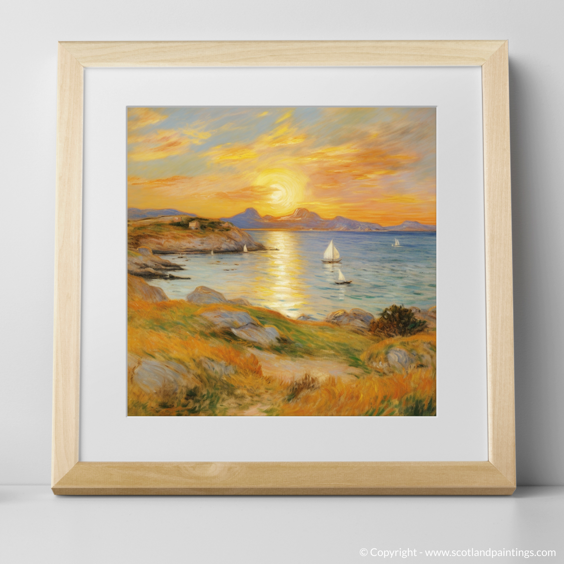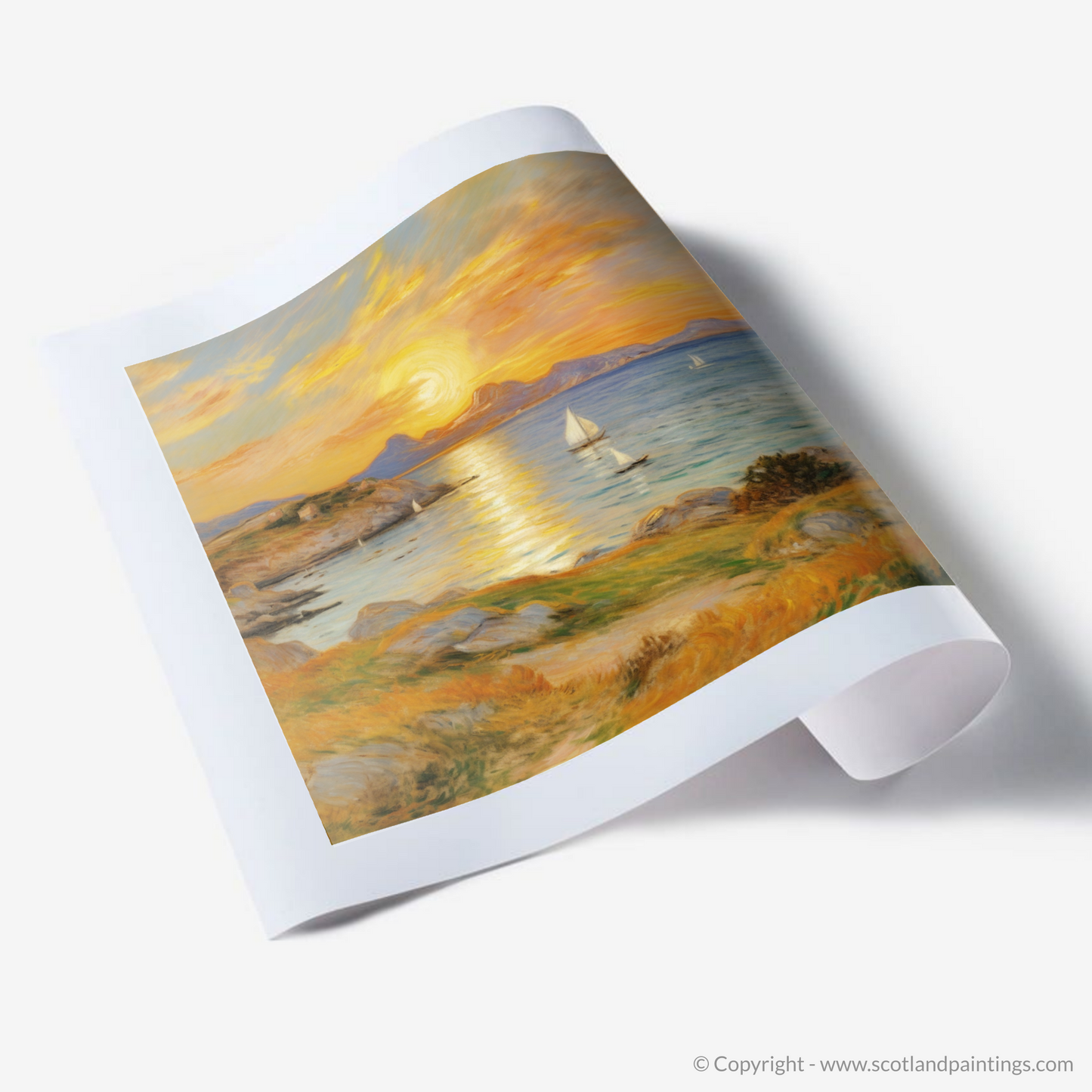 Bathed in the warm, luminescent glow of the setting sun, this captivating print captures the serene beauty of the Sound of Iona's coastline during the enchanting golden hour. Whisking viewers away to a tranquil Scottish cove, the piece masterfully embodies the essence of Impressionist art with its loose brushwork and vivid interplay of light and colour.