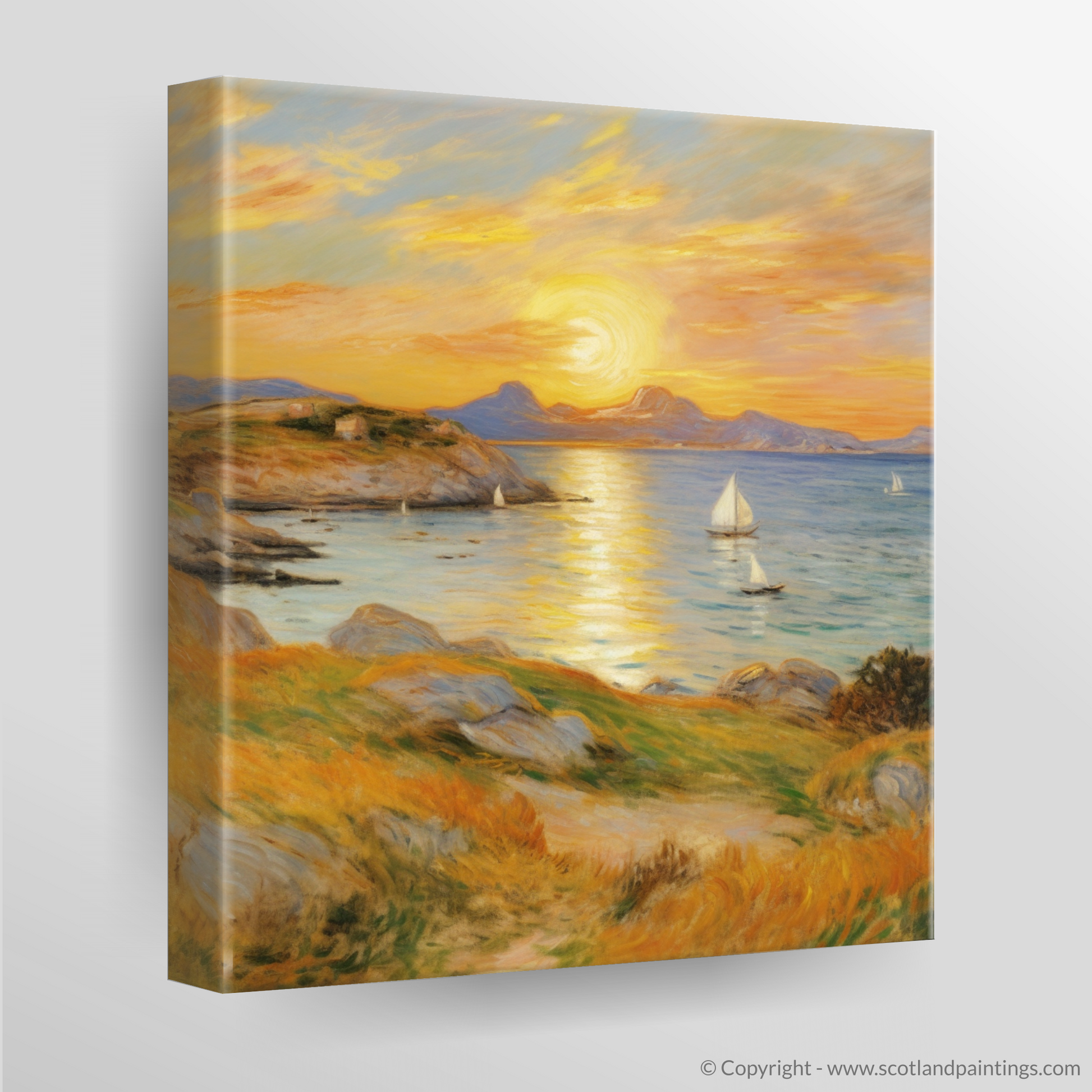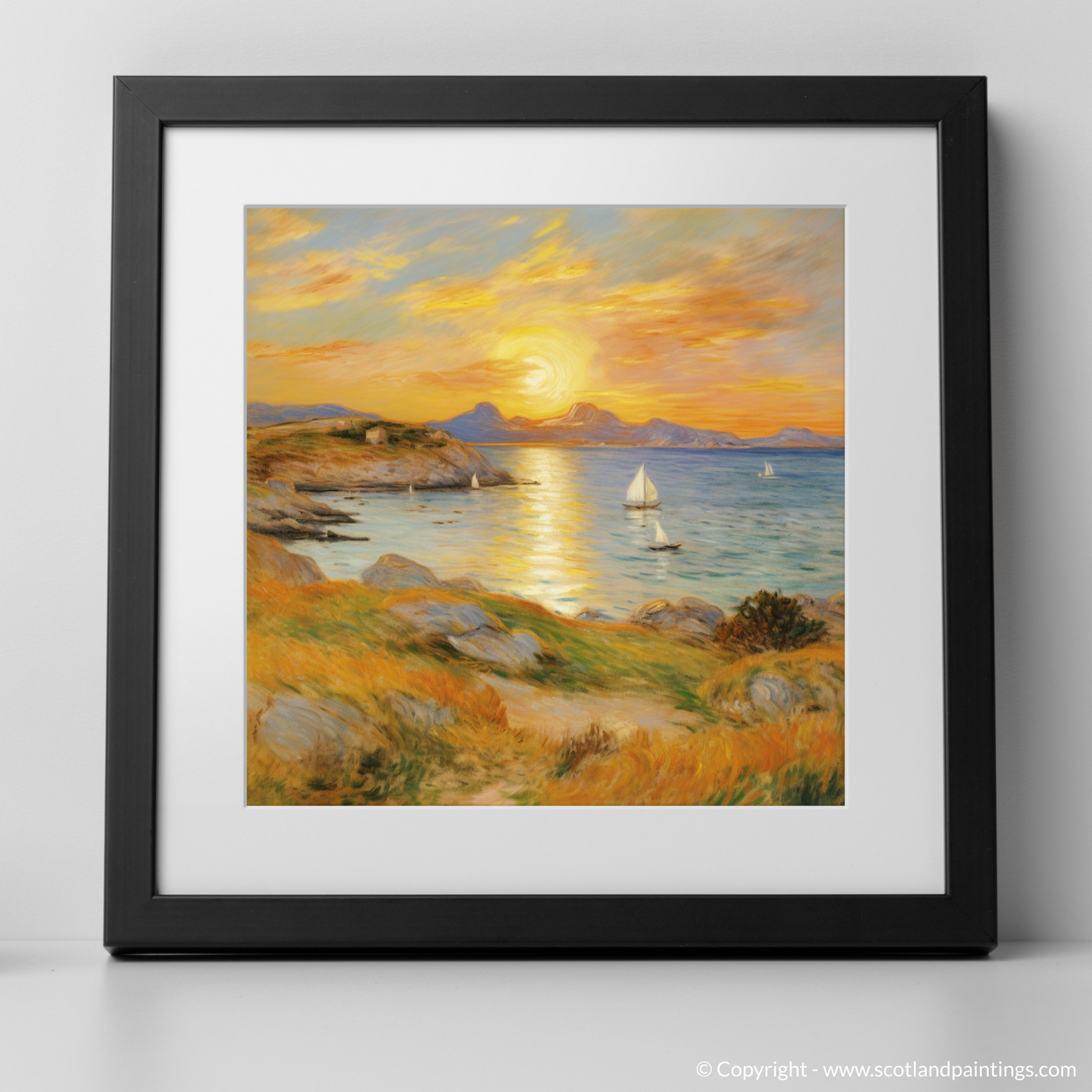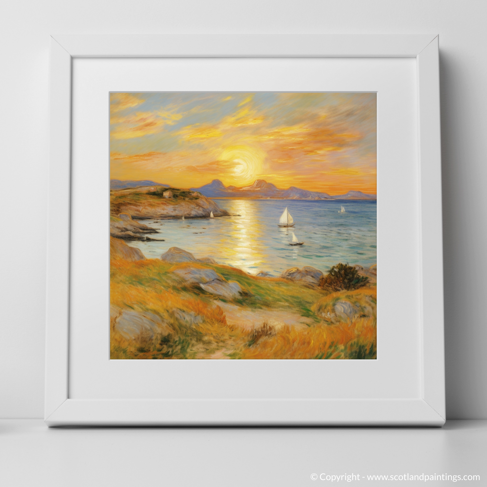 Bathed in the warm, luminescent glow of the setting sun, this captivating print captures the serene beauty of the Sound of Iona's coastline during the enchanting golden hour. Whisking viewers away to a tranquil Scottish cove, the piece masterfully embodies the essence of Impressionist art with its loose brushwork and vivid interplay of light and colour.
