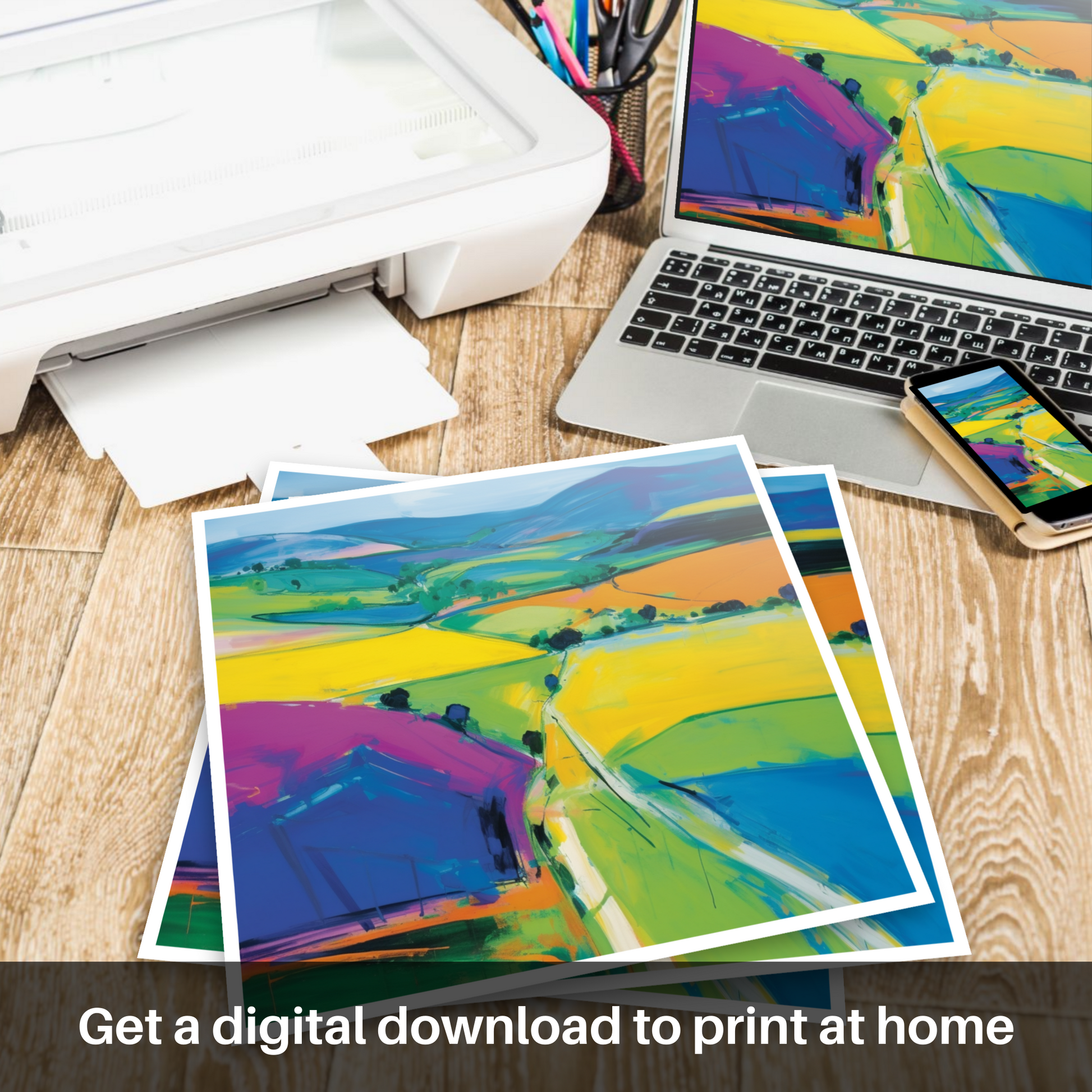 In this rendering, undulating fields of mustard yellows, deep purples, and rich greens stretch to meet a horizon of soft blue hills, crafting a rhythmic composition of land and sky. The artist's brushwork brings an almost tangible texture to the print, with swathes of colour that appear to merge and dance under an ever-changing light. The occasional silhouette of a distant tree line or the suggestion of a meandering path adds grounding elements to the abstraction, guiding the eye gently across the canvas.