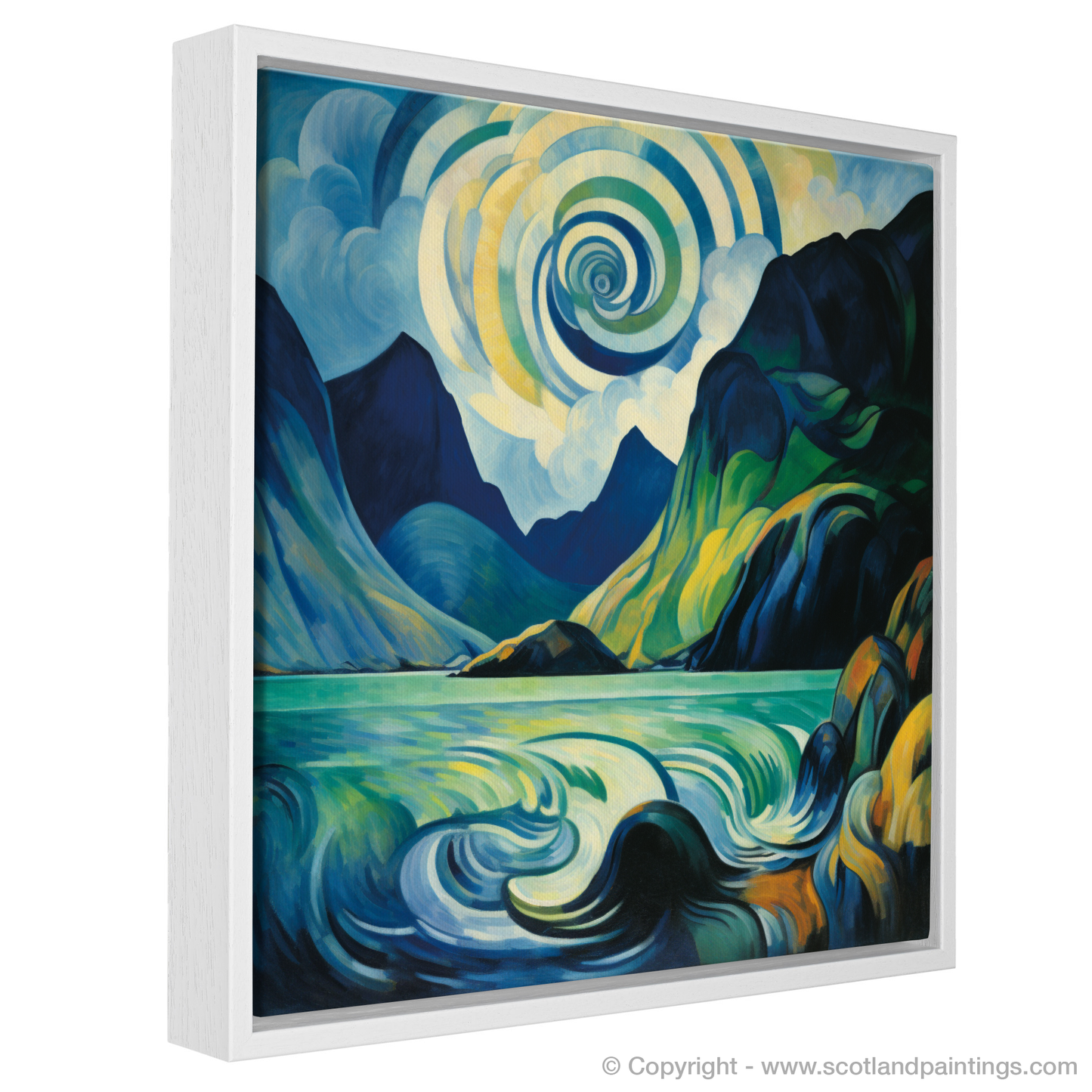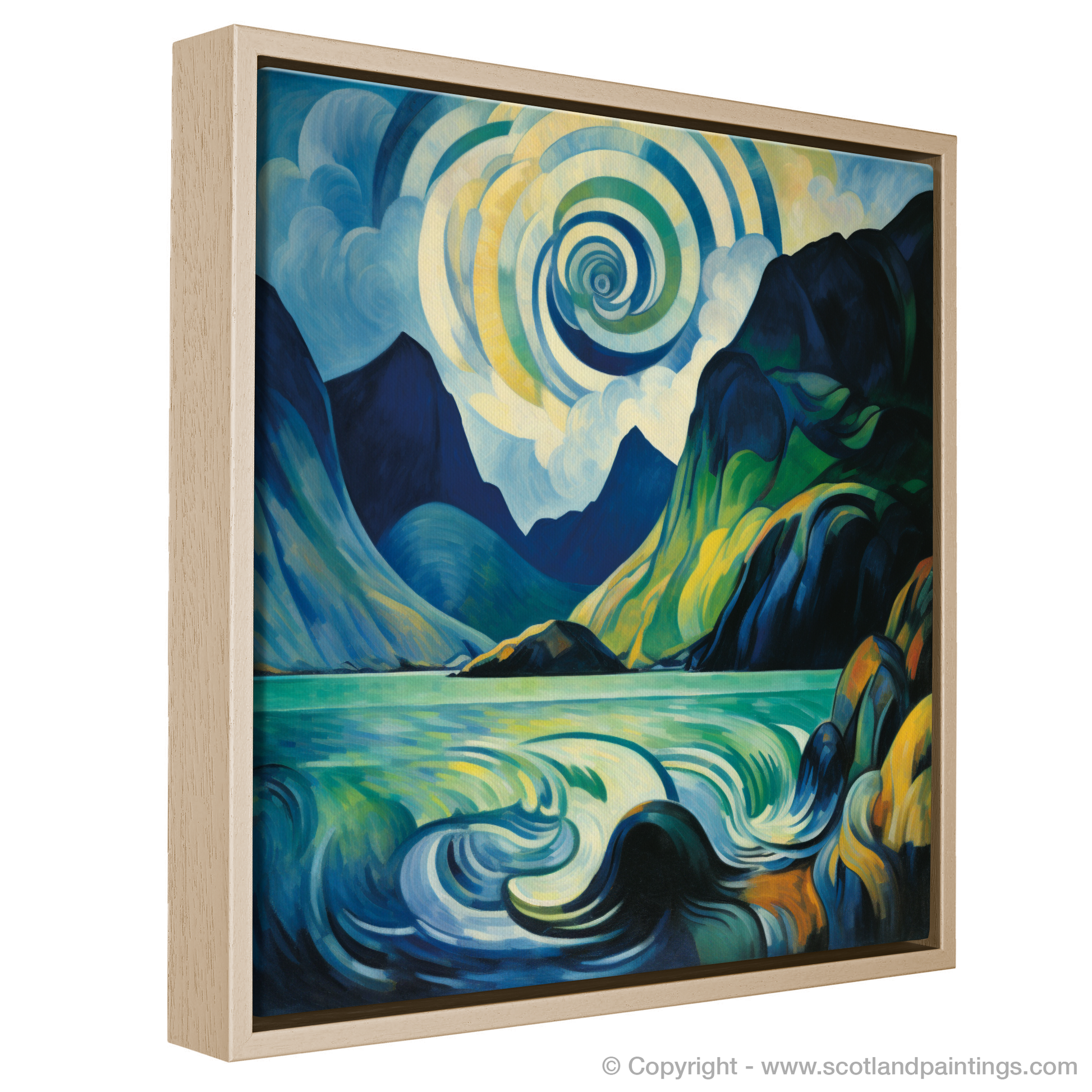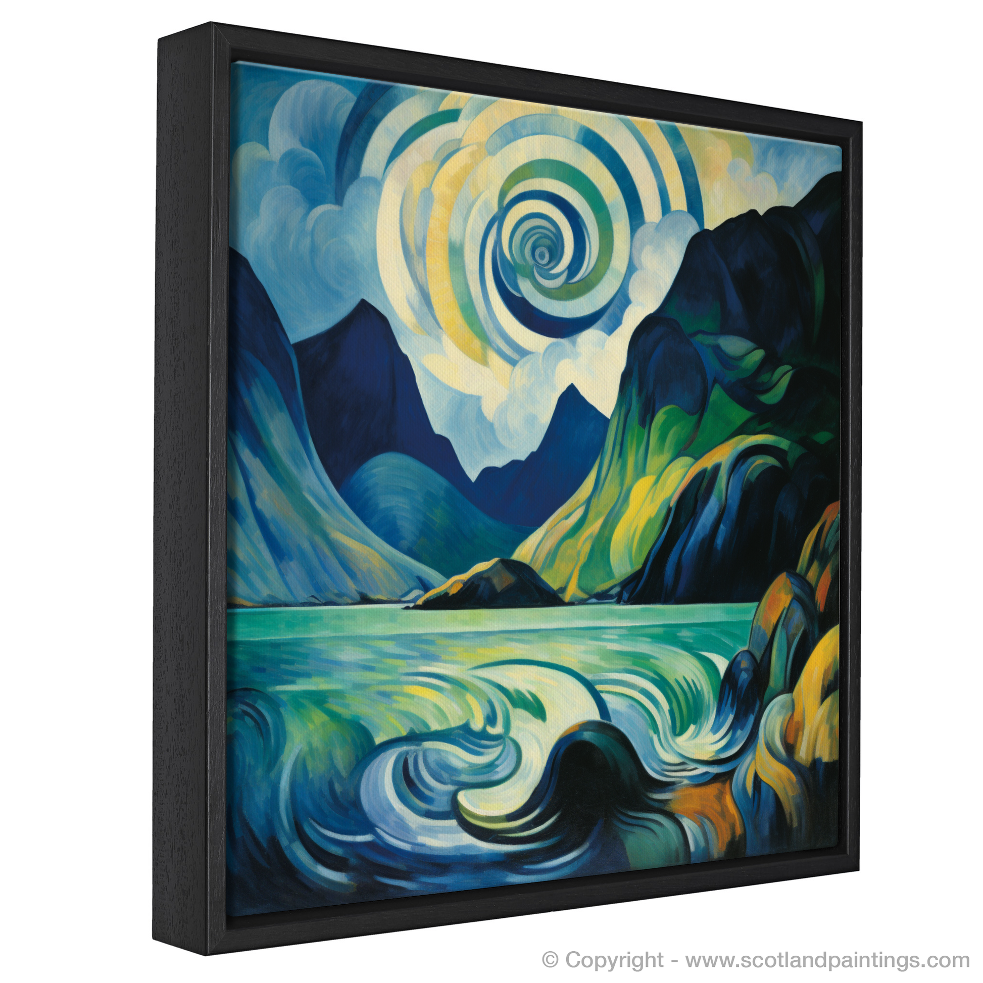 Let the wild and enigmatic essence of the Scottish Highlands envelop your space with this mesmerising abstract interpretation of Loch Coruisk, nestled within the rugged Isle of Skye. Vivid play of colours ranging from deep azure to earthly greens reflects the untamed beauty of this secluded cove.