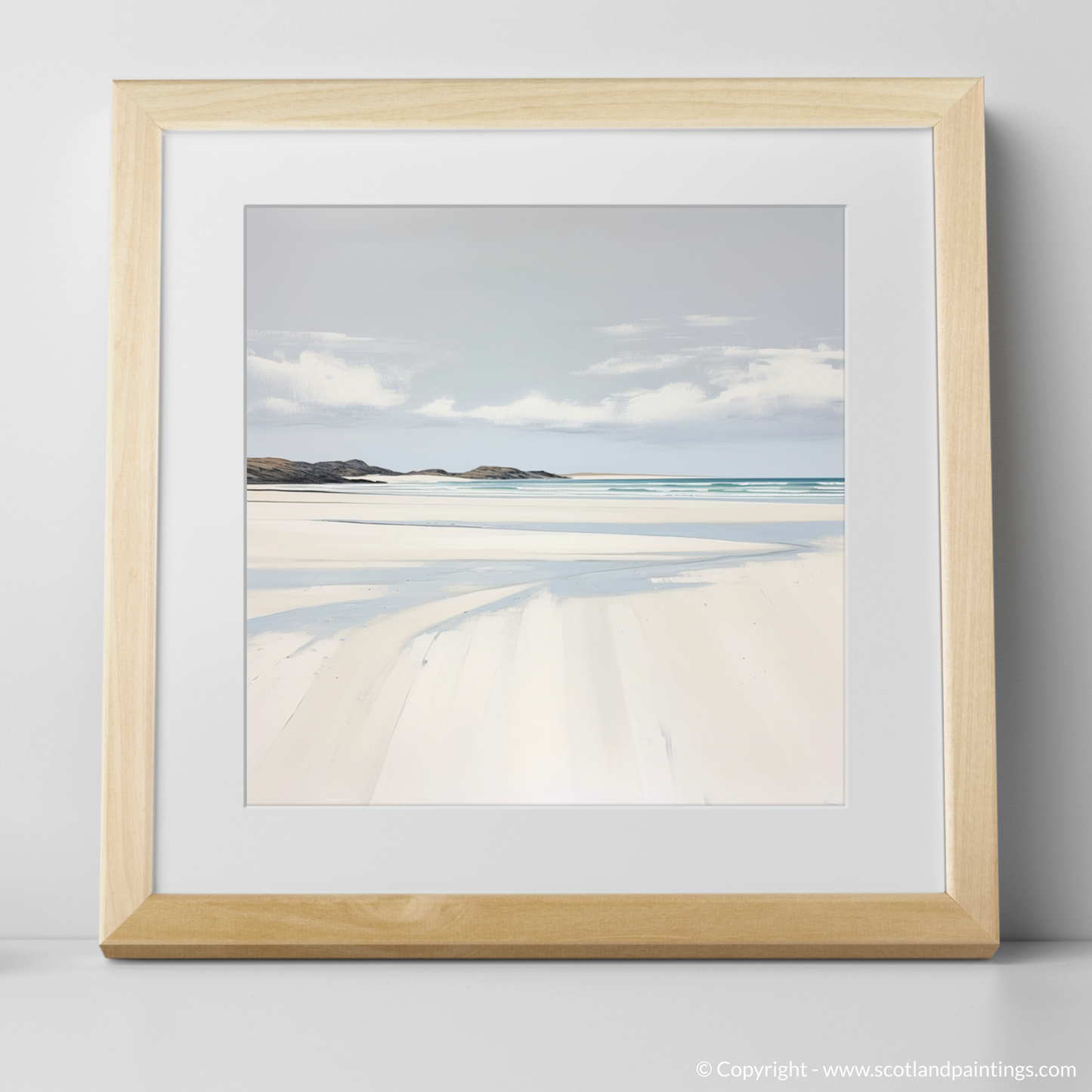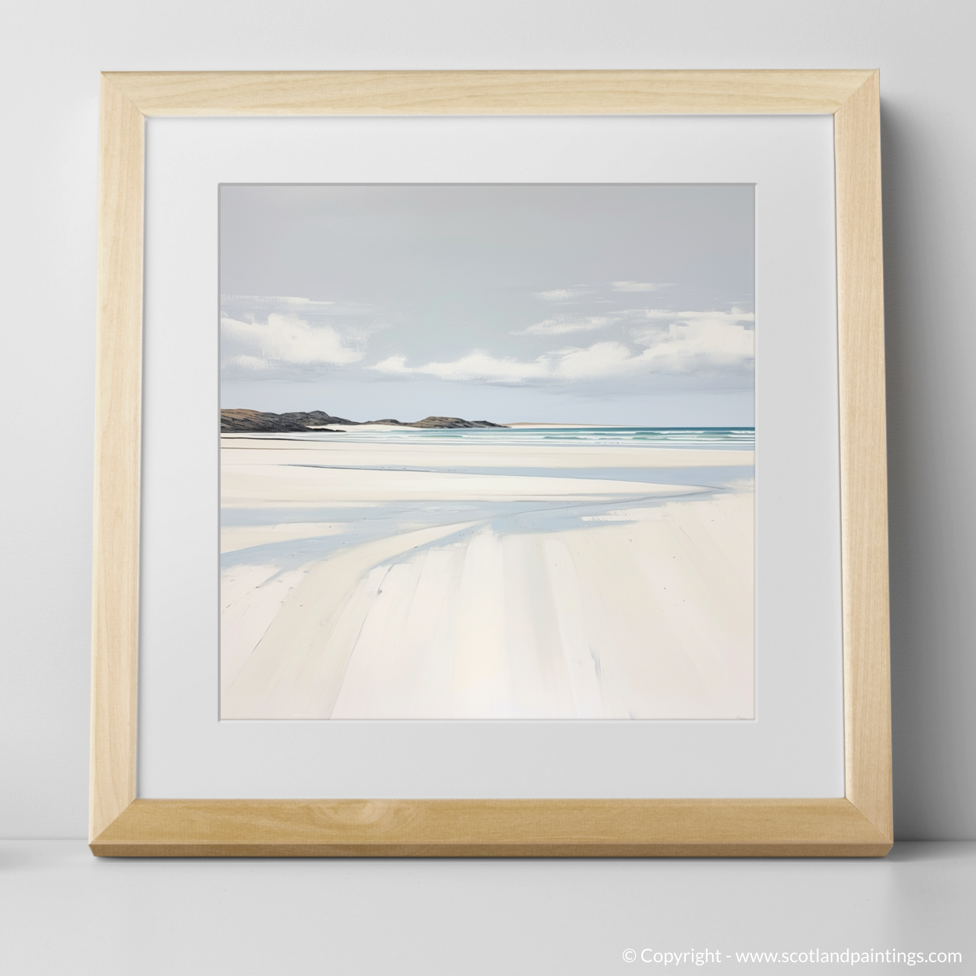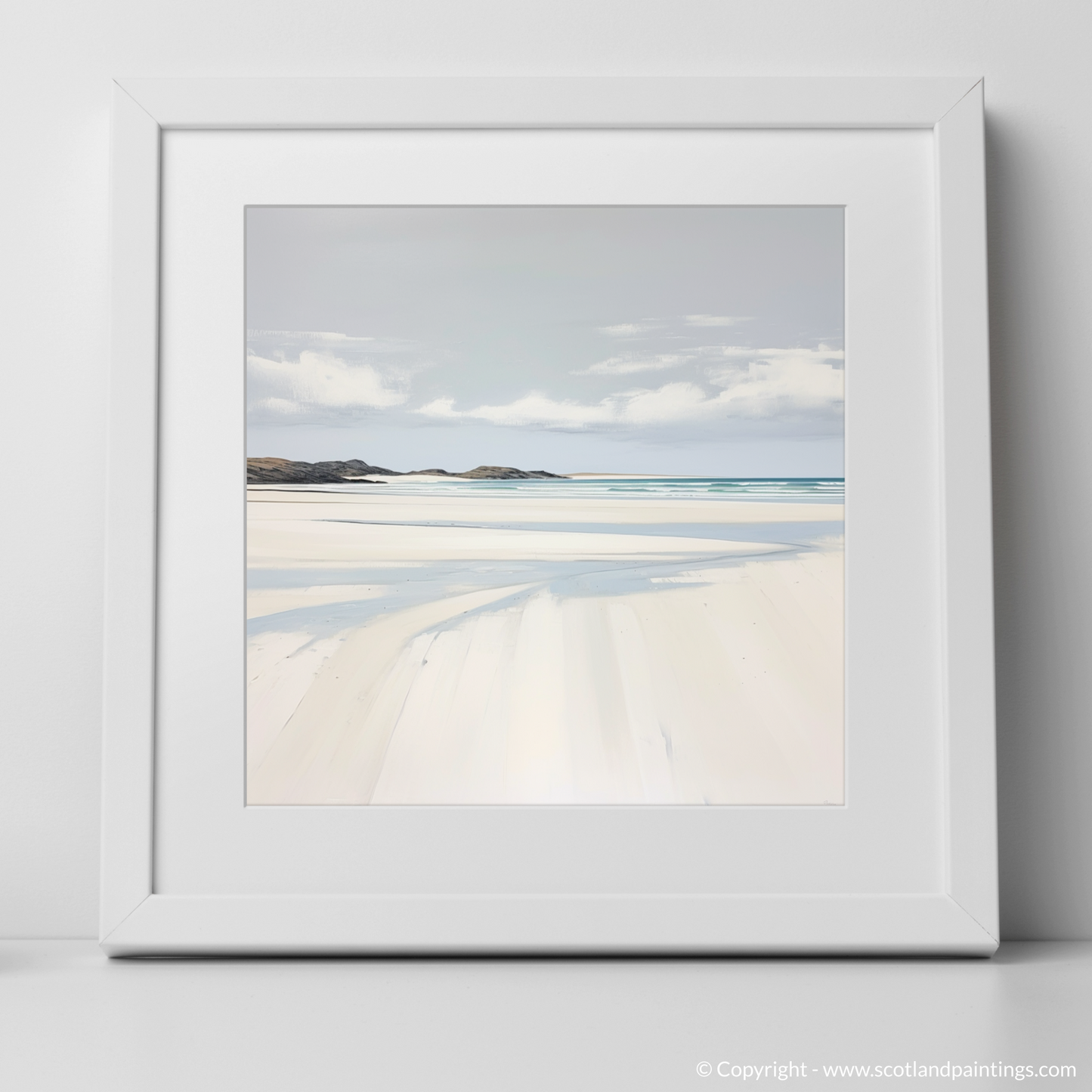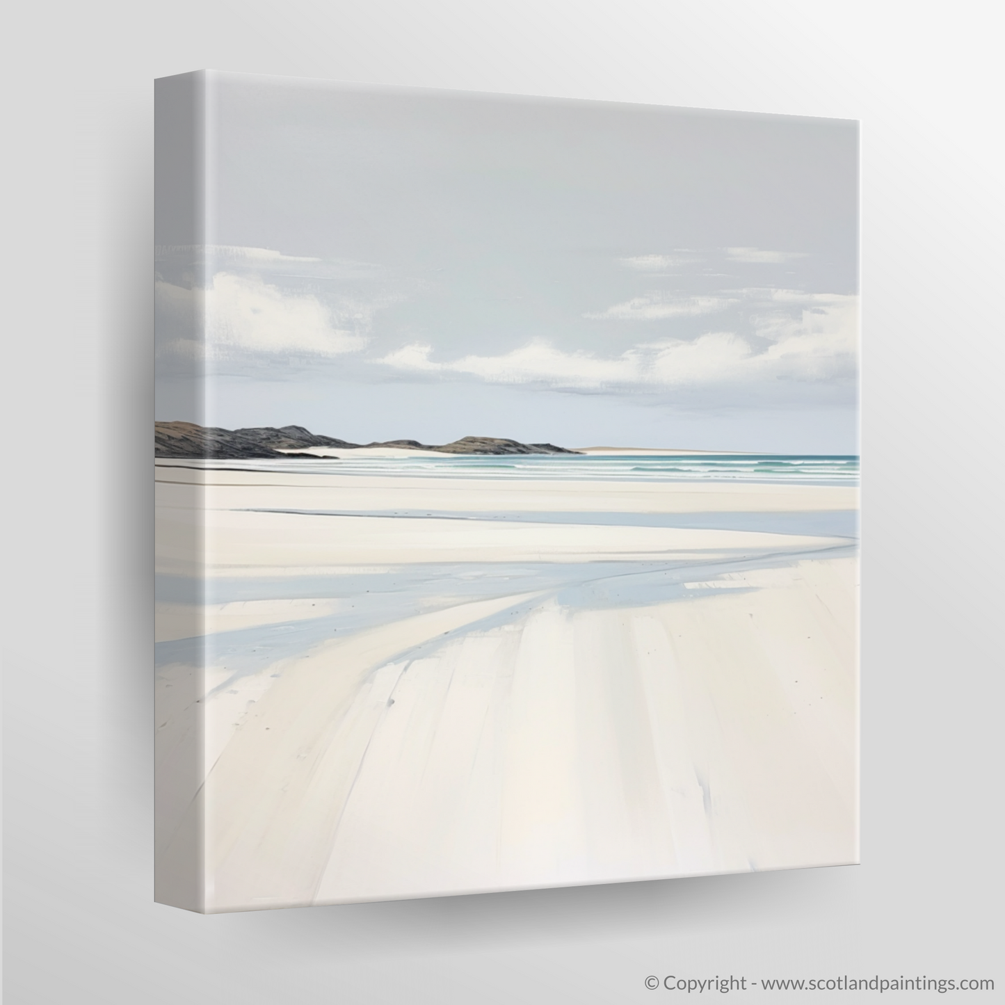 A harmonious palette of soft whites and creams dominates the composition, skillfully interspersed with accents of cool blues and gentle greys that reflect the tranquil waters of the North Atlantic. The wide expanse of the beach is textured with delicate, painterly strokes, suggesting the quiet movement of the sands as they surrender to the gentle kiss of the ocean's edge.