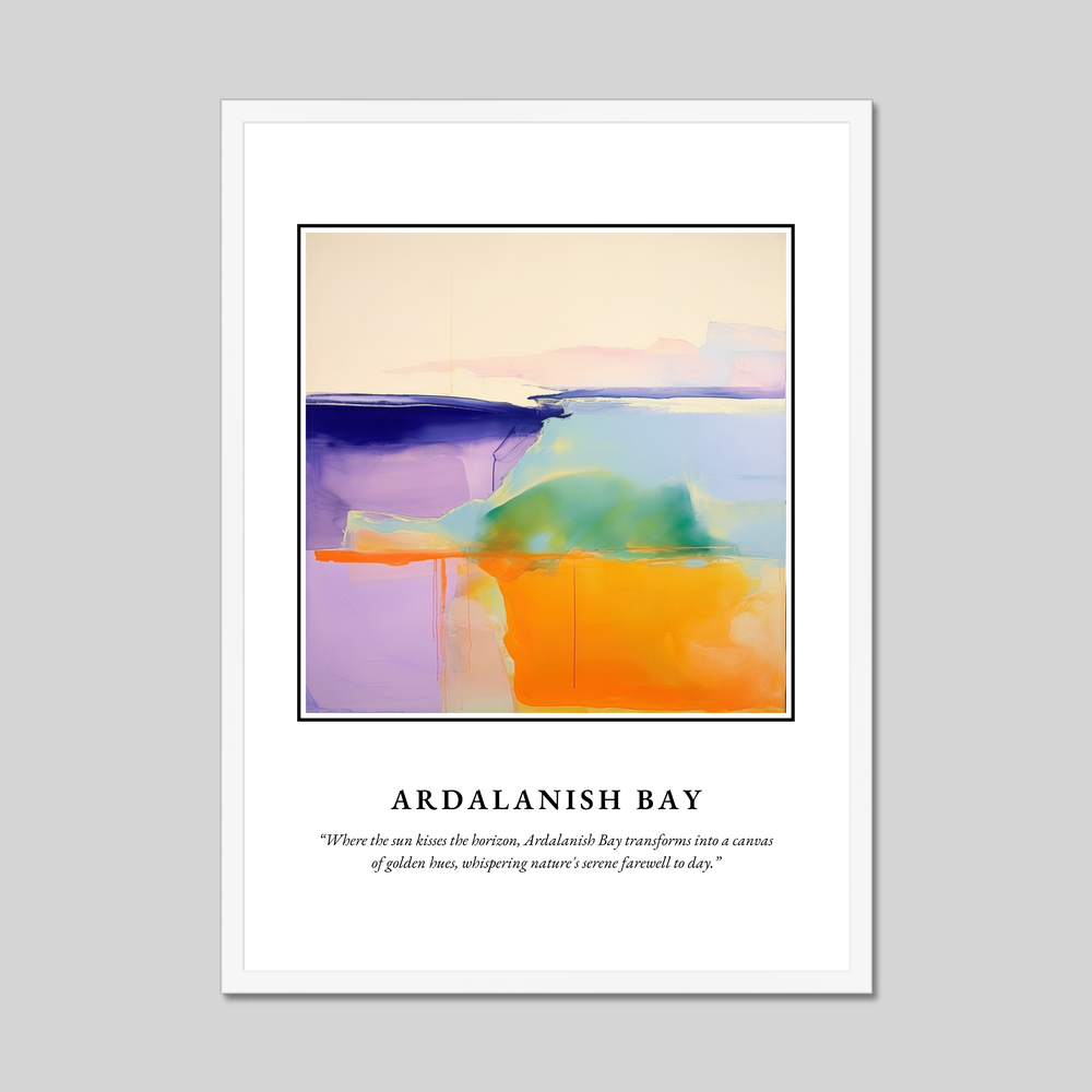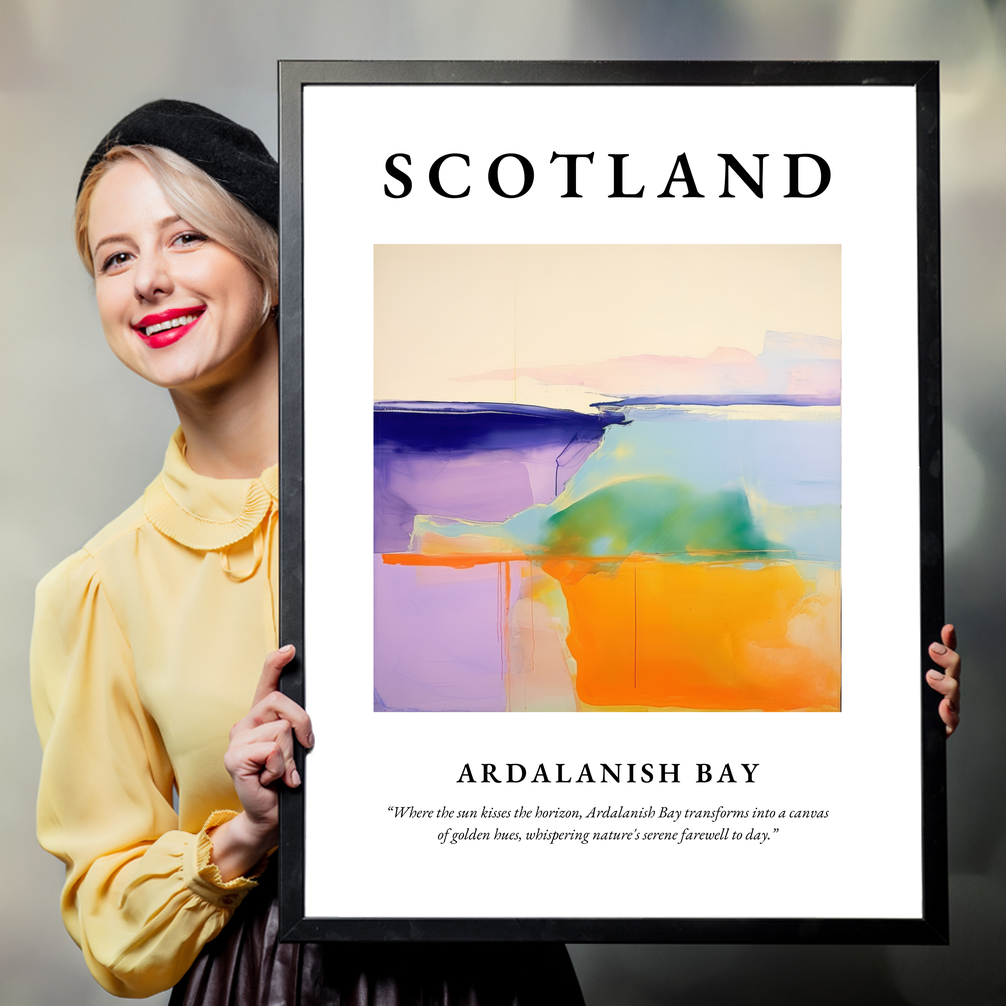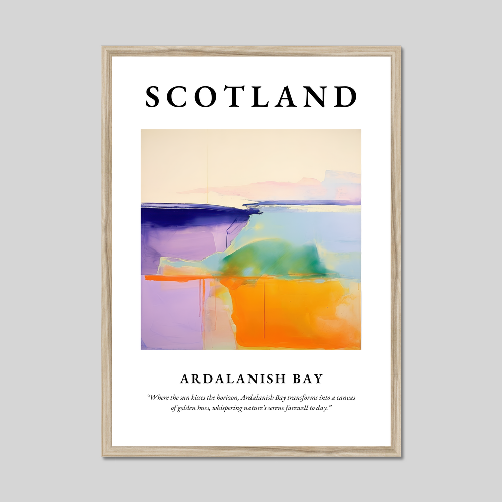 At the heart of this captivating poster is an abstract representation of Ardalanish Bay—a place where the land meets the sea in a powerful embrace. The word “SCOTLAND” sits boldly at the top, drawing you into the serene landscape below. The rich, vibrant hues of the painting evoke a sense of tranquillity and wonder, capturing the bay's transformation at sunset. Beneath the image, the quote, "Where the sun kisses the horizon, Ardalanish Bay transforms into a canvas of golden hues, whispering nature's serene farewell to day," perfectly encapsulates the painting’s essence.