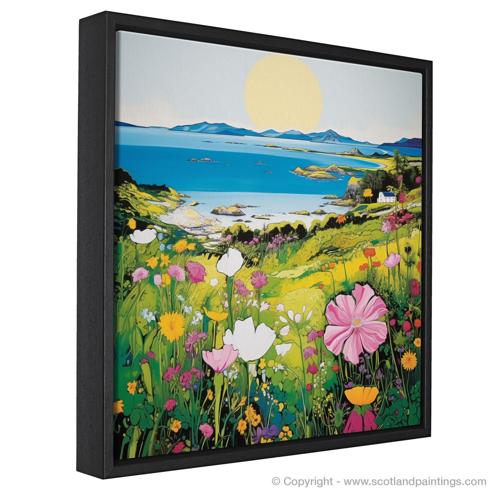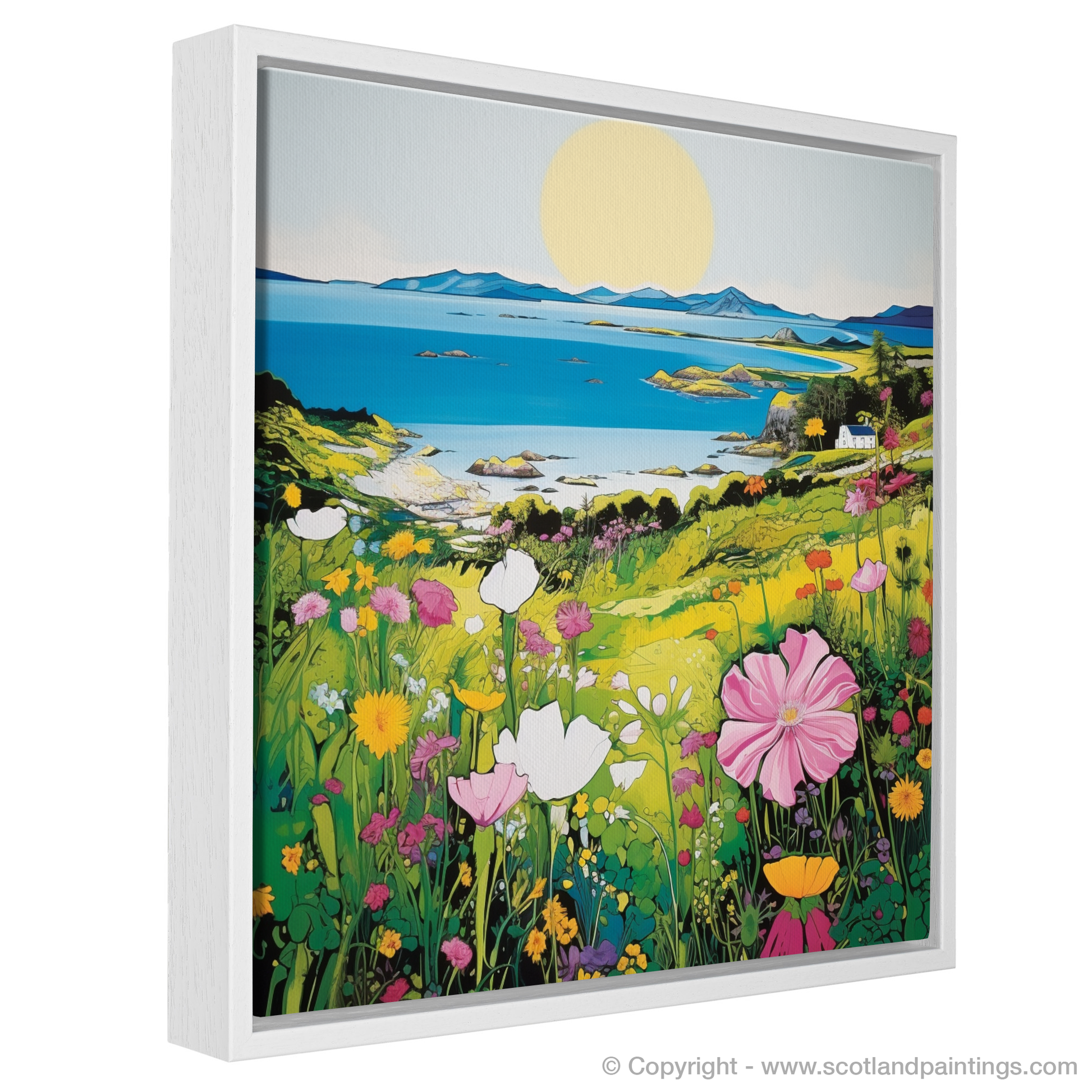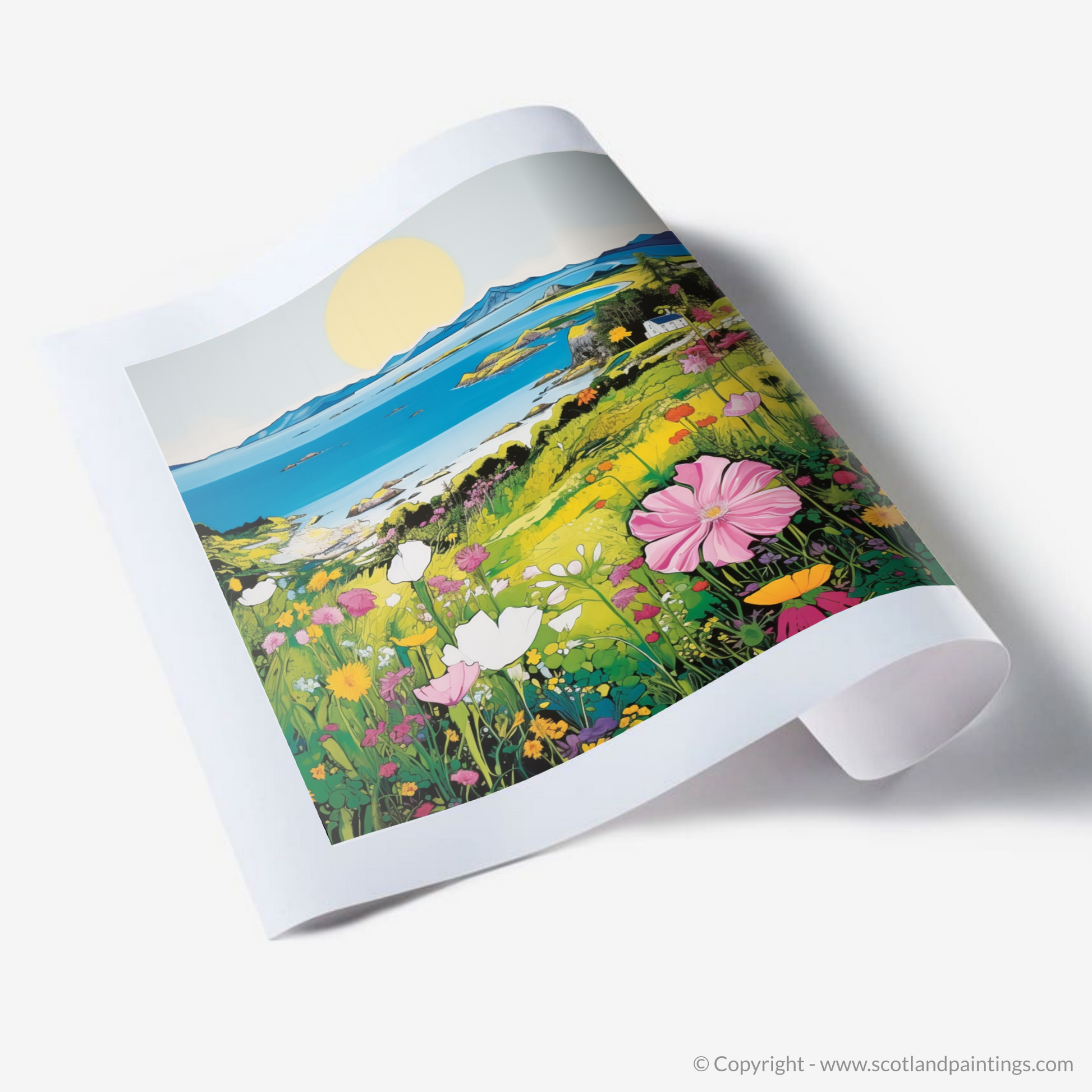 Foregrounded by a riot of flowers, each petal is a brushstroke of bold, saturated colour. From pure whites to deep pinks and sunny yellows, the wildflowers dance in an imaginary breeze, conveying the fresh, invigorating air one expects of the Inner Hebrides. The verdant fields cascade in shades of lime to darker greens, a testament to the fertile lands of Gigha.