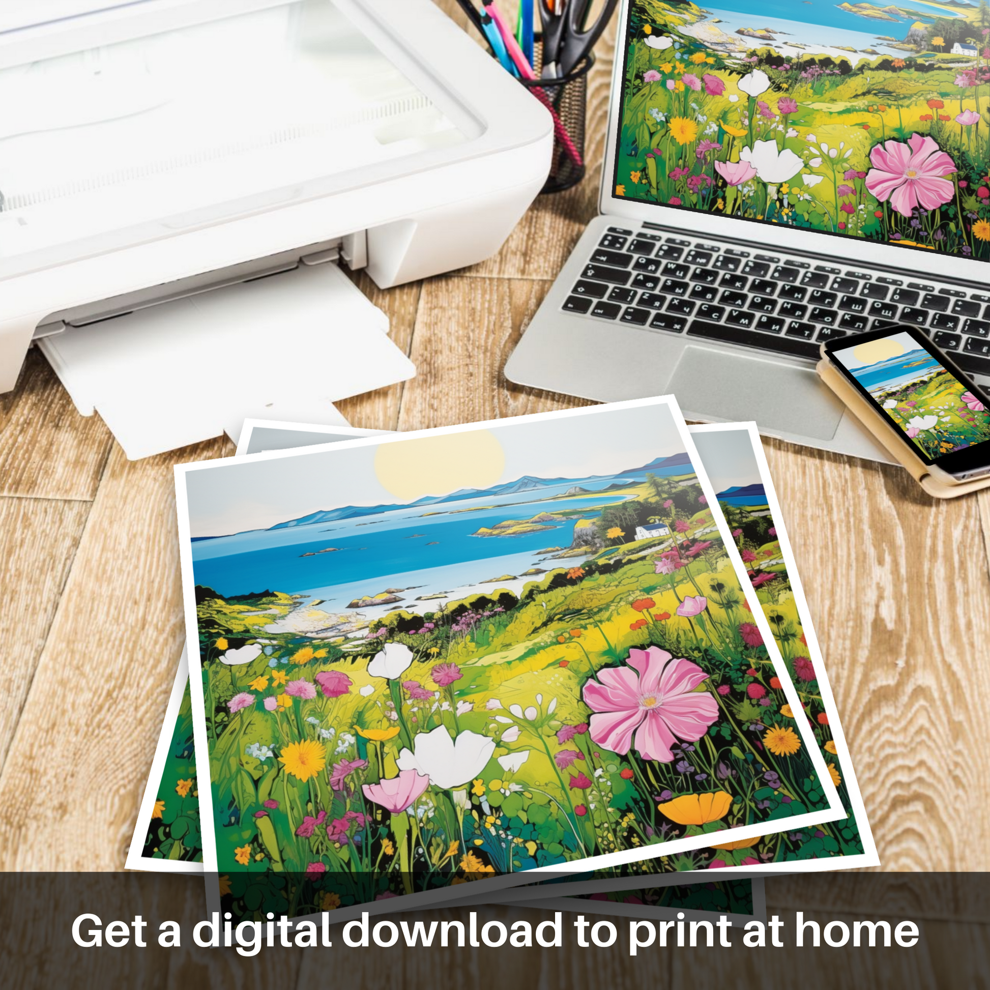 This print, a vivid homage to the Scottish isles’ unspoiled charm, is a statement piece, an invitation to let imagination sail to the enchanting shores of the Isle of Gigha. It is an artistic celebration suitable for any lover of Scotland's natural grandeur, and a brilliant addition to any space that covets a burst of colour and a touch of Scottish island serenity.