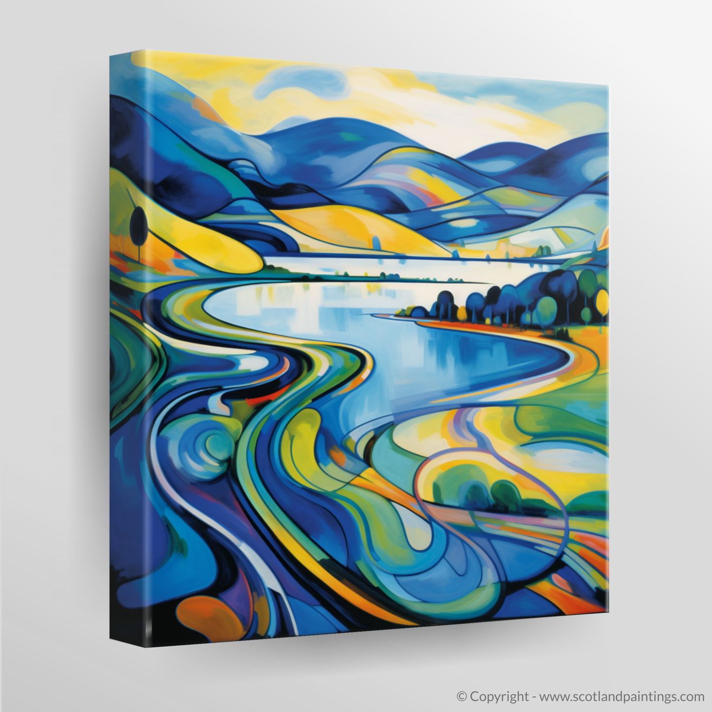 The artwork boasts an array of sweeping curves and undulating lines that mirror the fluidity of Loch Tay's waters, while the layered strokes of blues and greens reflect the depth and variability of the loch. Vivid yellows and warming oranges suggest the touch of sunlight over the hills and dales, contrasting with the soothing purples and deep blues that conjure images of the surrounding mountainous terrain.