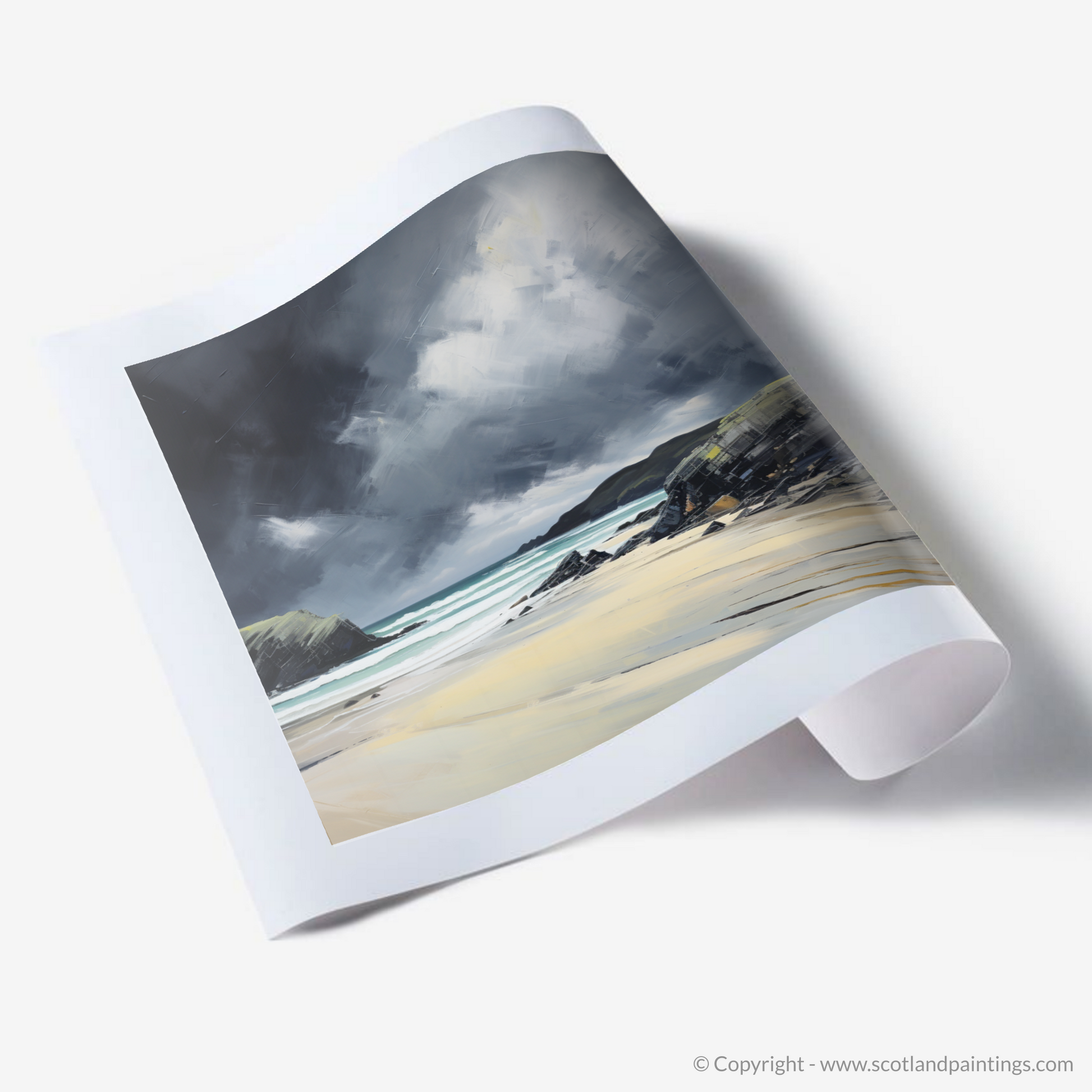 Capture the tempestuous beauty of Scotland's coast with this evocative print, portraying the unmistakable shores of Durness Beach under a dramatic stormy sky. With bold, sweeping brushstrokes, this piece encapsulates a moment where the tumult of the heavens seems to dance with the wild, untamed waters of the North Sea.