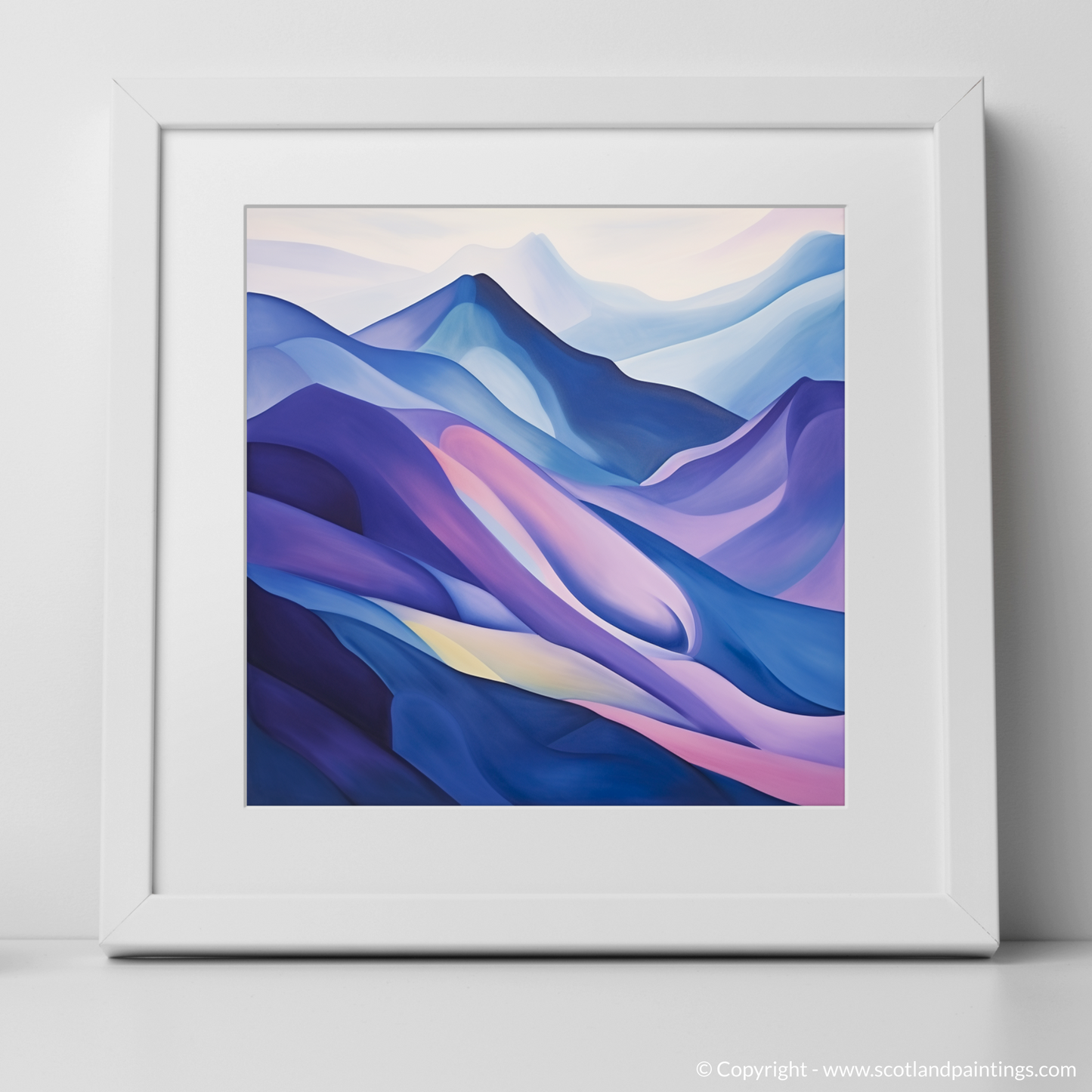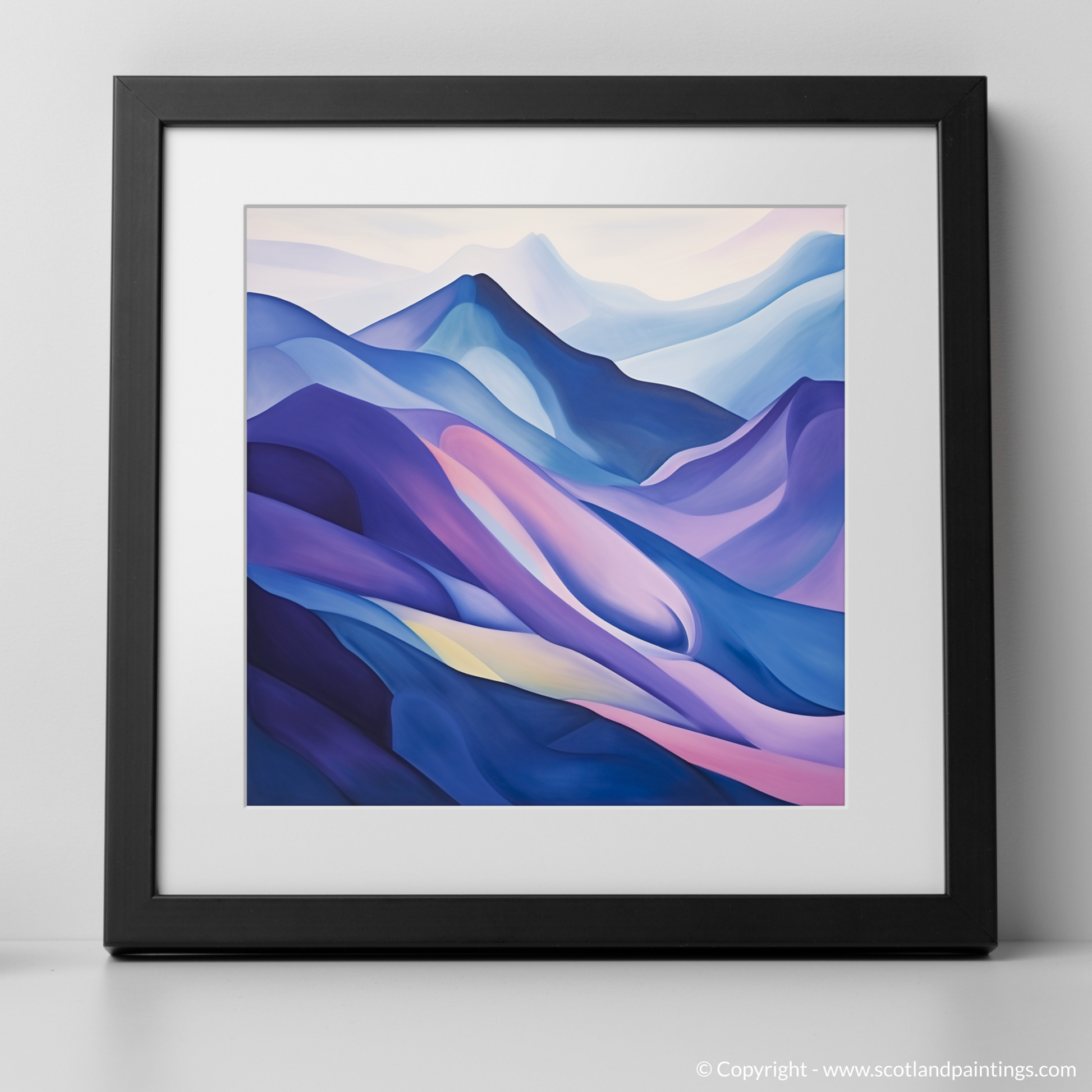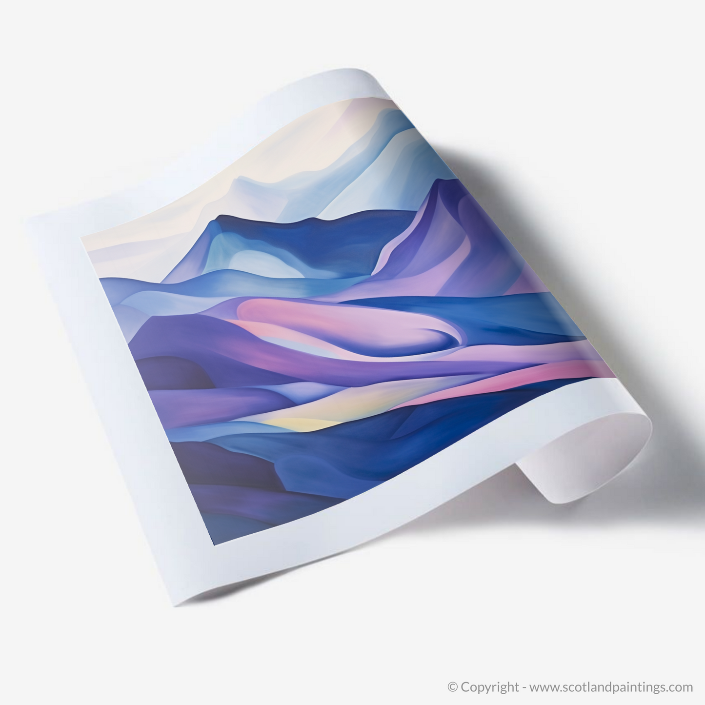 Step into a realm where the contours of nature meld into a fluid dreamscape, as this abstract interpretation of Stob Coire Sgreamhach invites viewers to reimagine the rugged beauty of the Scottish Highlands. Cascading shapes, reminiscent of the mountain's majestic stature, flow across the canvas in a symphony of blues and purples, punctuated with whispers of pink and gentle creams.