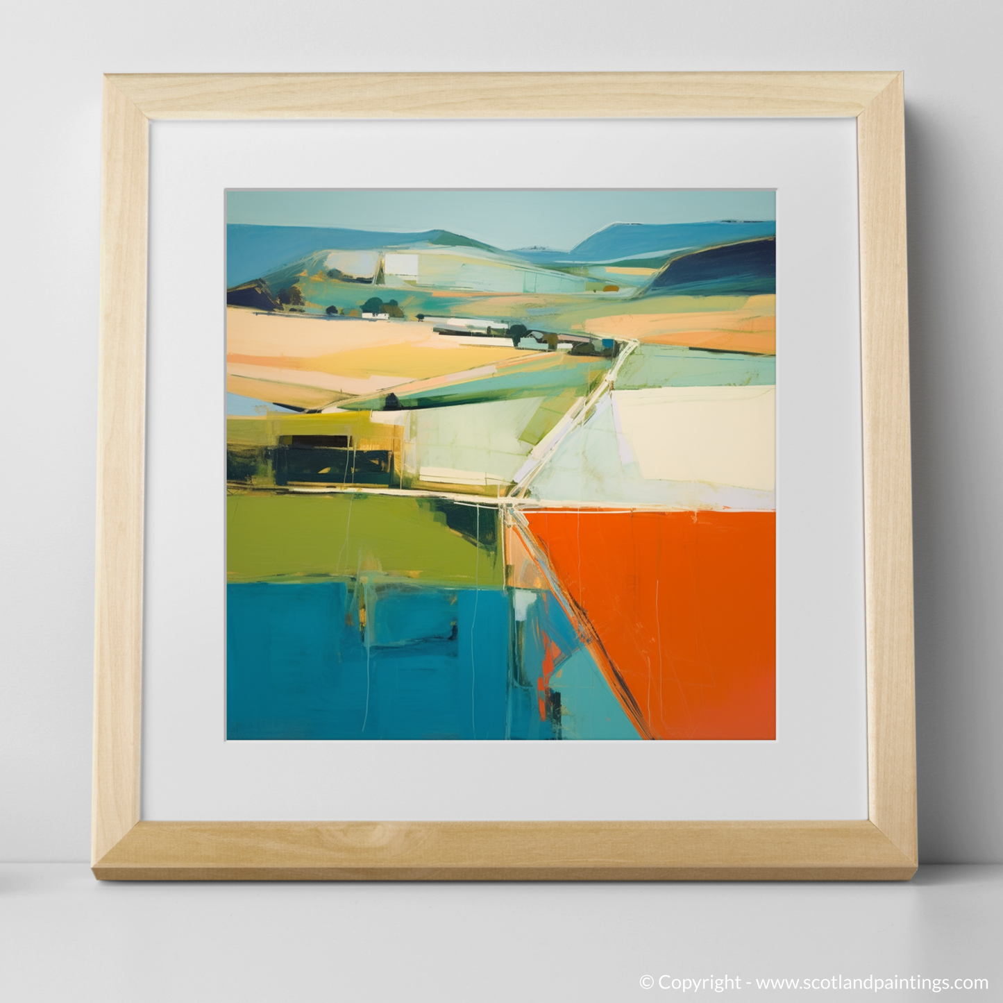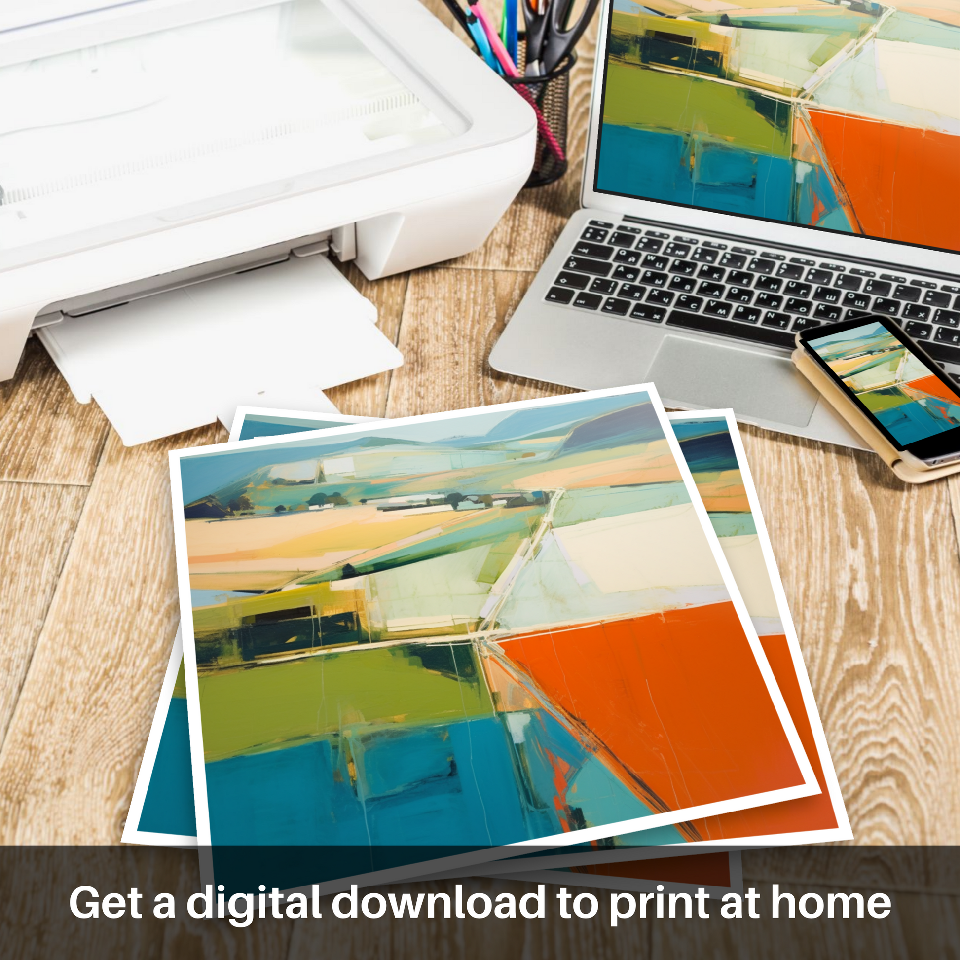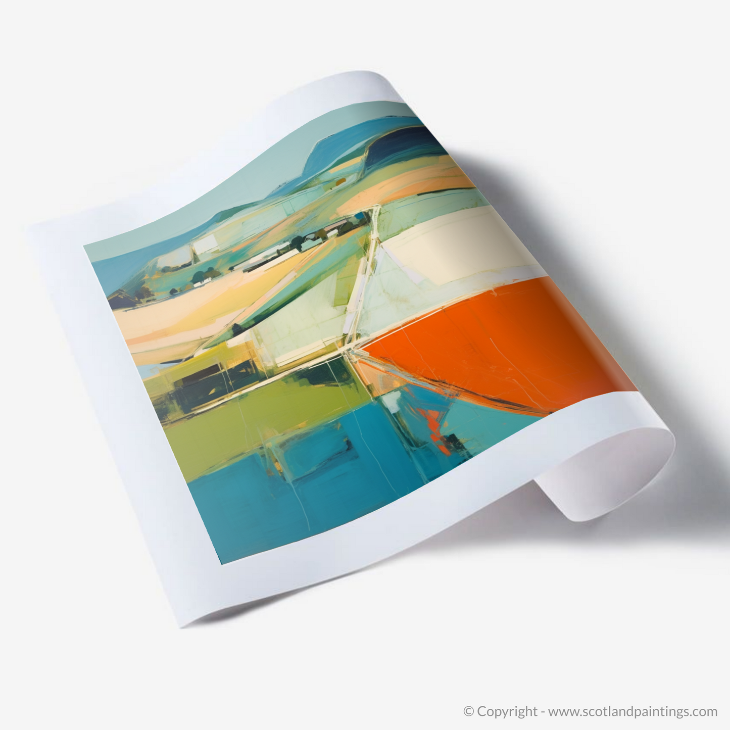This exquisite print celebrates the essence of Glen Roy, known for its tranquil beauty and geological wonder, through an abstract impressionistic lens. Bold, unbridled lines intersect with fluid colour planes to evoke the undulating hills and valleys. A harmonious palette of azure and cobalt blues reflects the depth of the Scottish lochs, while the earthy ochres and muted greens mirror the rolling heather-covered terrain.