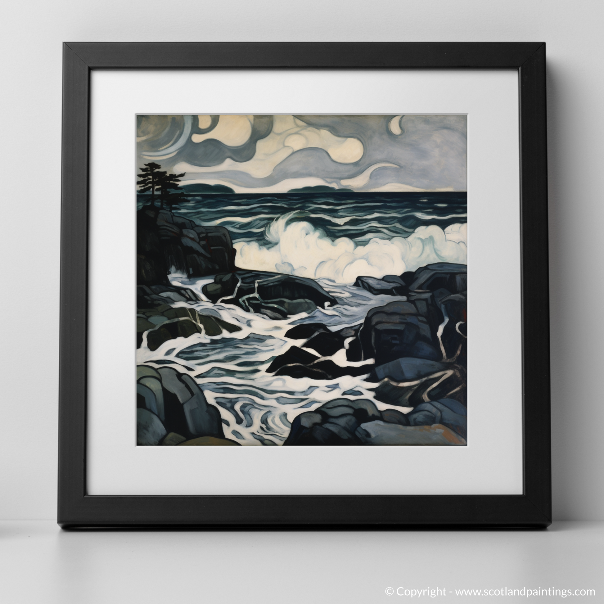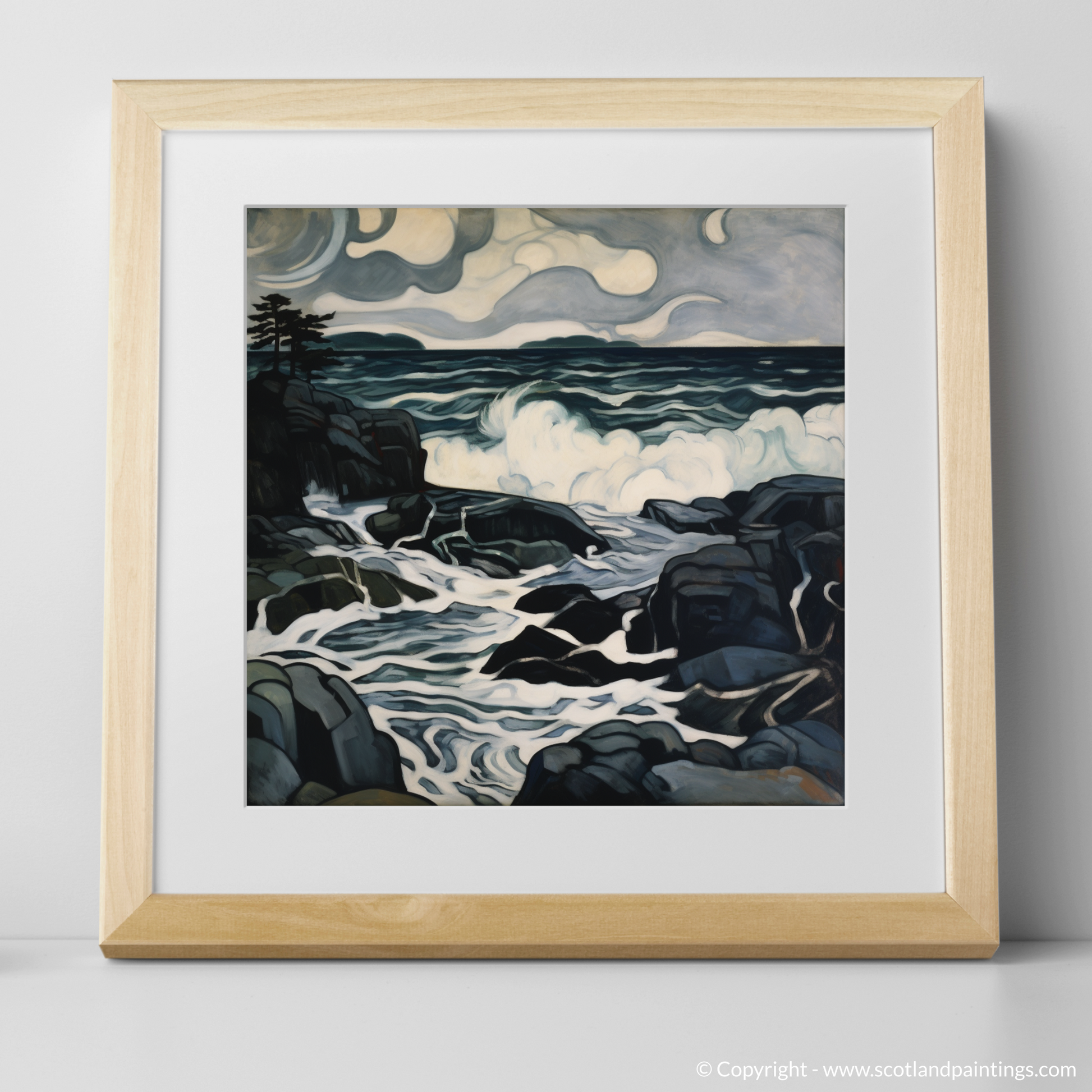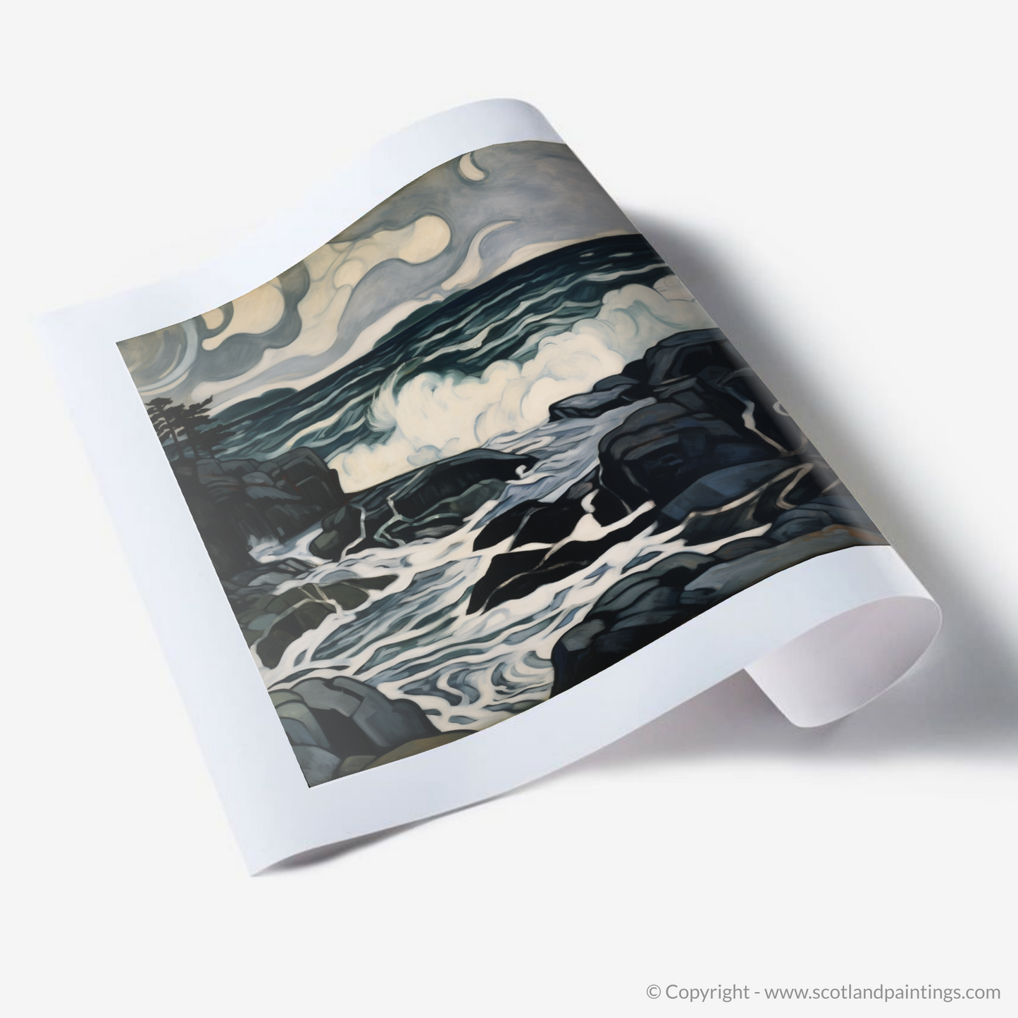 The storm-swept sky swirls with a palette of deep, moody greys and muted blues, embodying the quintessential turmoil of Scottish coastal weather. It unfurls in expressive, almost sentient, cloud formations that suggest movement and a brooding energy, anticipating the unleashing of nature's power.