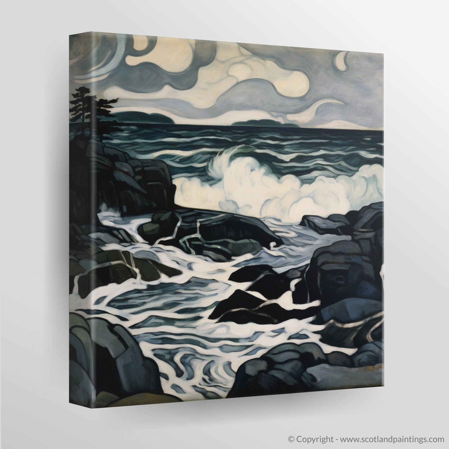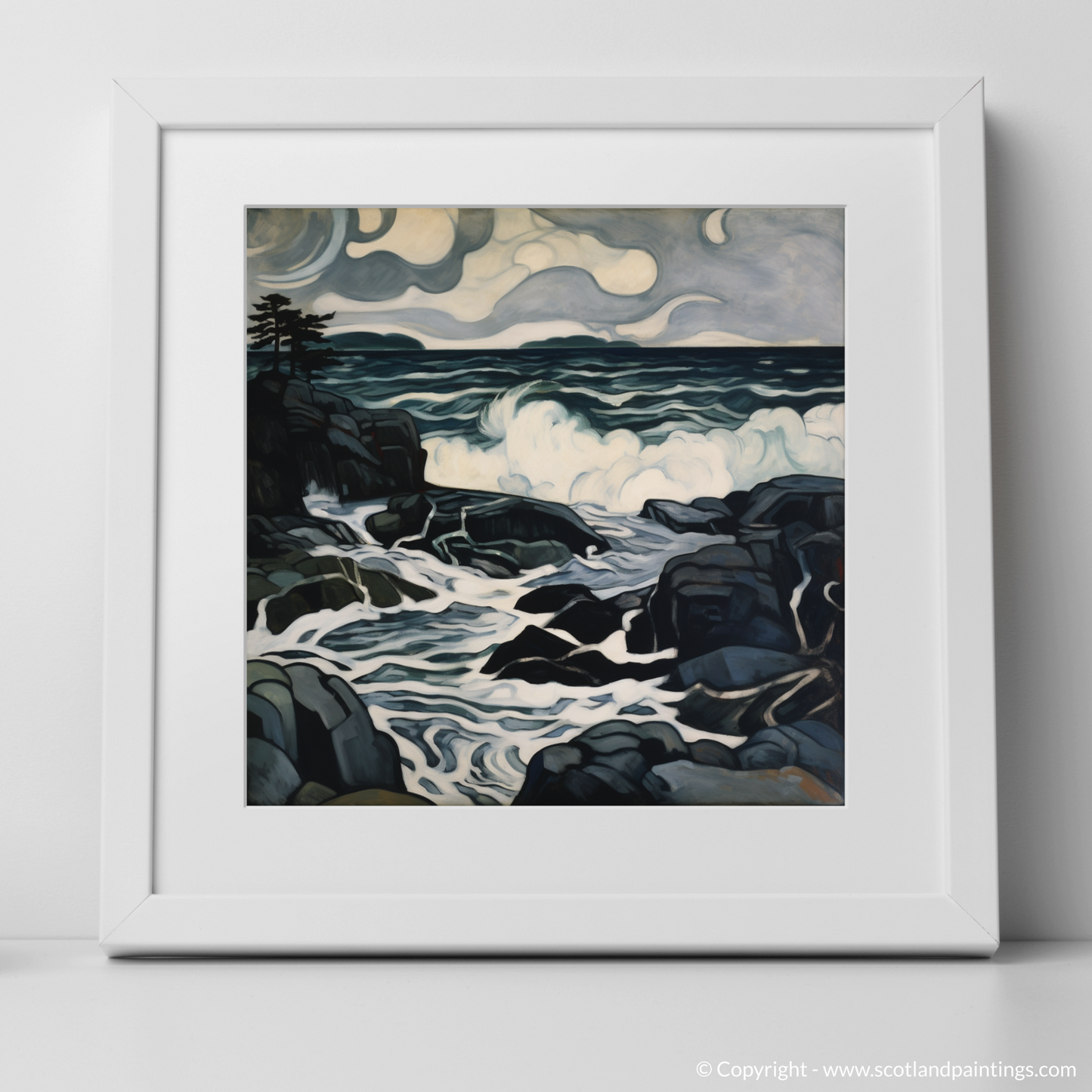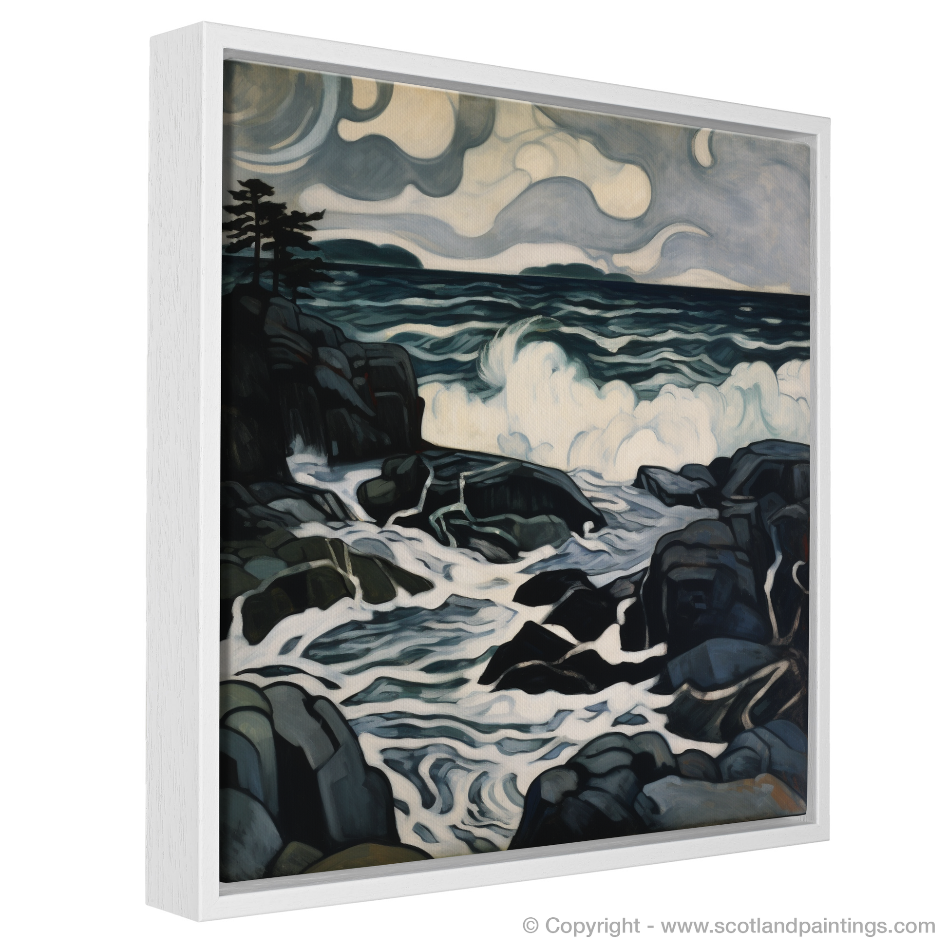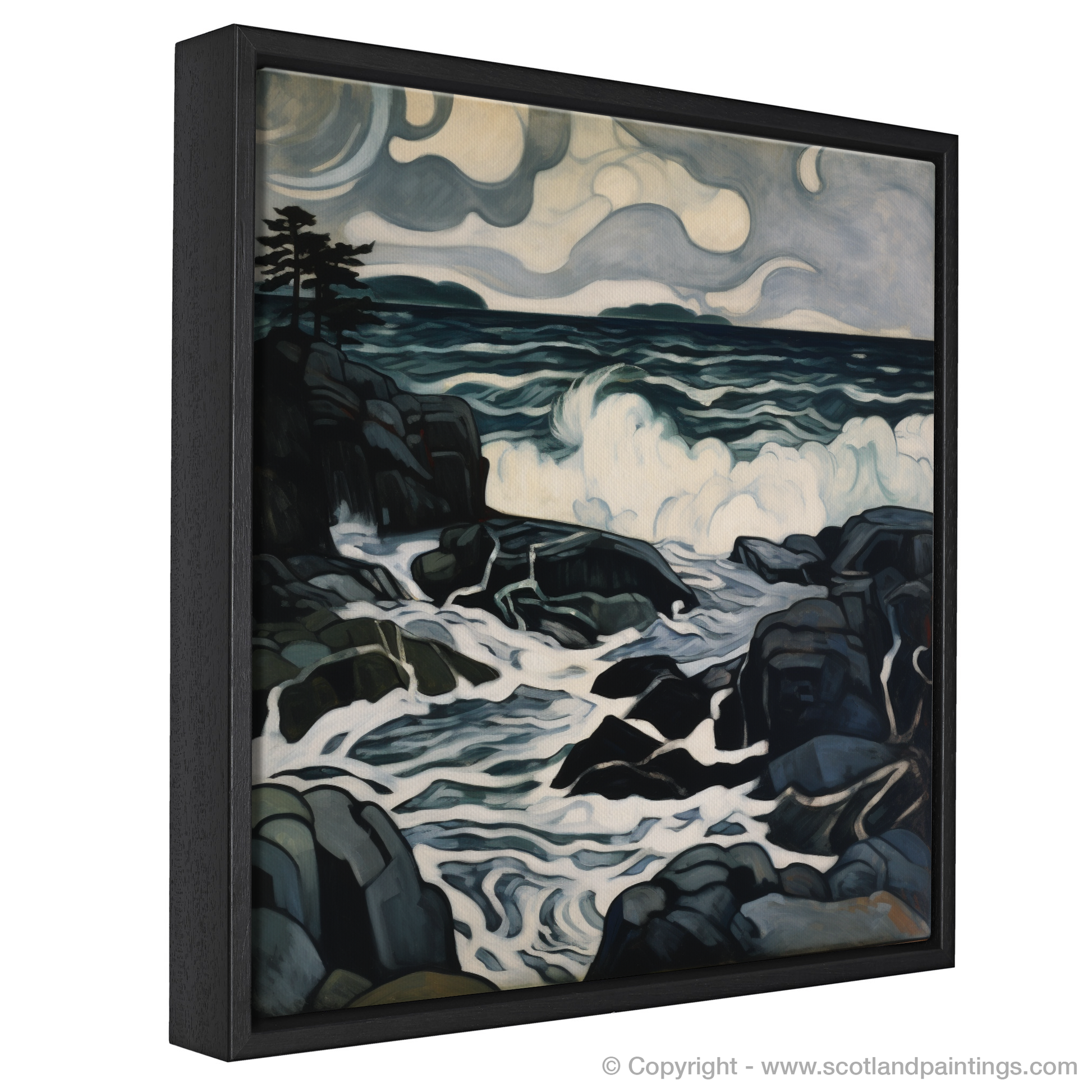 The storm-swept sky swirls with a palette of deep, moody greys and muted blues, embodying the quintessential turmoil of Scottish coastal weather. It unfurls in expressive, almost sentient, cloud formations that suggest movement and a brooding energy, anticipating the unleashing of nature's power.