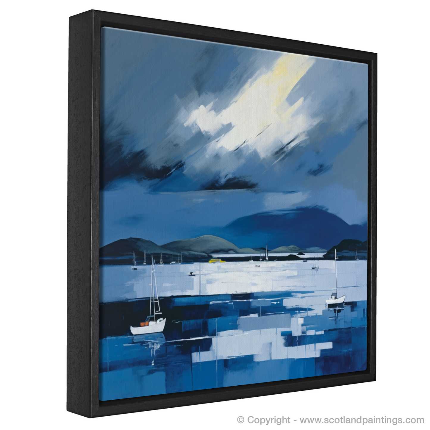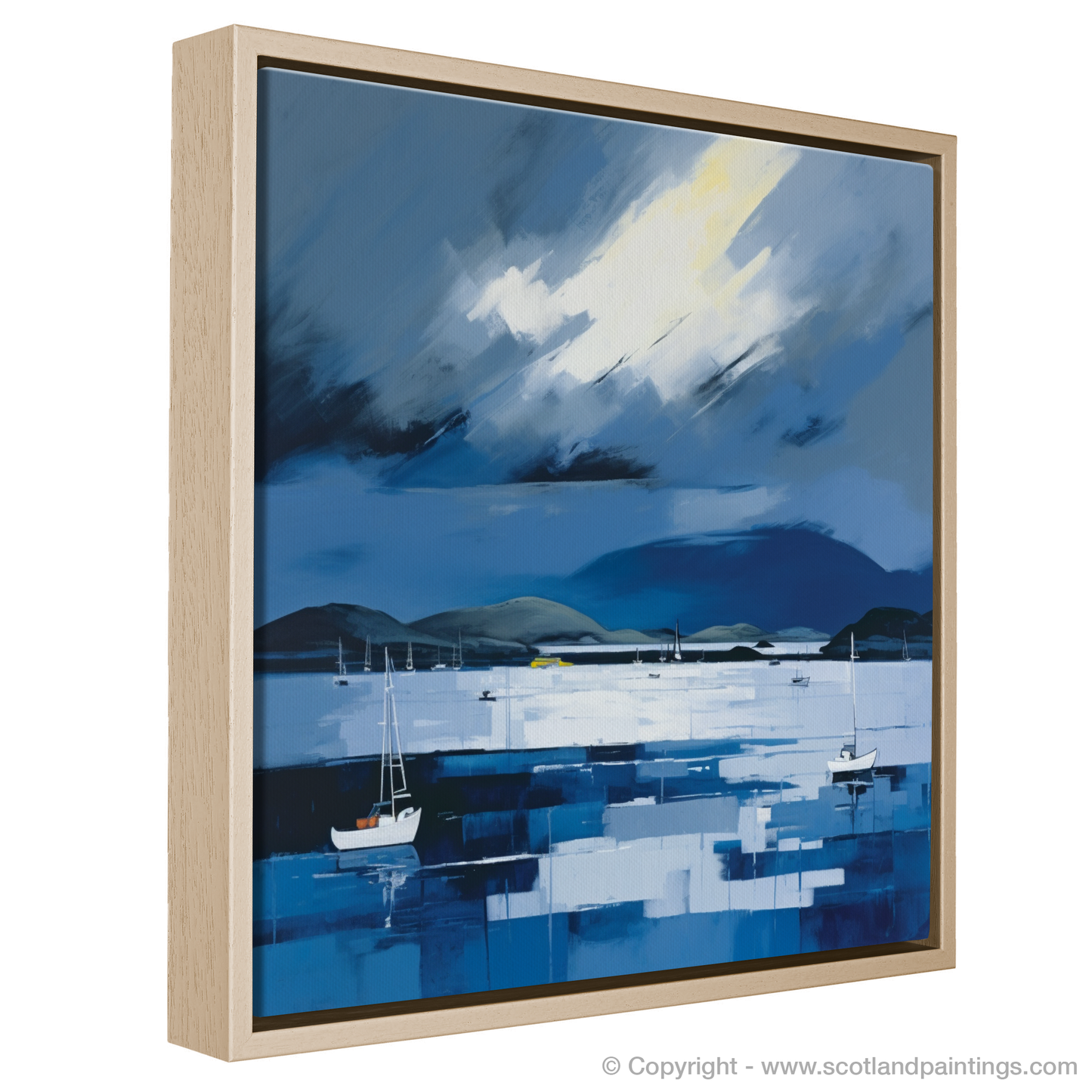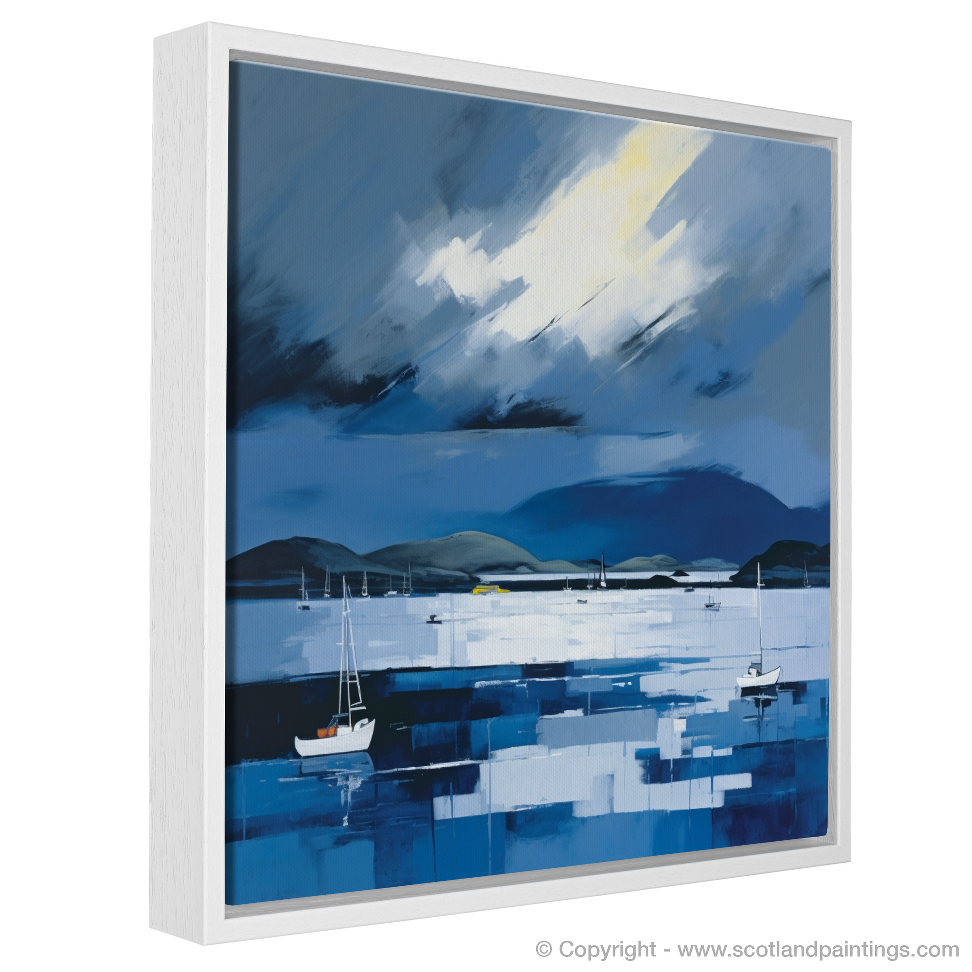 Silhouettes of boats punctuate the horizon, their simplicity adding a tranquil stillness against the dynamic backdrop of the sky which swirls with motion, painted in broad, impressionistic strokes. A sweeping beam of light cutting through the storm hints at the fleeting Scottish light, providing a celestial focal point in the turmoil of grey and white.