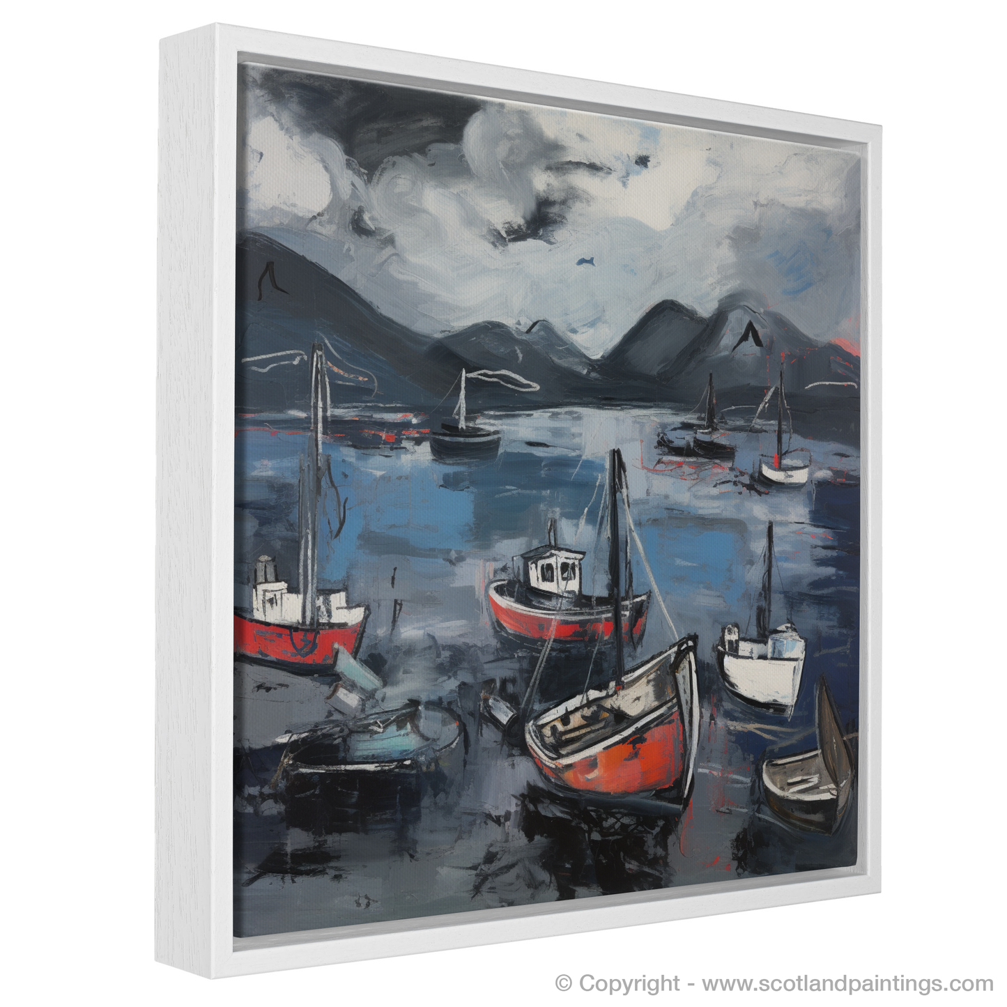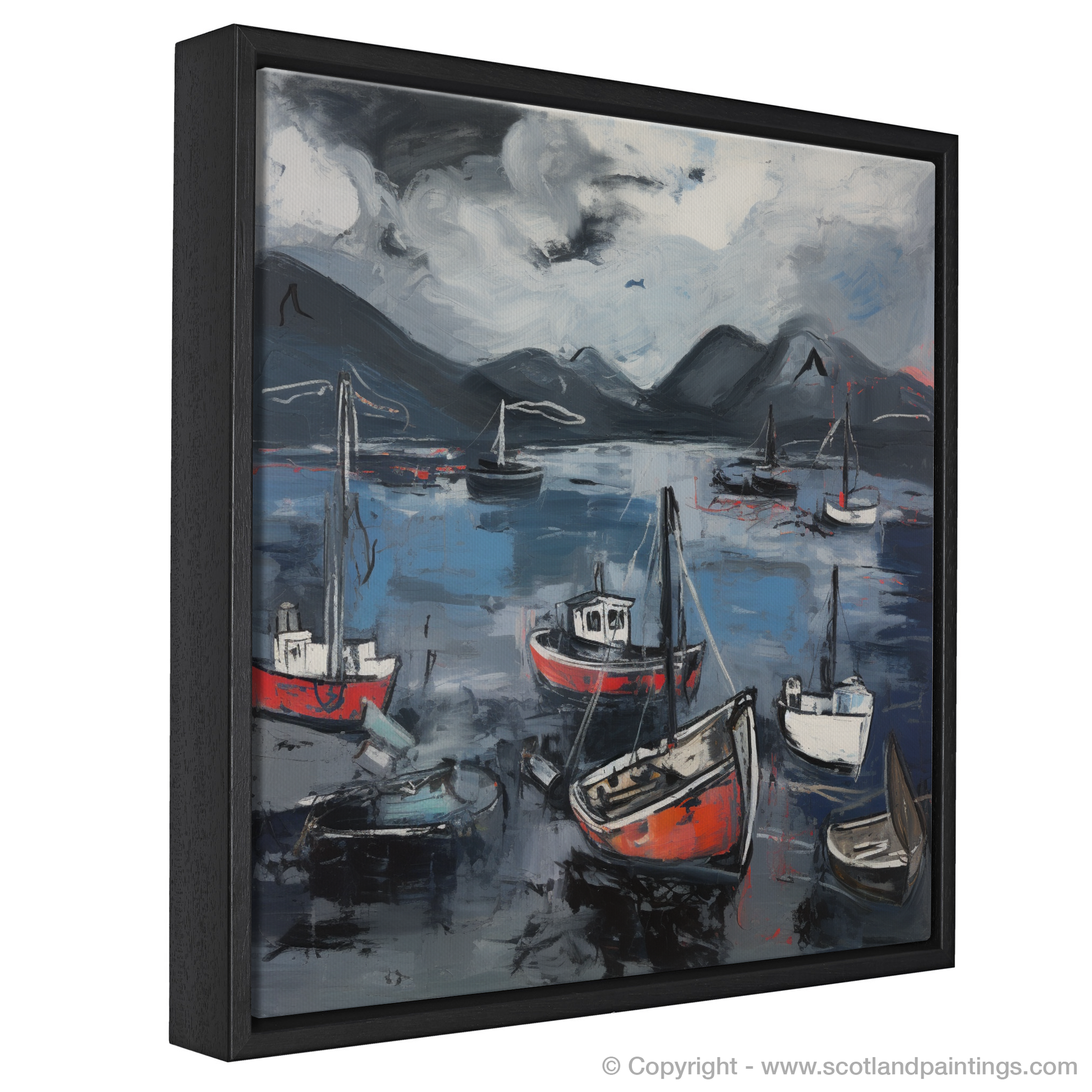 The composition's bold, expressive brushwork imbues it with a dynamic energy, while splashes of crimson and white enliven the scene, hinting at the presence of life and the enduring spirit of the harbour against nature's caprices. Every stroke on this print is a testament to the passionate embrace of Abstract Expressionism, capturing the raw emotion of the Scottish coastal scene.