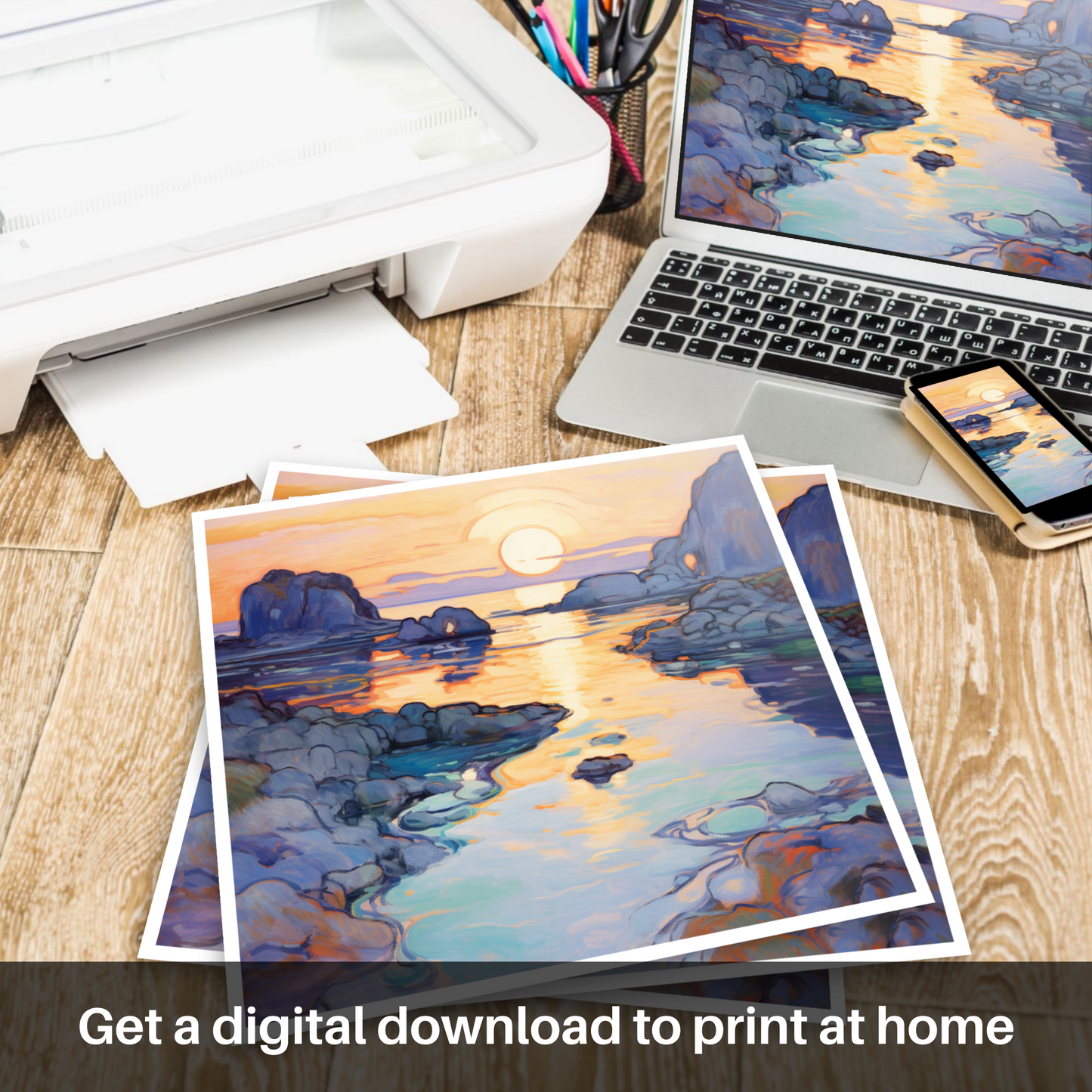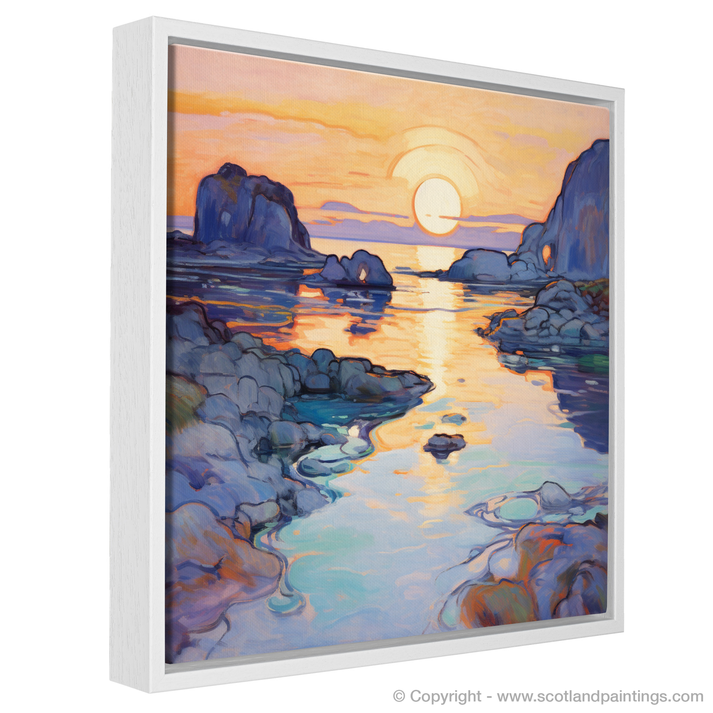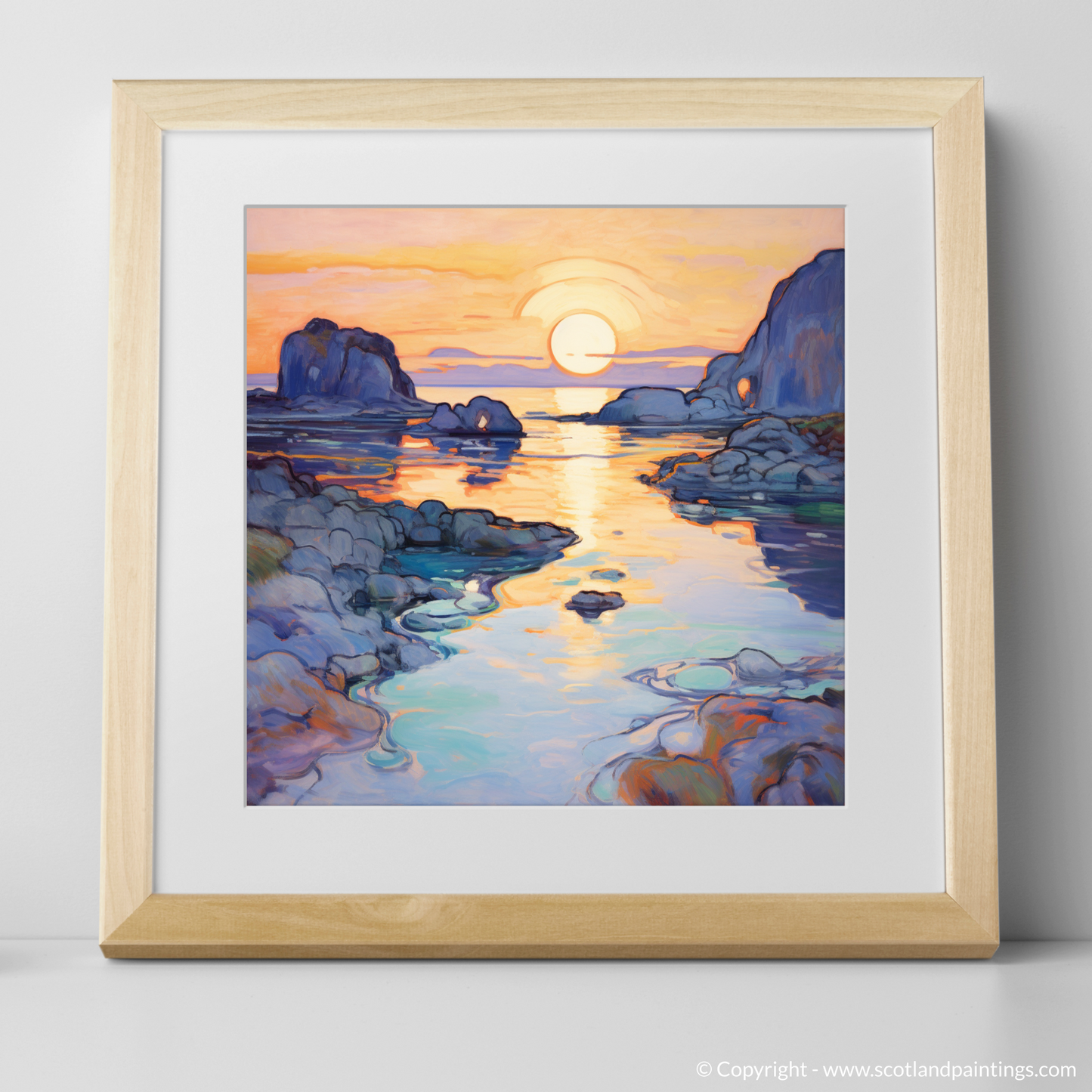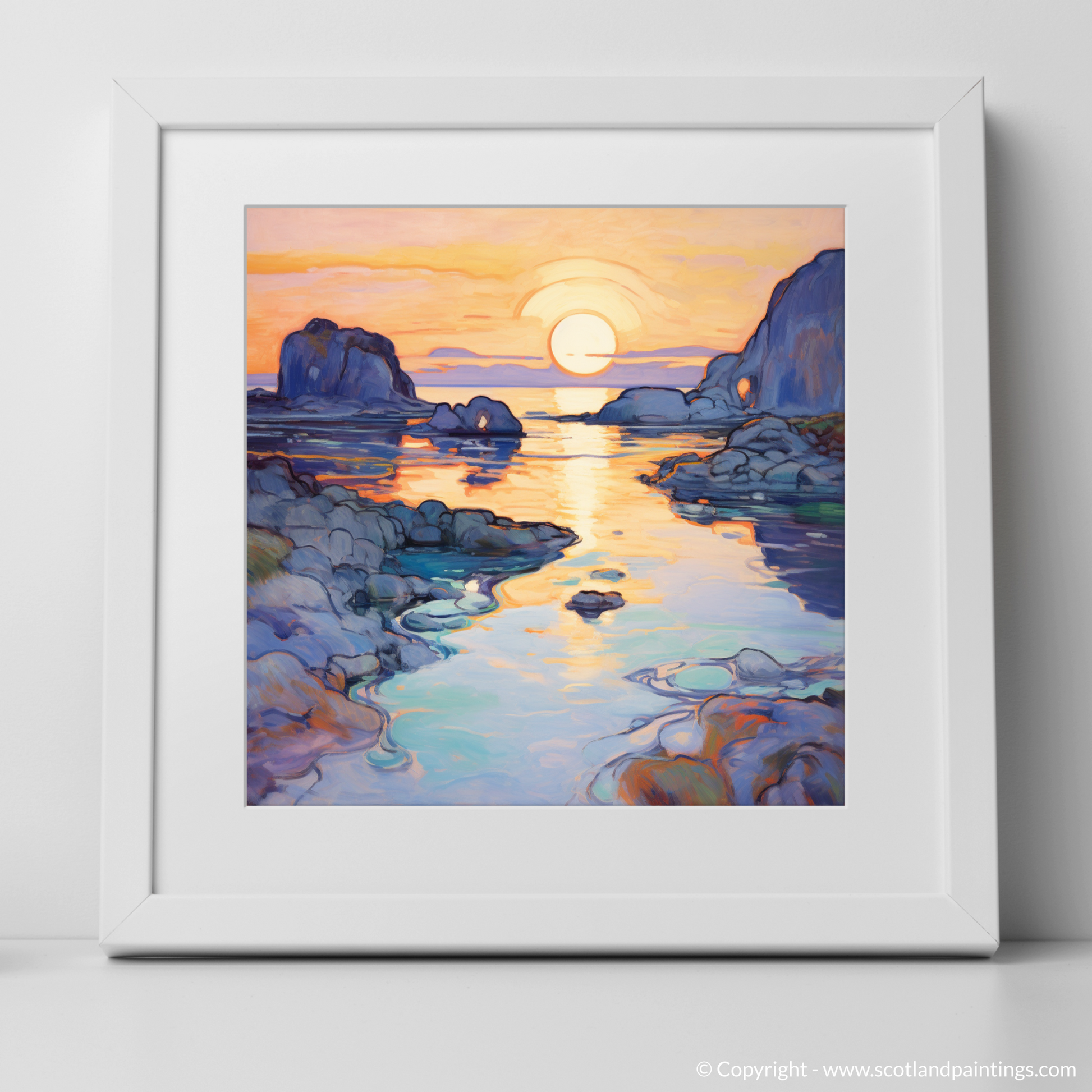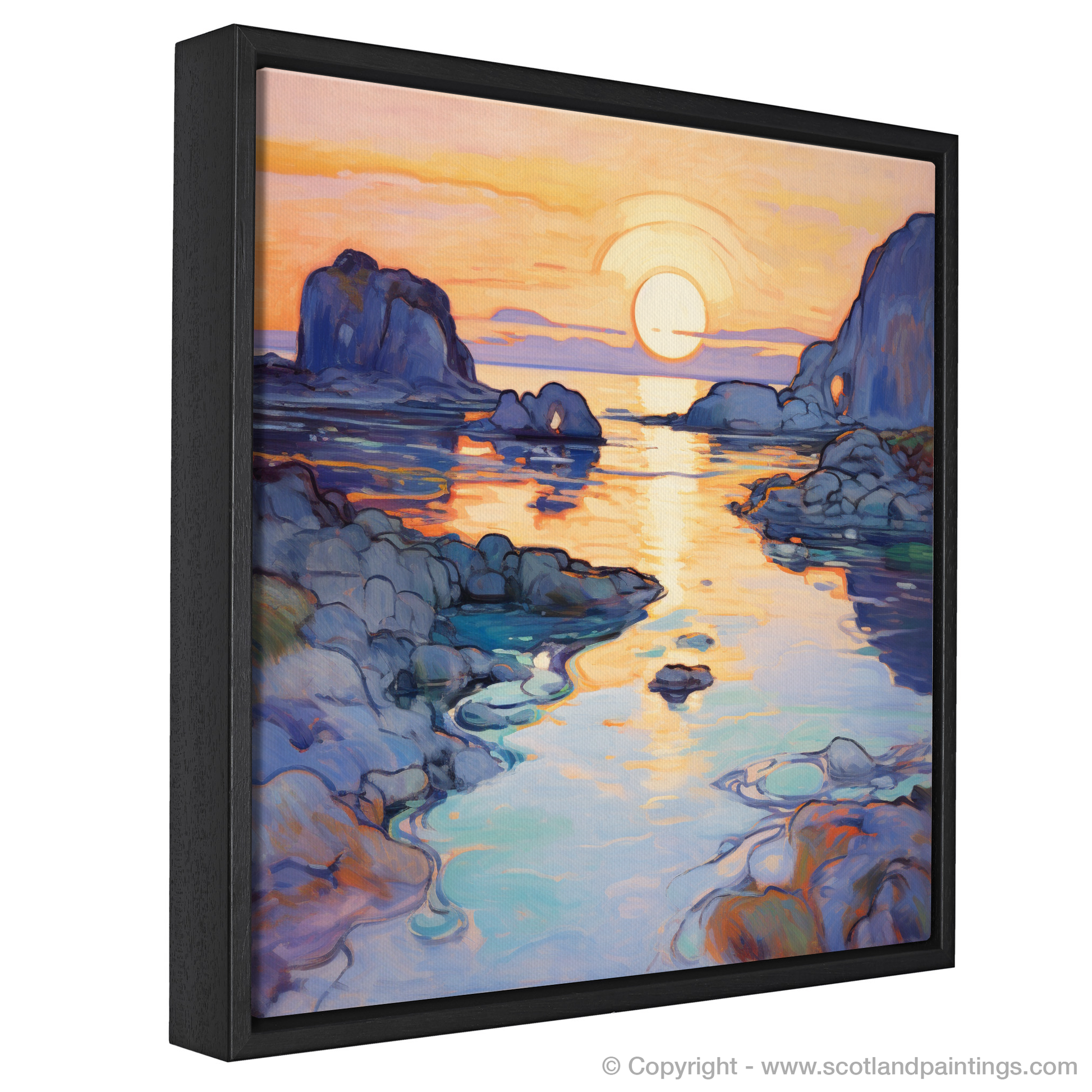 As the golden hues of sunset kiss the sea, this exquisite print captures the serene beauty of Ardulanish Bay with an Art Nouveau twist. The piece is a riot of colour, where the warm oranges and pinks of the evening sky blend seamlessly with the tranquil blues and purples of the Scottish waters. Embellished with graceful, flowing lines characteristic of the Art Nouveau style, the tableau oozes an organic essence, as if nature itself has been stylised into a dance of curves and waves.