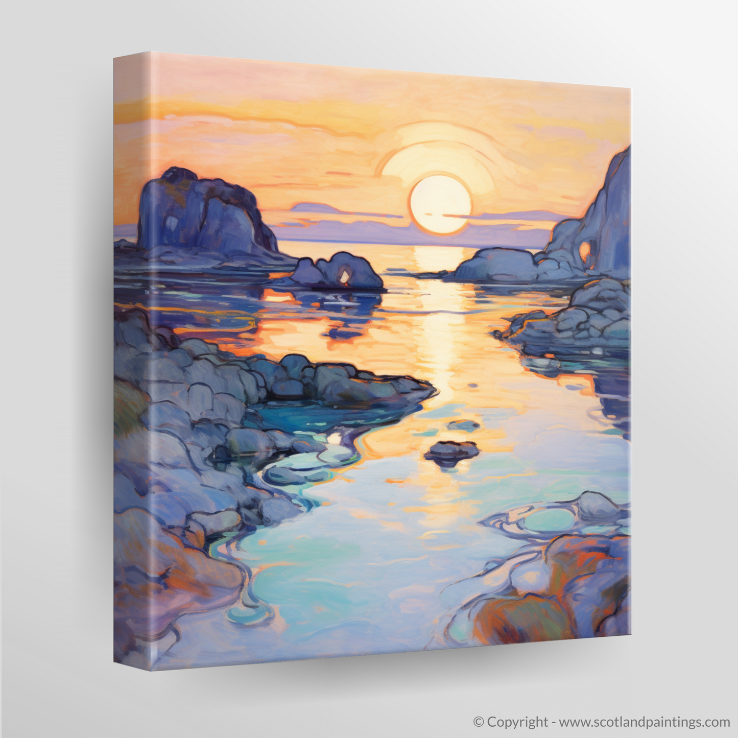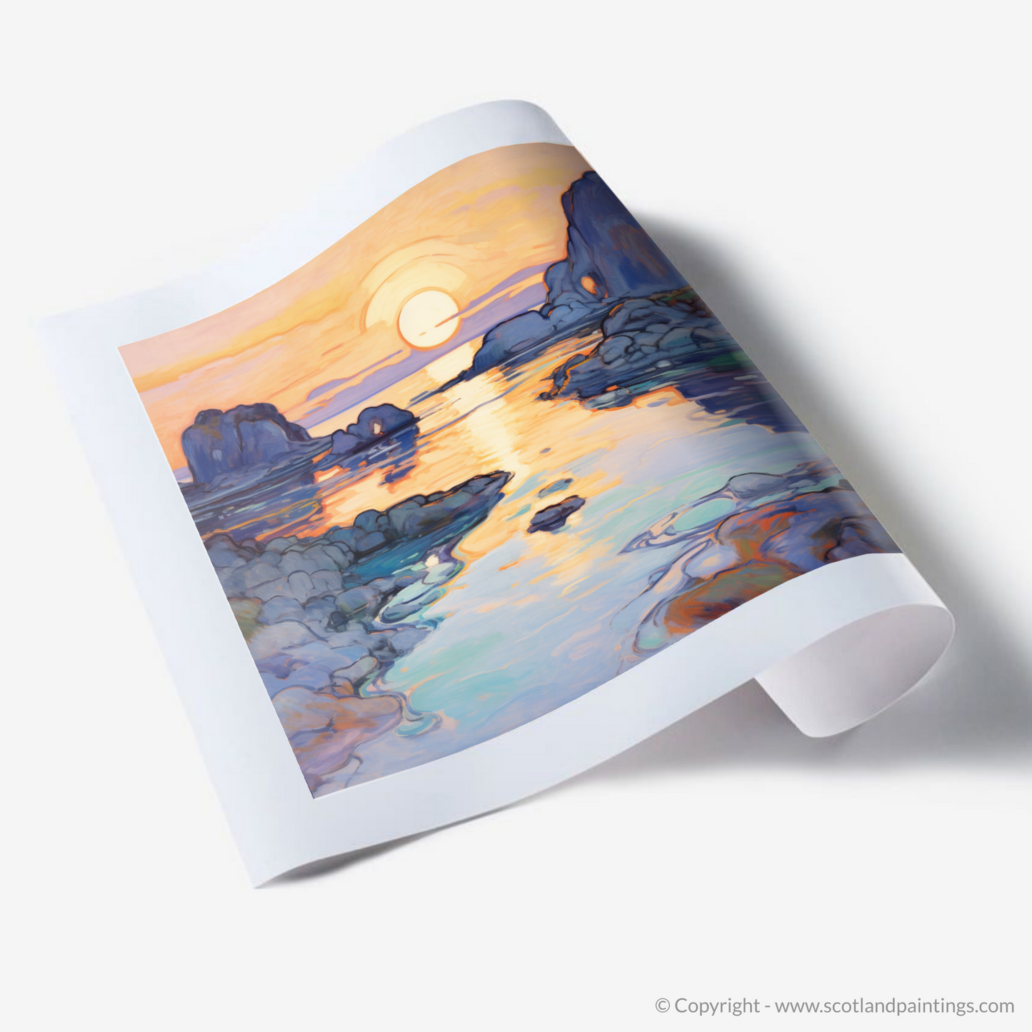 The allure of this print lies in its ability to transport you to the tranquil shores of one of Scotland's most picturesque coves, inviting a sense of peace and reflection into any space it graces. Whether adorning a home or office, this print is sure to captivate and charm lovers of both the Scottish coastline and the timeless Art Nouveau style.