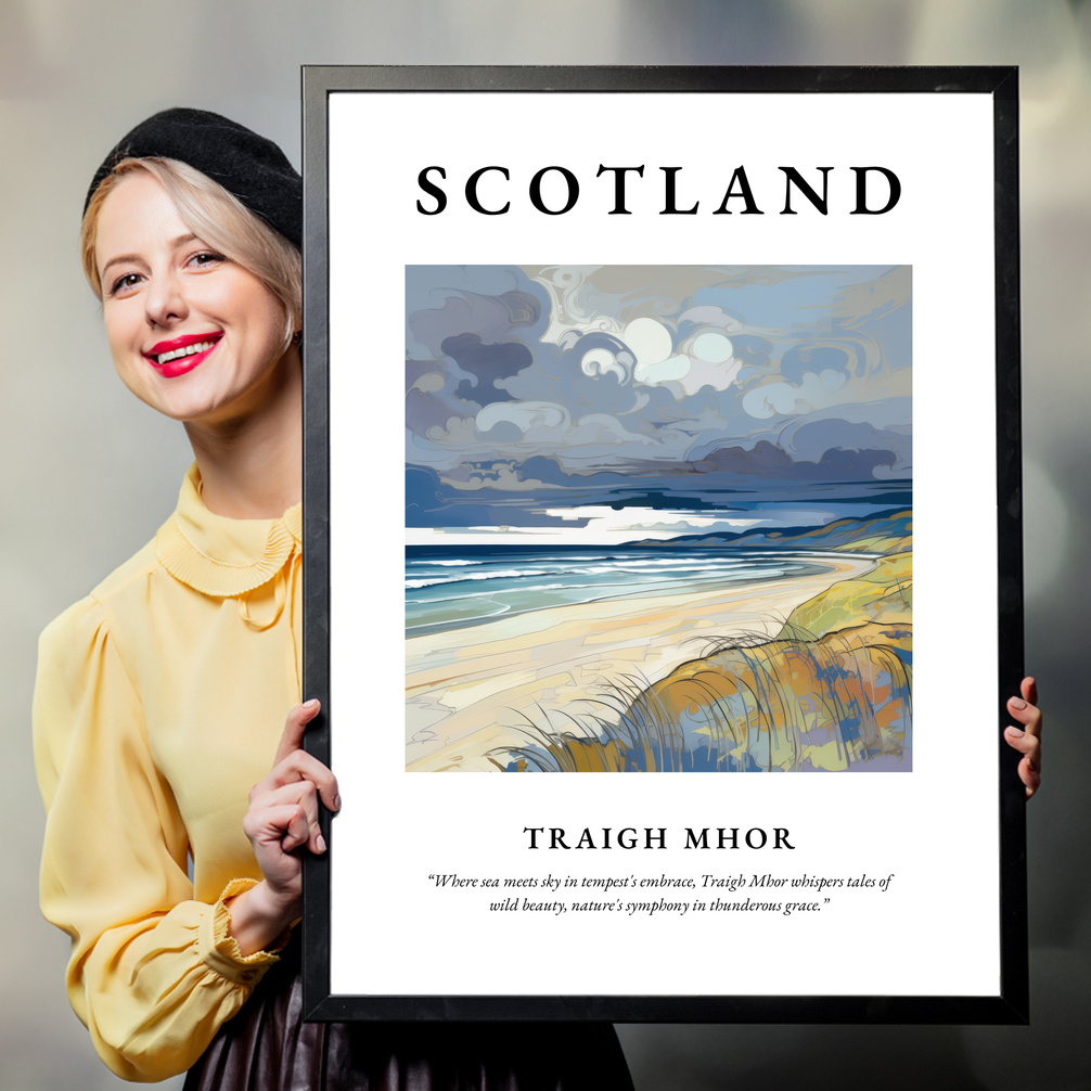 At the top of the poster, the word “SCOTLAND” dominates in bold, inviting the viewer into a world where art and nature intertwine. Below, an enchanting Art Nouveau rendition of Traigh Mhor unfolds, rich in swirling lines and intricate details. This scene is a stunning homage to the interplay of sea and sky, each brushstroke echoing the dynamic dance of waves and clouds. Beneath the painting, a poetic quote whispers tales of the cove's wild beauty, setting the stage for this breathtaking landscape: “Where sea meets sky in tempest's embrace, Traigh Mhor whispers tales of wild beauty, nature's symphony in thunderous grace.”