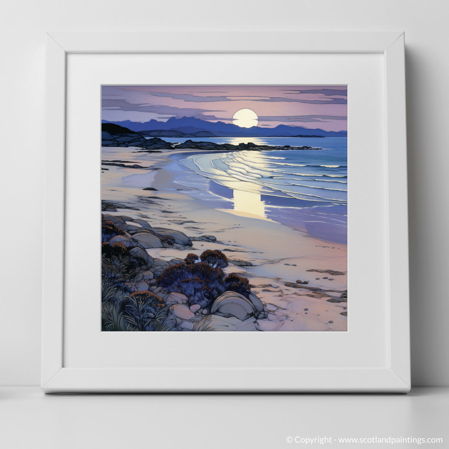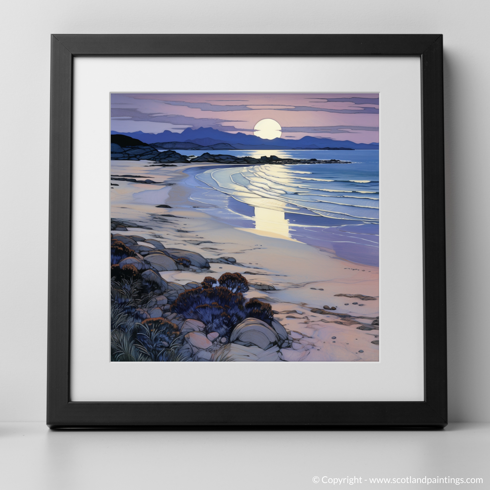 As the evening hues glide silently over Traigh Mhor, a spectral dance transpires on the canvas of sand and sea in this captivating Art Nouveau-inspired print. A symphony of twilight colours orchestrate the scene, with the soft lilac and periwinkle of the sky melting into the warm, honeyed tones of the setting sun, cradled gently above distant silhouetted mountains.