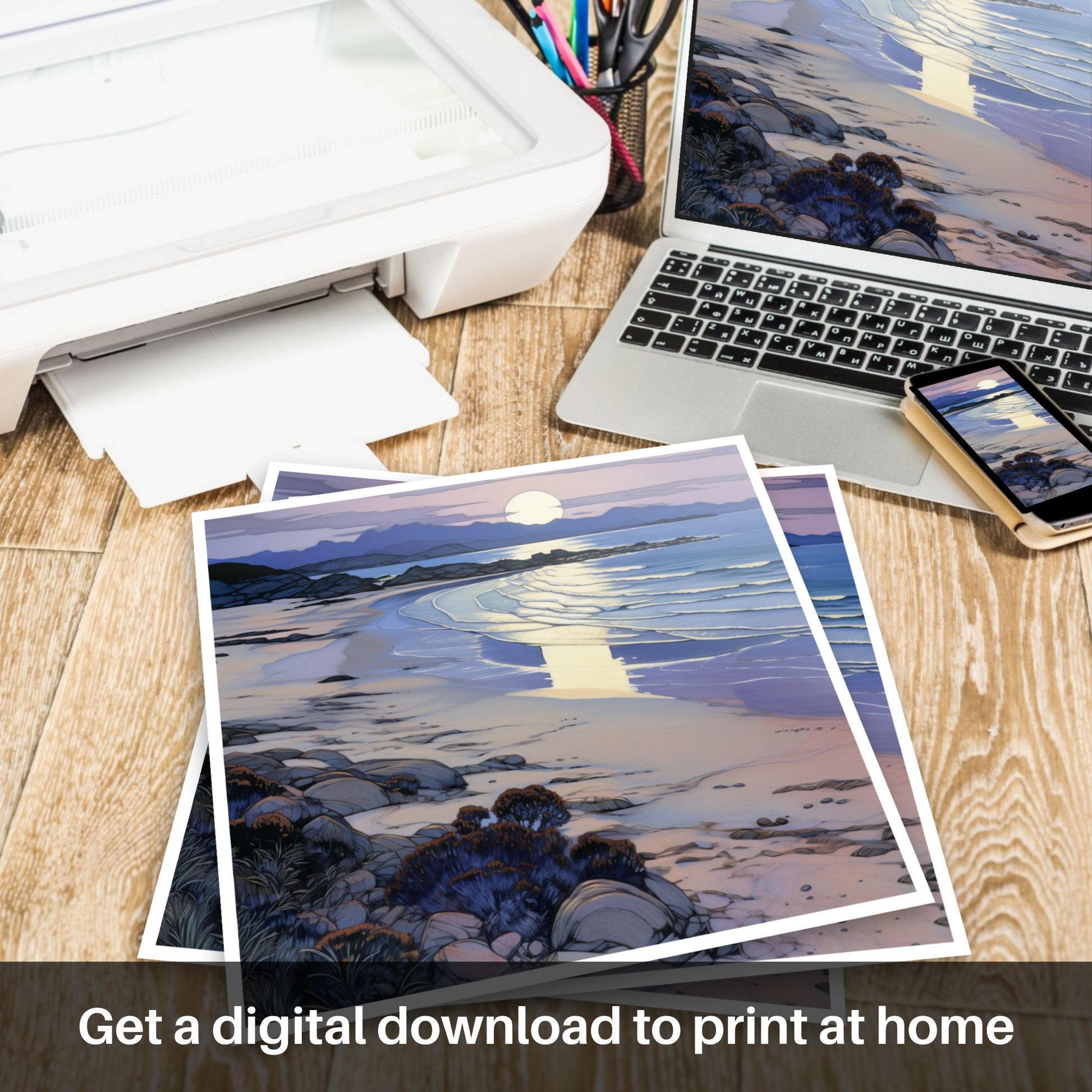 This print from our 'Scottish Beaches' collection offers a serene escape to the heart of Scotland's coastal splendour, inviting the onlooker to a place where time seems to slow and the world grows quiet, save for the gentle murmurs of the tide and the soft caress of the dusk. Whether as an homage to nature's majesty or a token of serene introspection, this piece will undoubtedly imbue any space with its peaceful and enchanting spirit.