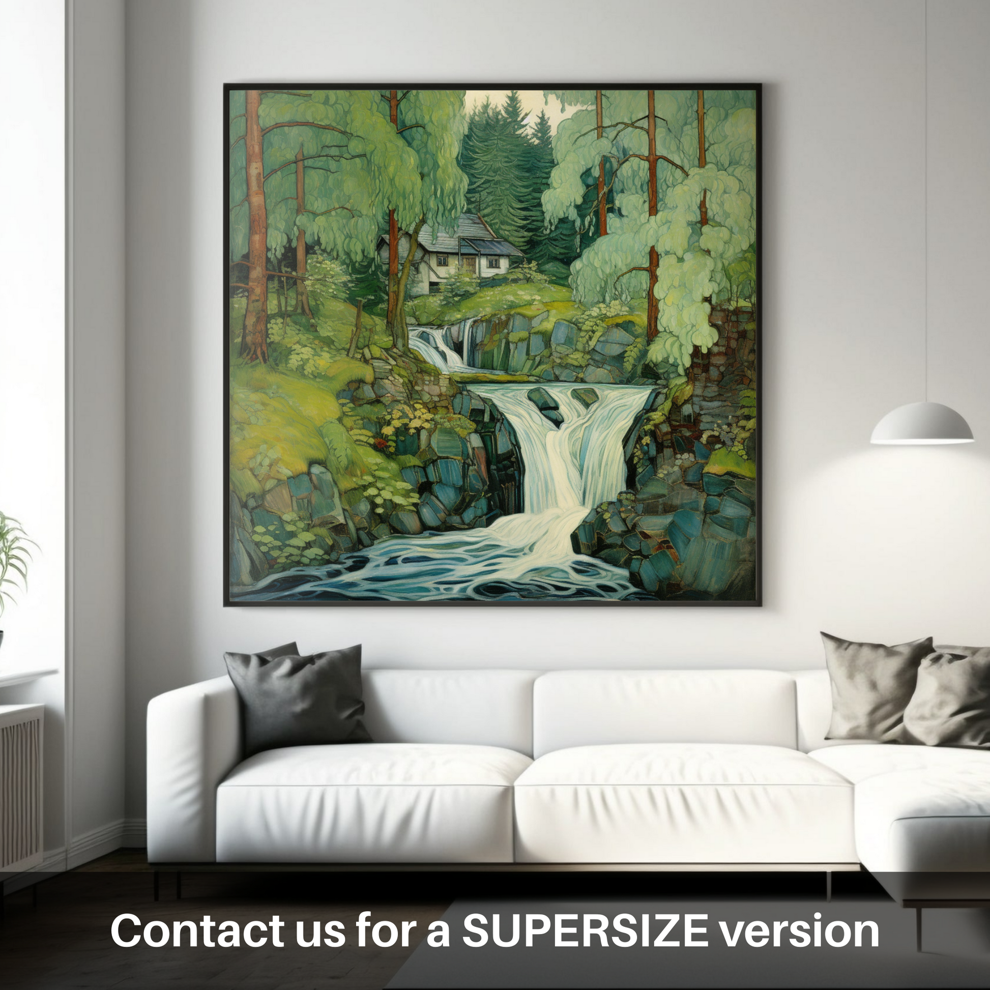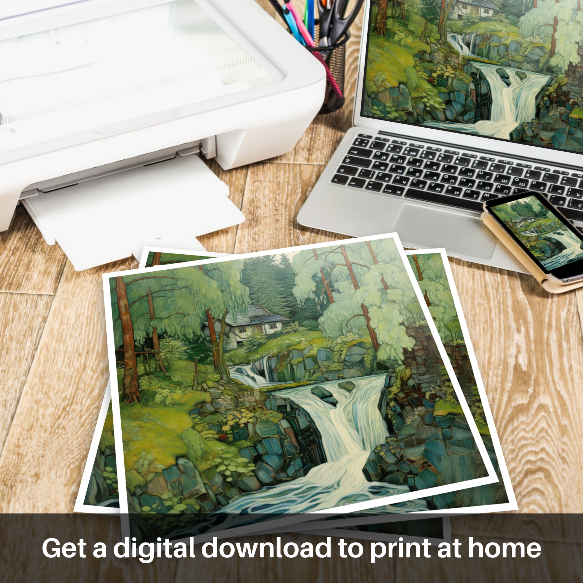 Nestled amidst the verdant embrace of Scottish woodlands, this captivating print brings to life the serene allure of Bonaloch Falls, a gem hidden in the wilds of Angus. The artwork exudes an unmistakeable Art Nouveau charm, with its fluid lines and organic forms creating a harmonious composition that is both enchanting and soothing.