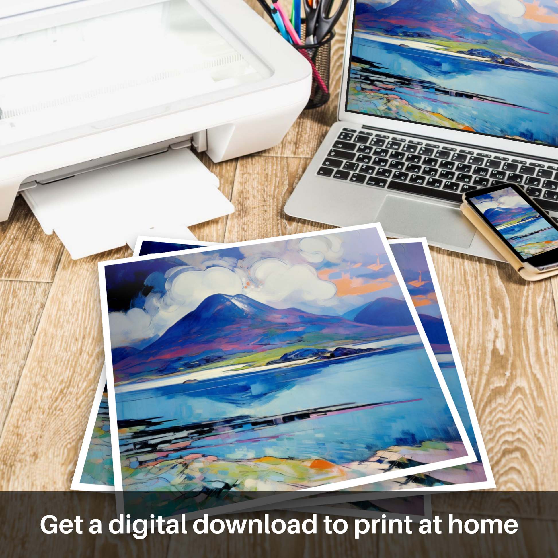 This piece is a visual symphony, resonating with those who cherish the romance of Scotland's natural scenery. It offers a unique and contemporary perspective, ideal for bringing a touch of Scotland's powerful and picturesque landscapes into your home or office.