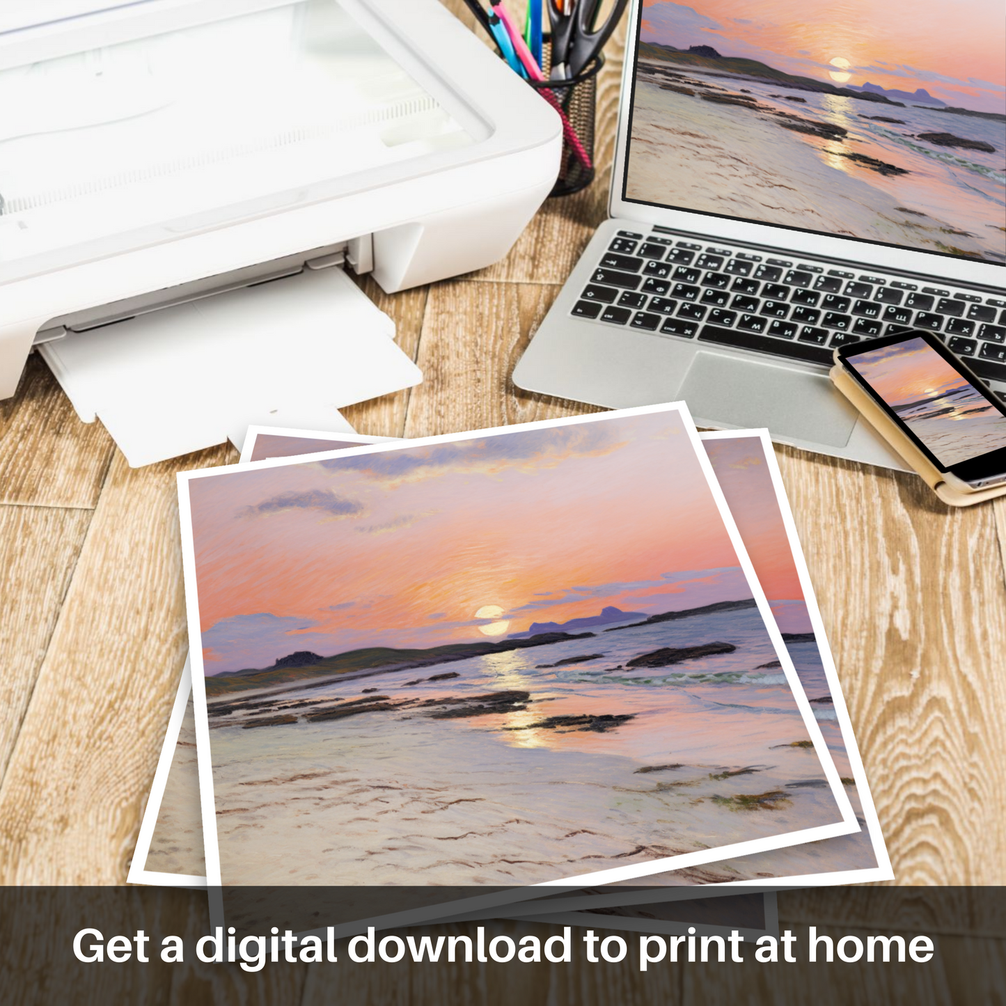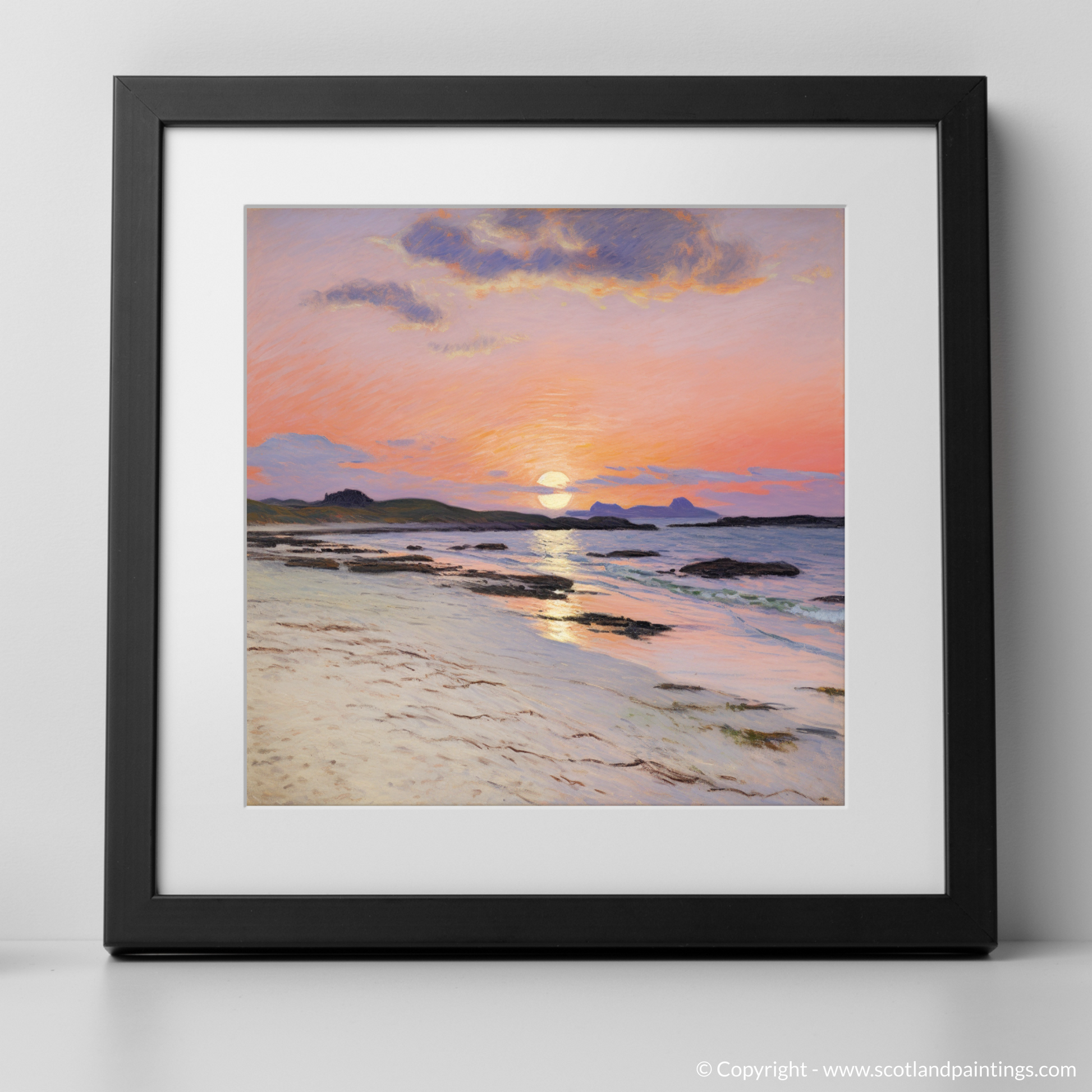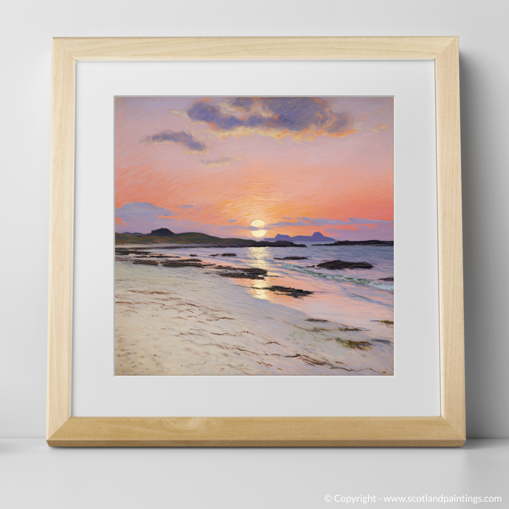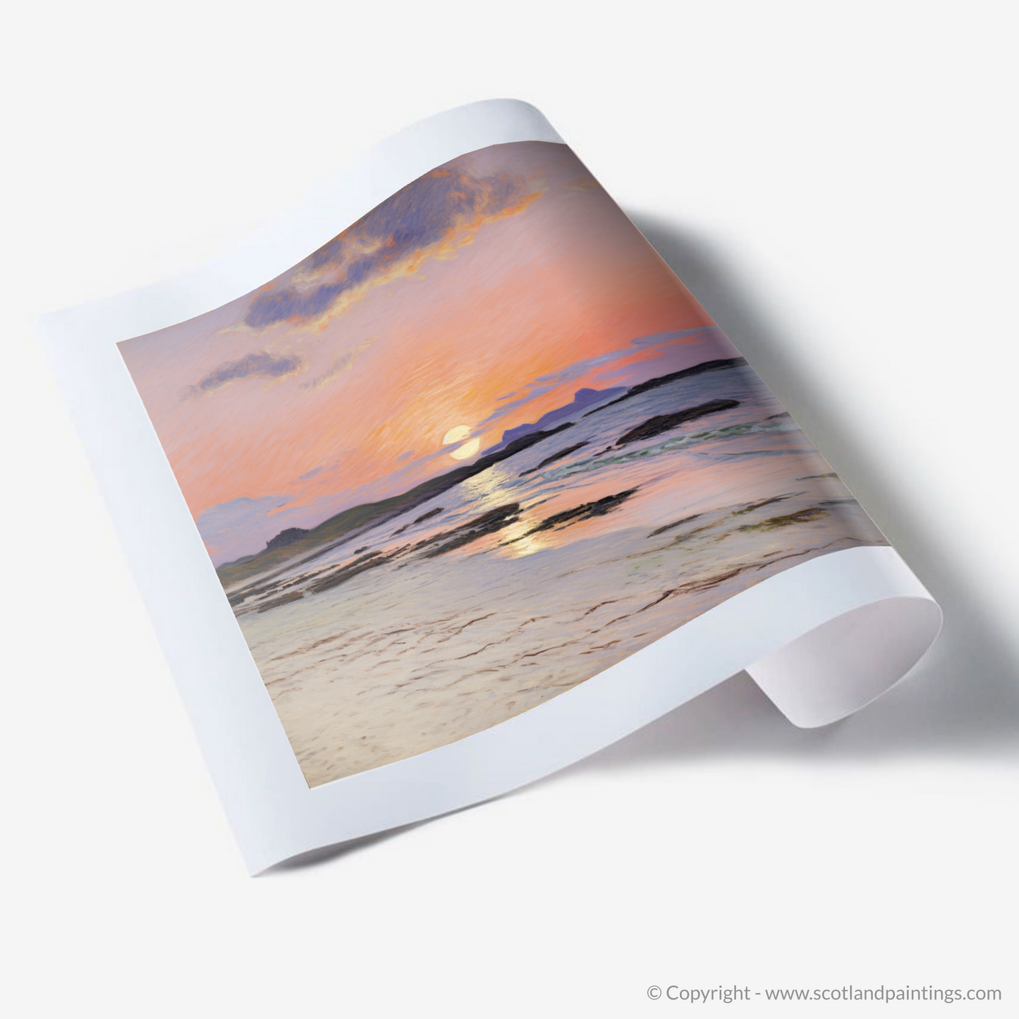 Bask in the ethereal glow of the Scottish coastline with this evocative print, capturing the serene beauty of Traigh Mhor at the magic hour. Soft, pastel hues of pink, lavender, and peach bleed into one another in the expansive sky, creating a tapestry of colour that reflects the quintessence of Impressionism. Beneath this delicate sky, the setting sun is a radiant orb that dips towards the horizon, sending a pathway of shimmering gold across the gentle ripples of the sea.