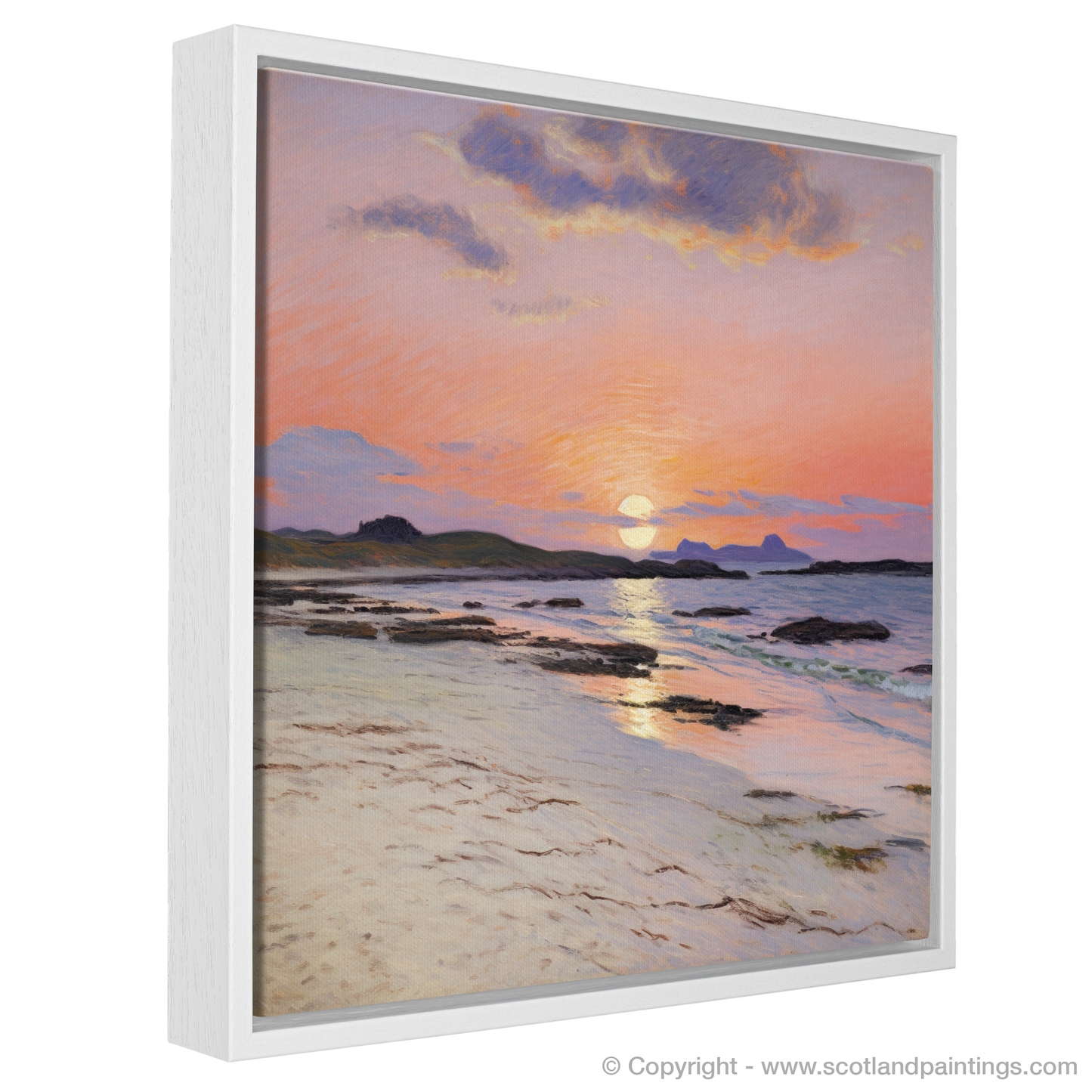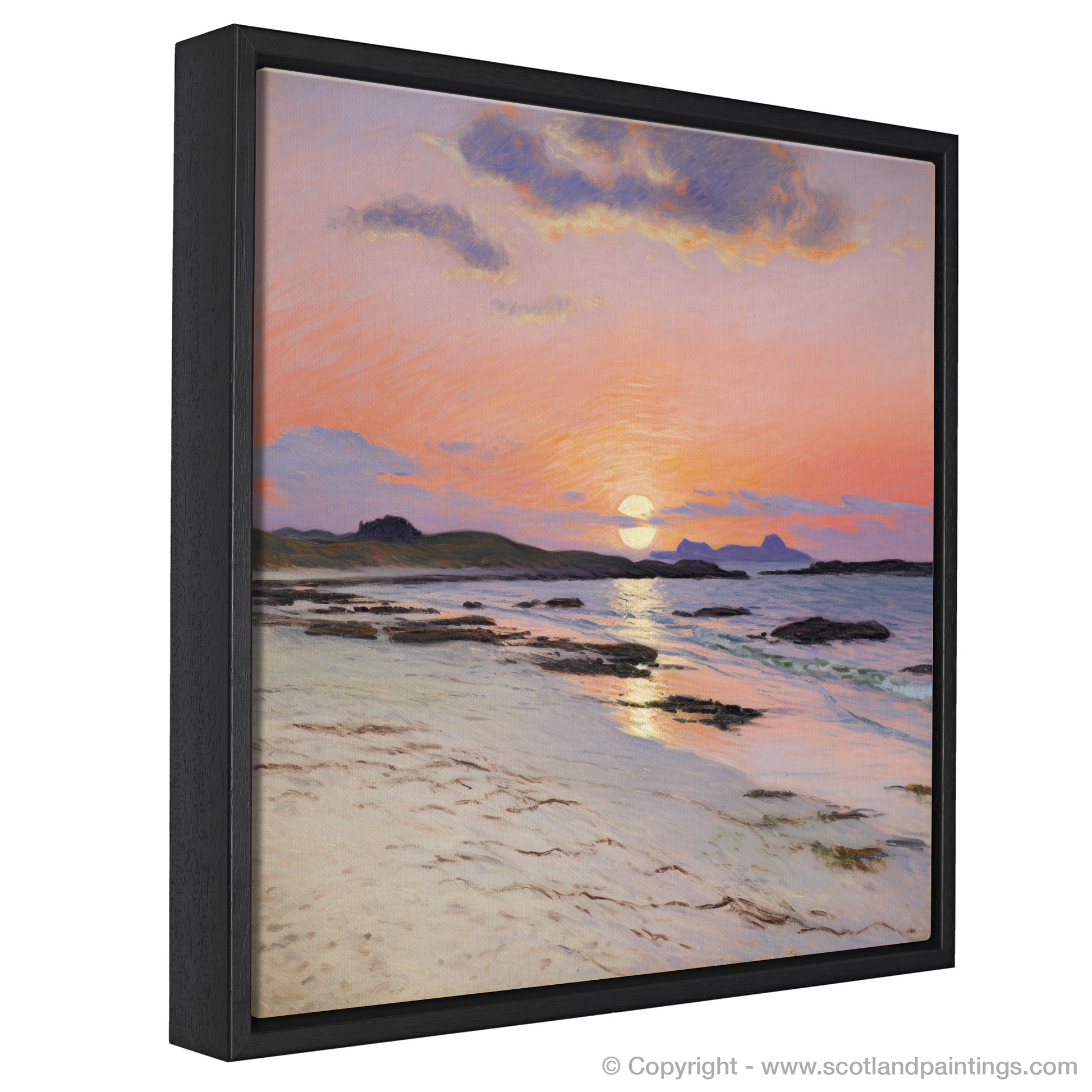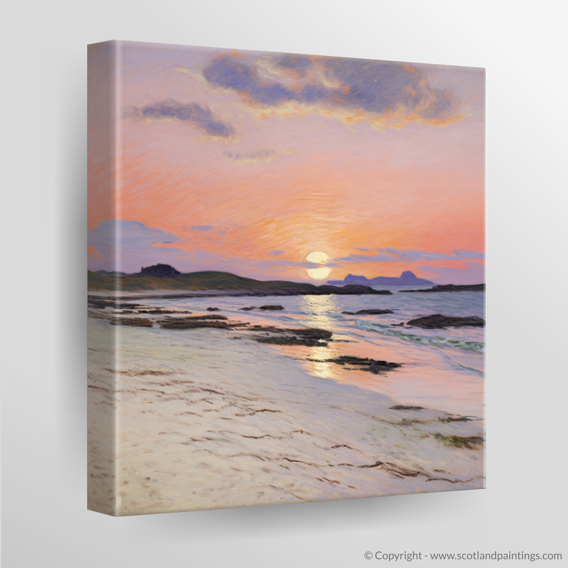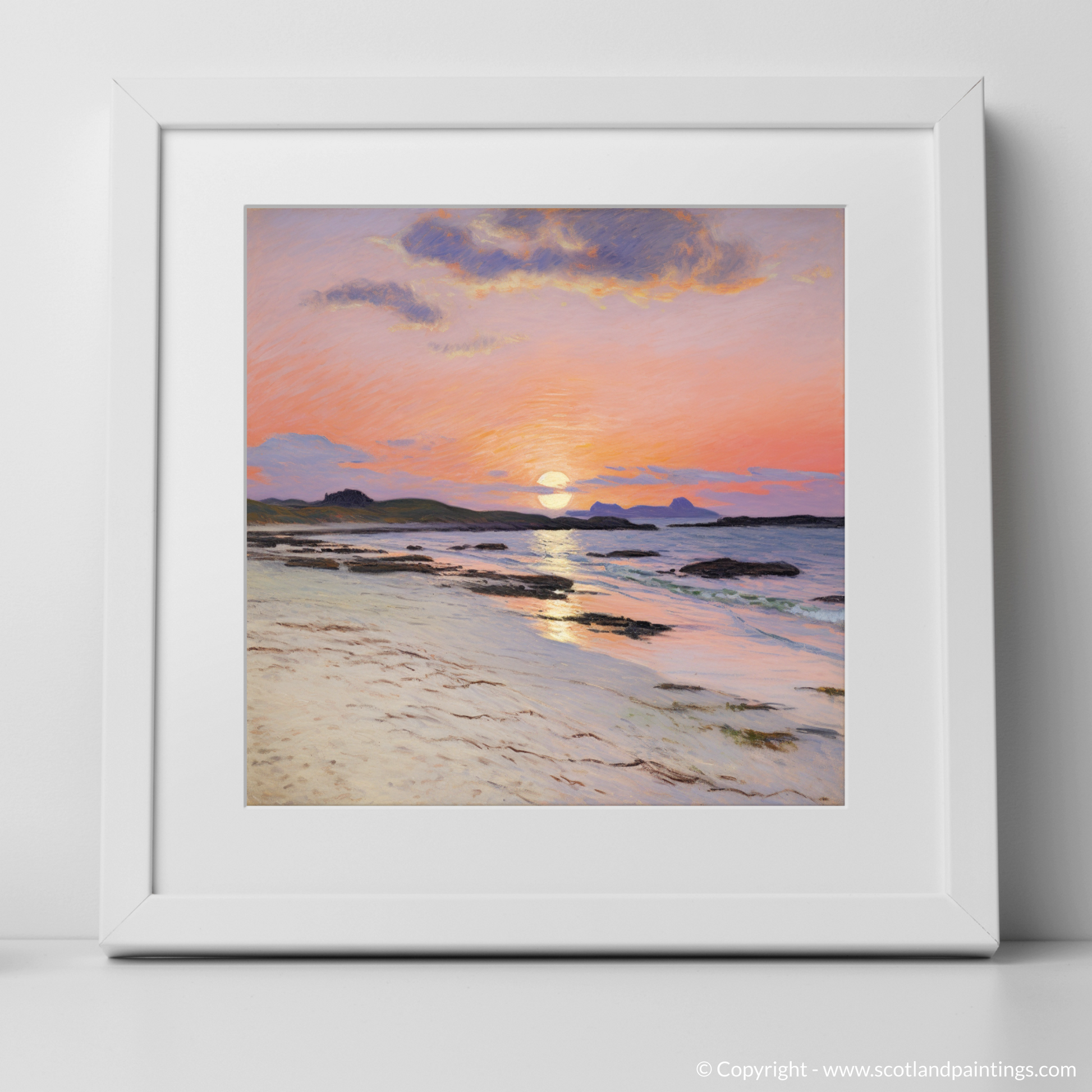 Bask in the ethereal glow of the Scottish coastline with this evocative print, capturing the serene beauty of Traigh Mhor at the magic hour. Soft, pastel hues of pink, lavender, and peach bleed into one another in the expansive sky, creating a tapestry of colour that reflects the quintessence of Impressionism. Beneath this delicate sky, the setting sun is a radiant orb that dips towards the horizon, sending a pathway of shimmering gold across the gentle ripples of the sea.