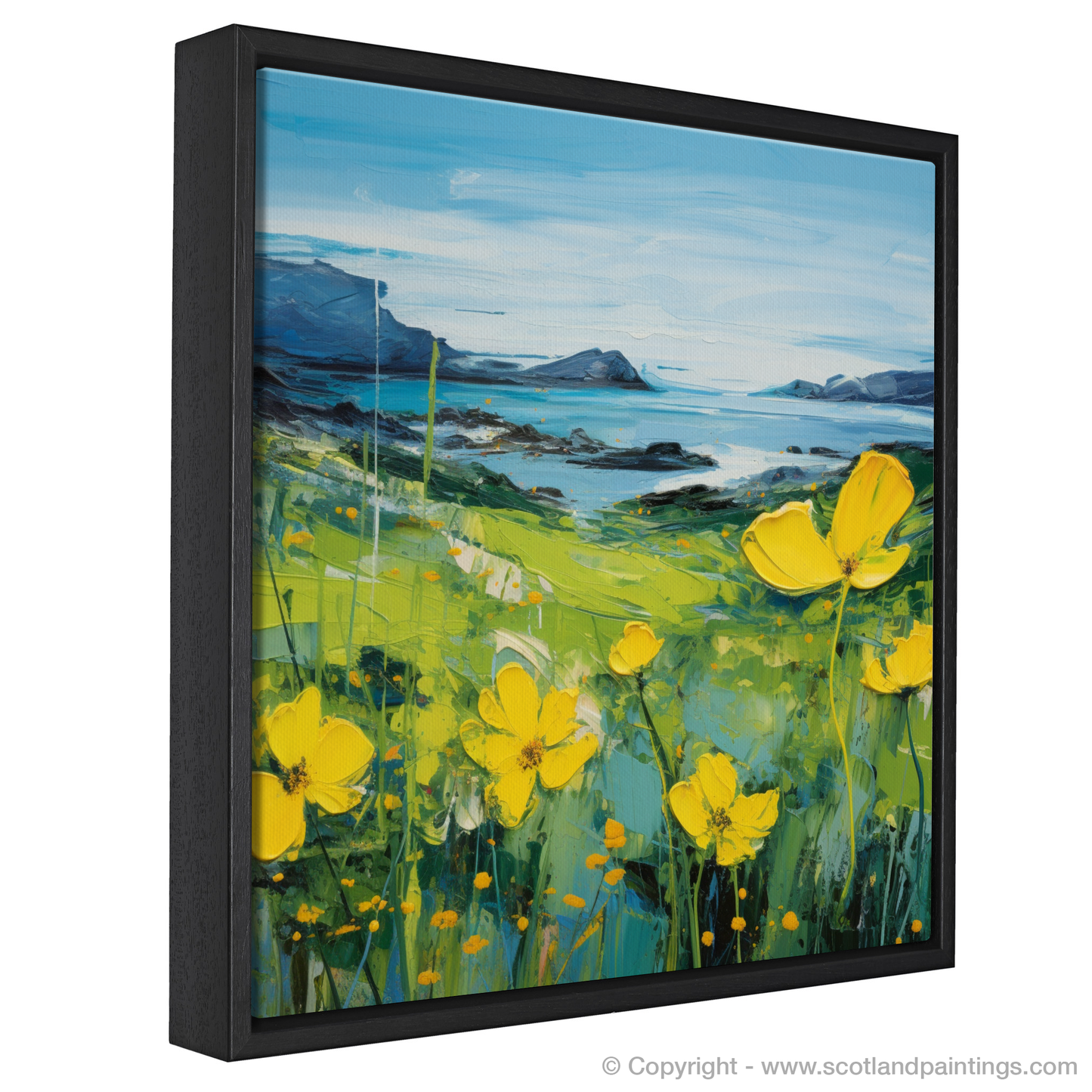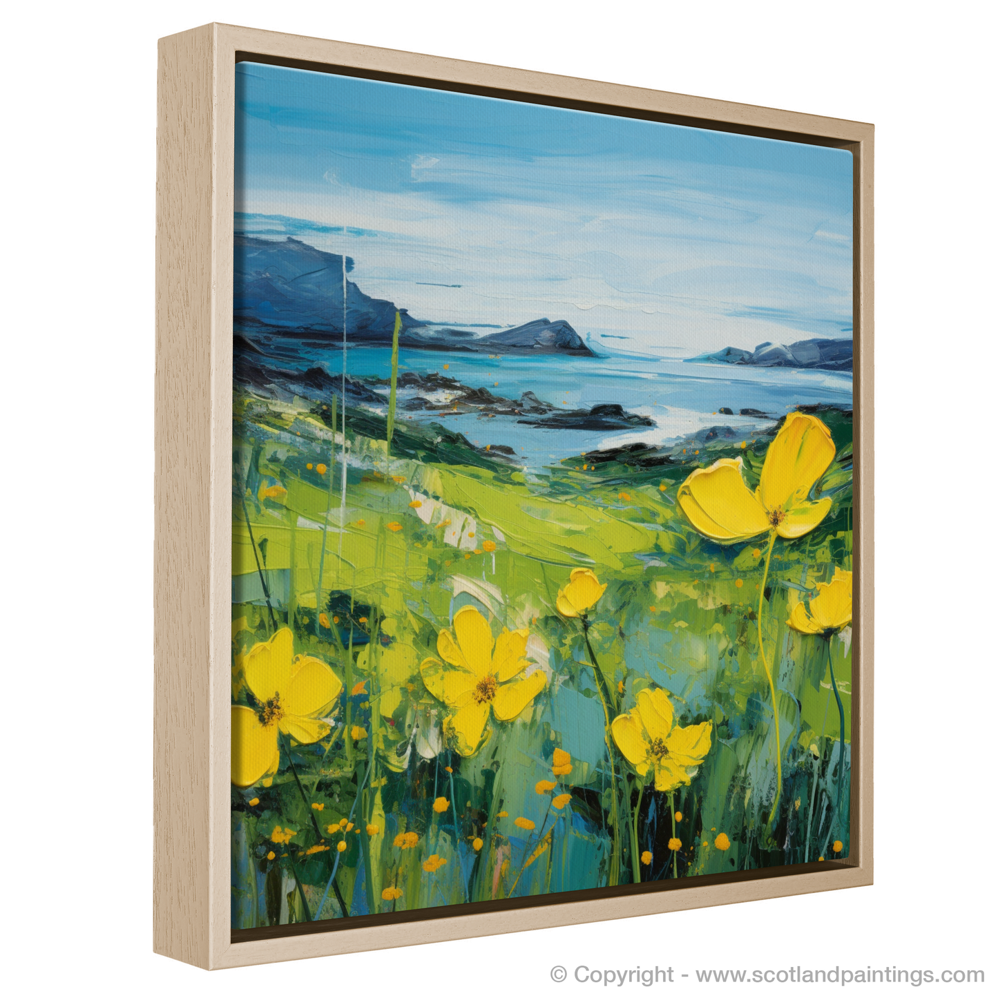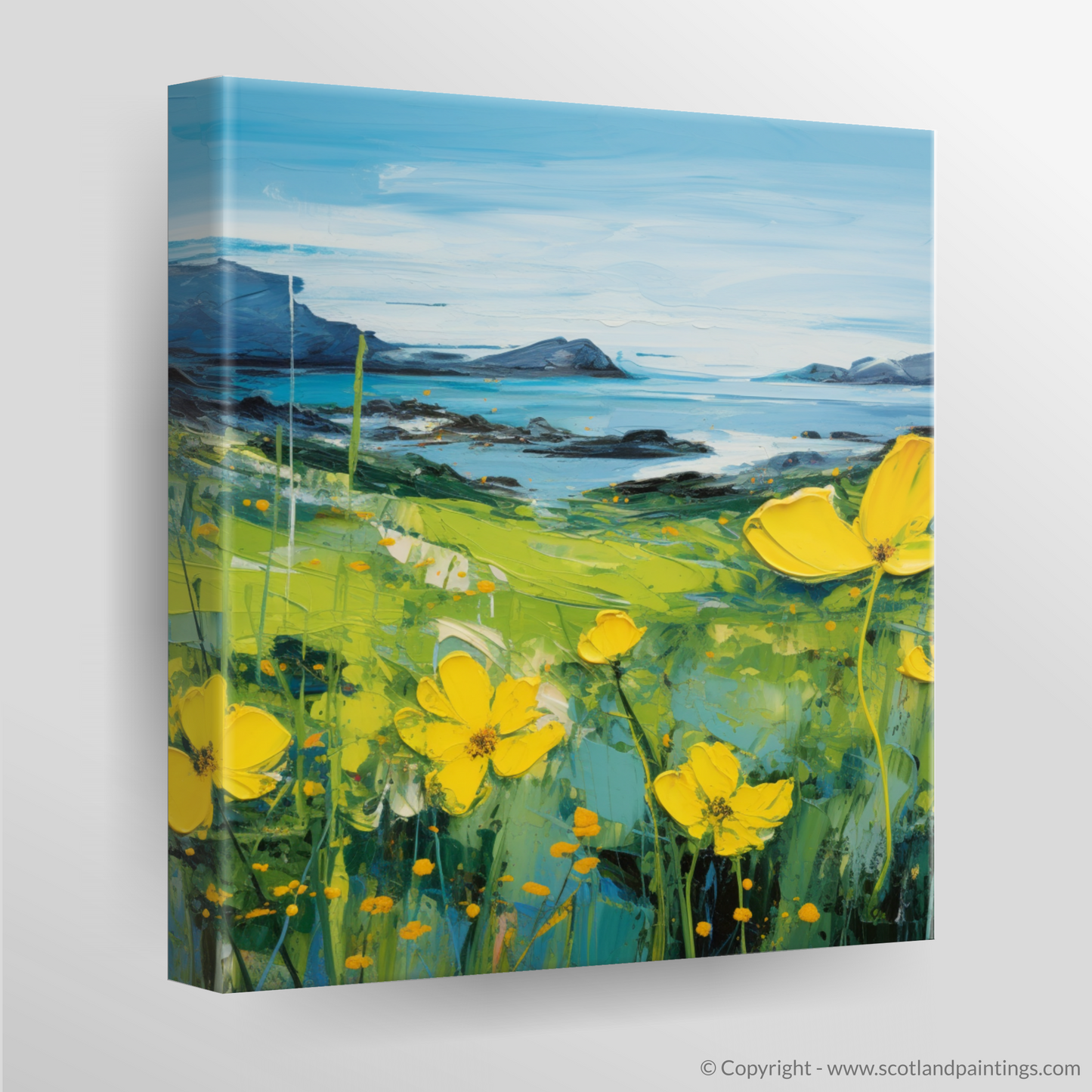 Lush hues of emerald and olive form a verdant canvas, where the essence of soft, sunlit meadows brushing against untamed shores comes to life. Behold the wistful dance of the primrose, its petals rendered in bold strokes of golden yellow that sing amidst a myriad of green. The sun-imbued blossoms, each one a burst of vitality, seem to sway with the whisper of coastal winds.