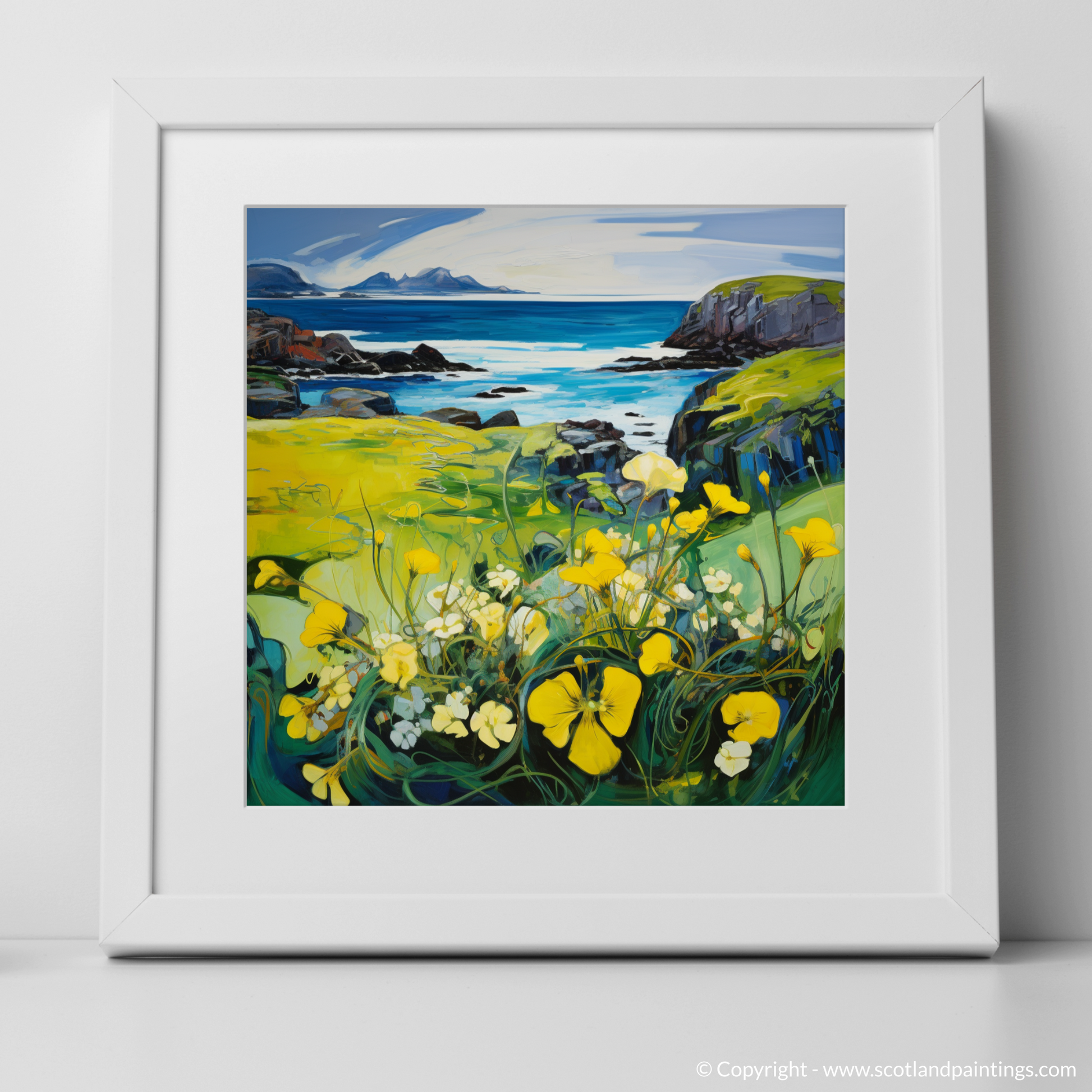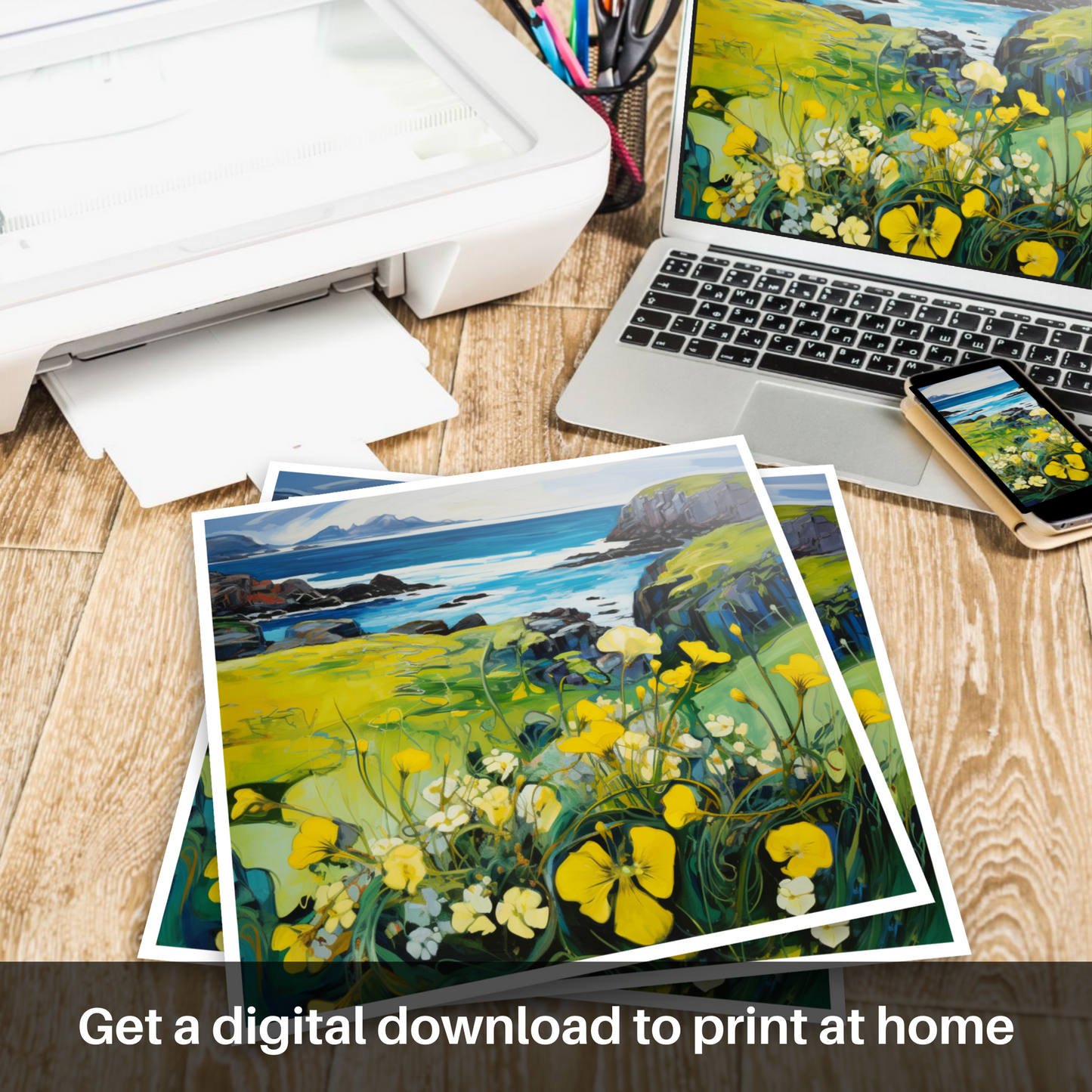 The expressive technique employed brings forth a vivid textural quality that begs the viewer to reach out and touch the swirling grasses and the rugged terrain. The essence of place and moment is captured not just visually but emotionally, offering a window into the soul of the region that so inspired its creation. This print channels not merely the visual splendour of the Scottish coast but also its enduring, windswept spirit.