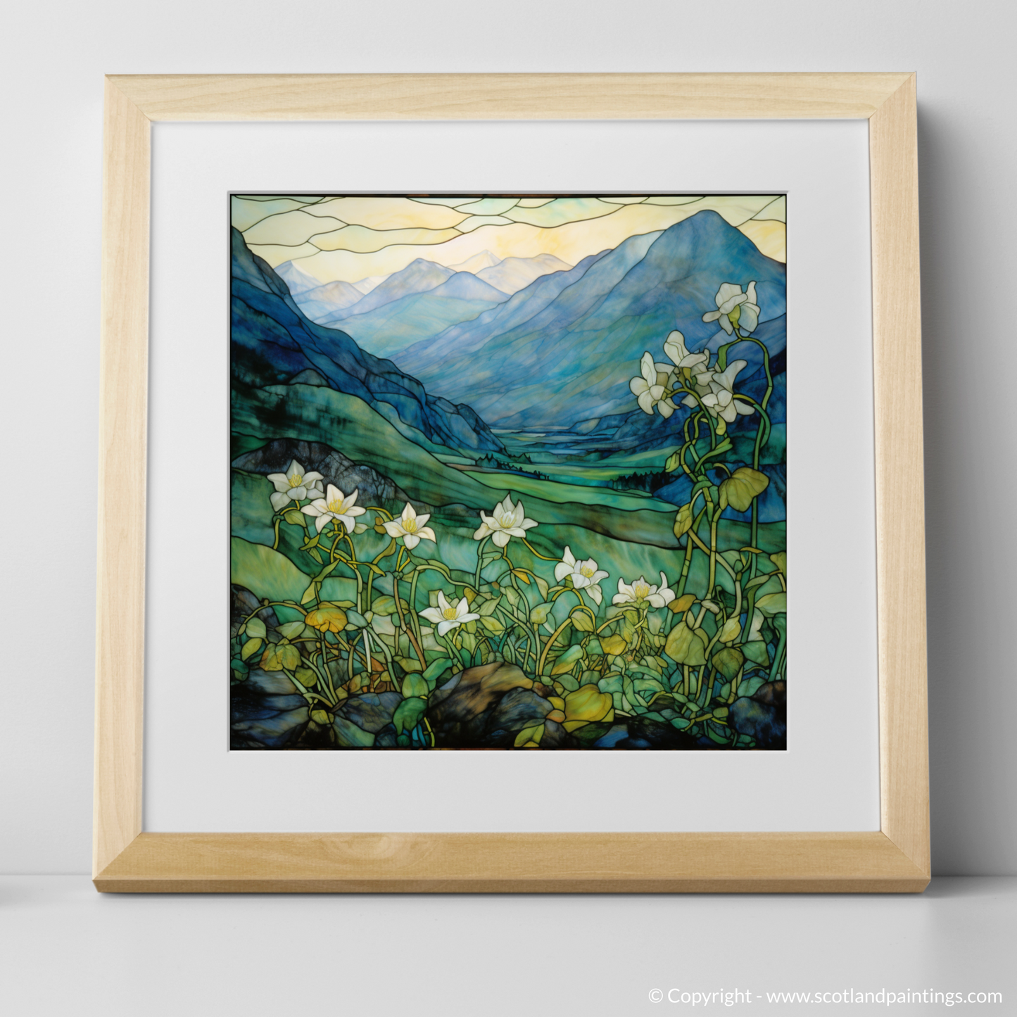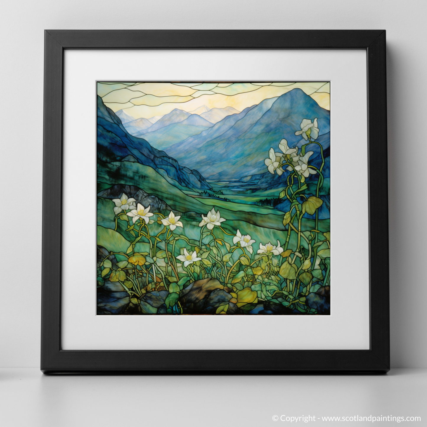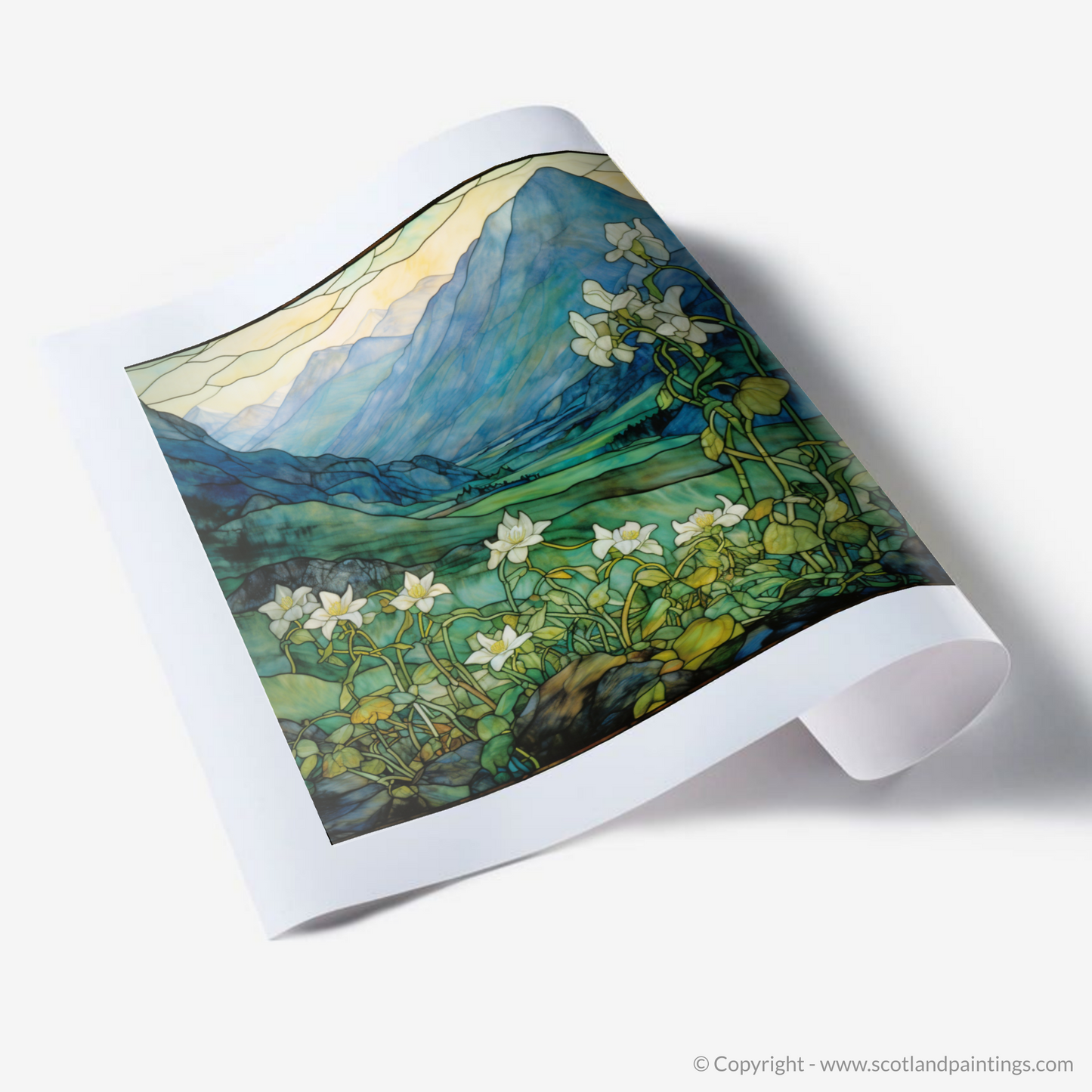 Captivating the essence of Glen Coe's elusive beauty, this exquisite print brings the serene Scottish landscape into your home. Delicate mountain sorrel blossoms, rendered in an Art Nouveau style, grace the foreground with their elegant white petals and lush green foliage.