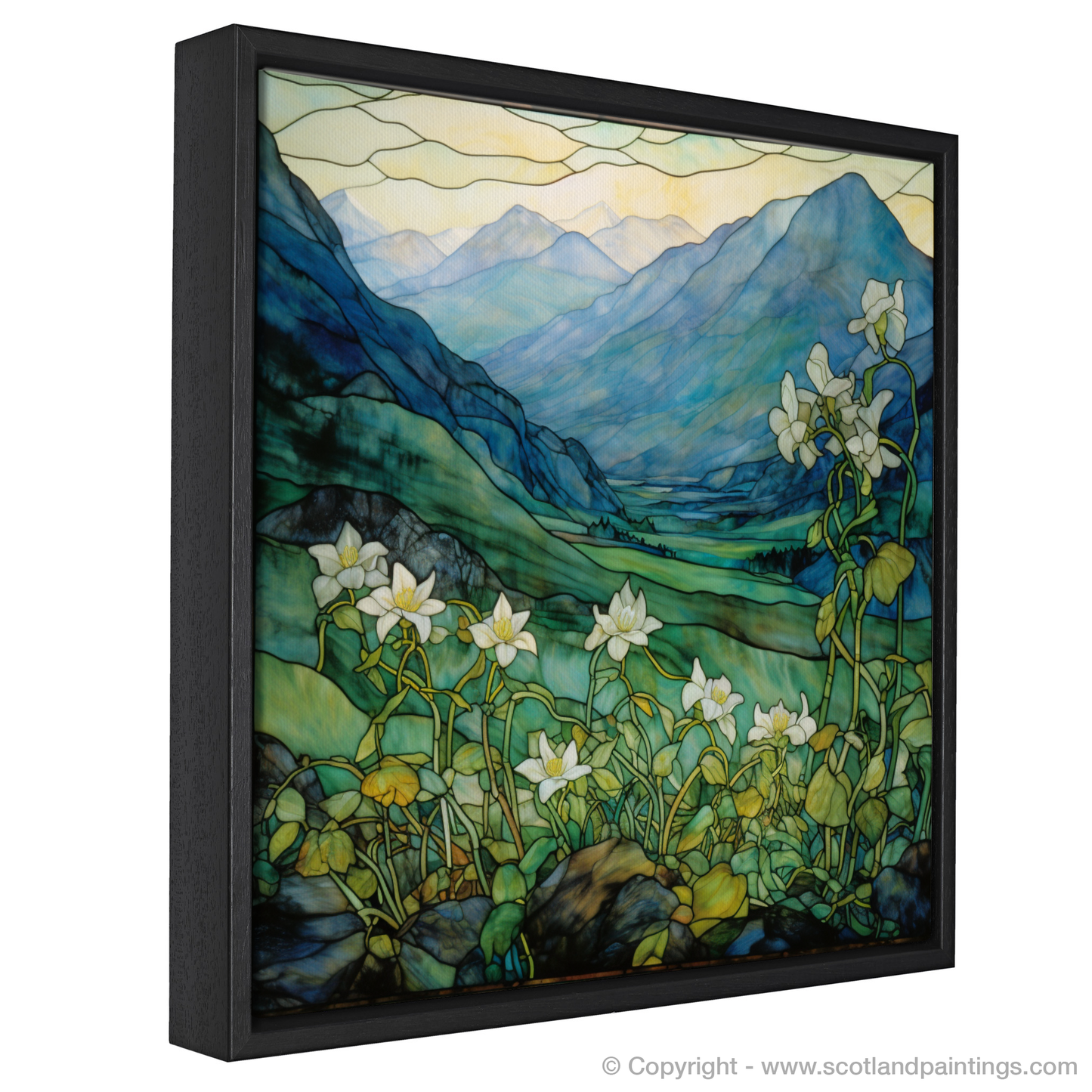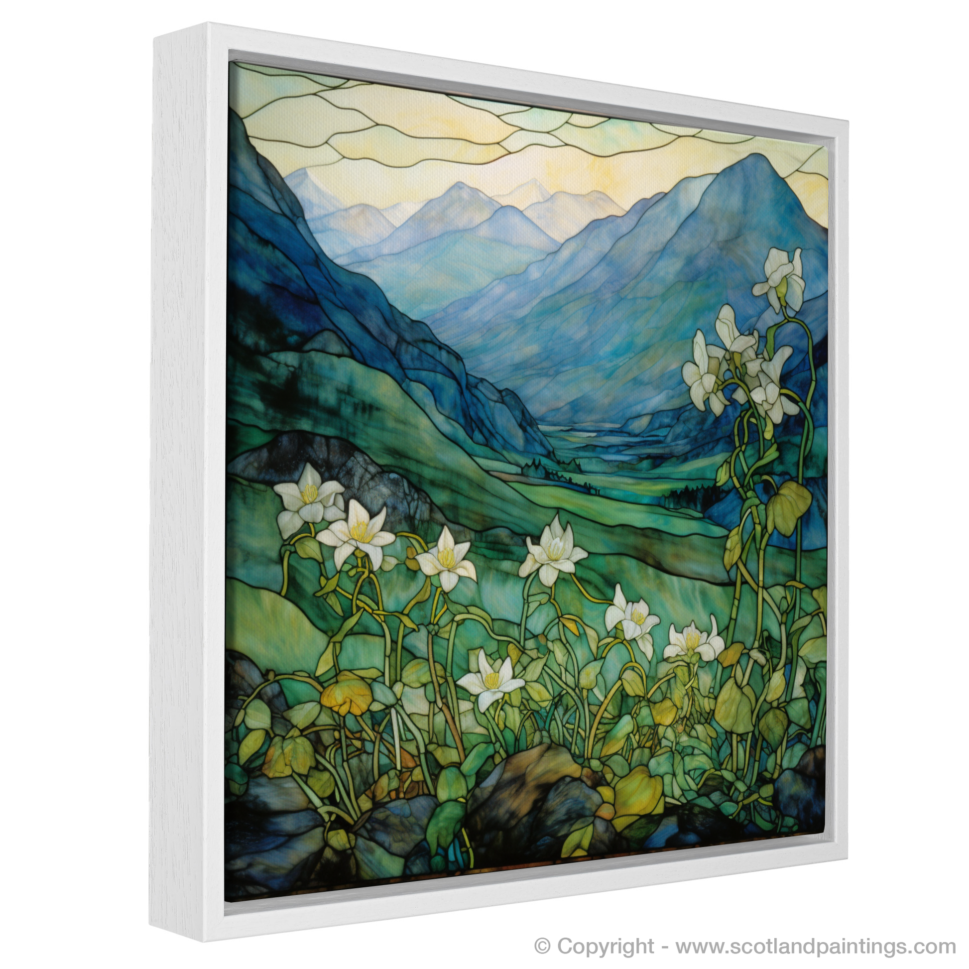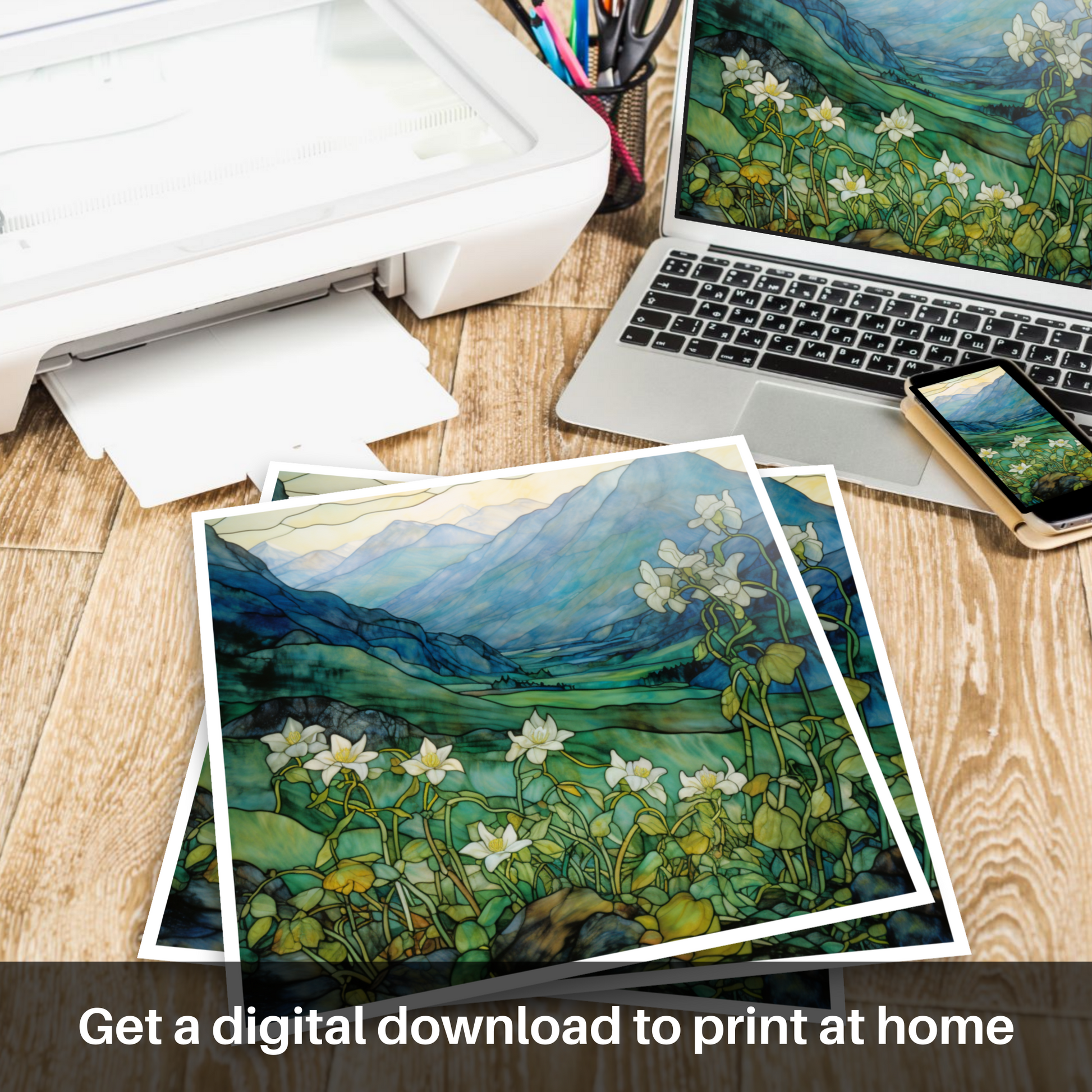 Captivating the essence of Glen Coe's elusive beauty, this exquisite print brings the serene Scottish landscape into your home. Delicate mountain sorrel blossoms, rendered in an Art Nouveau style, grace the foreground with their elegant white petals and lush green foliage.