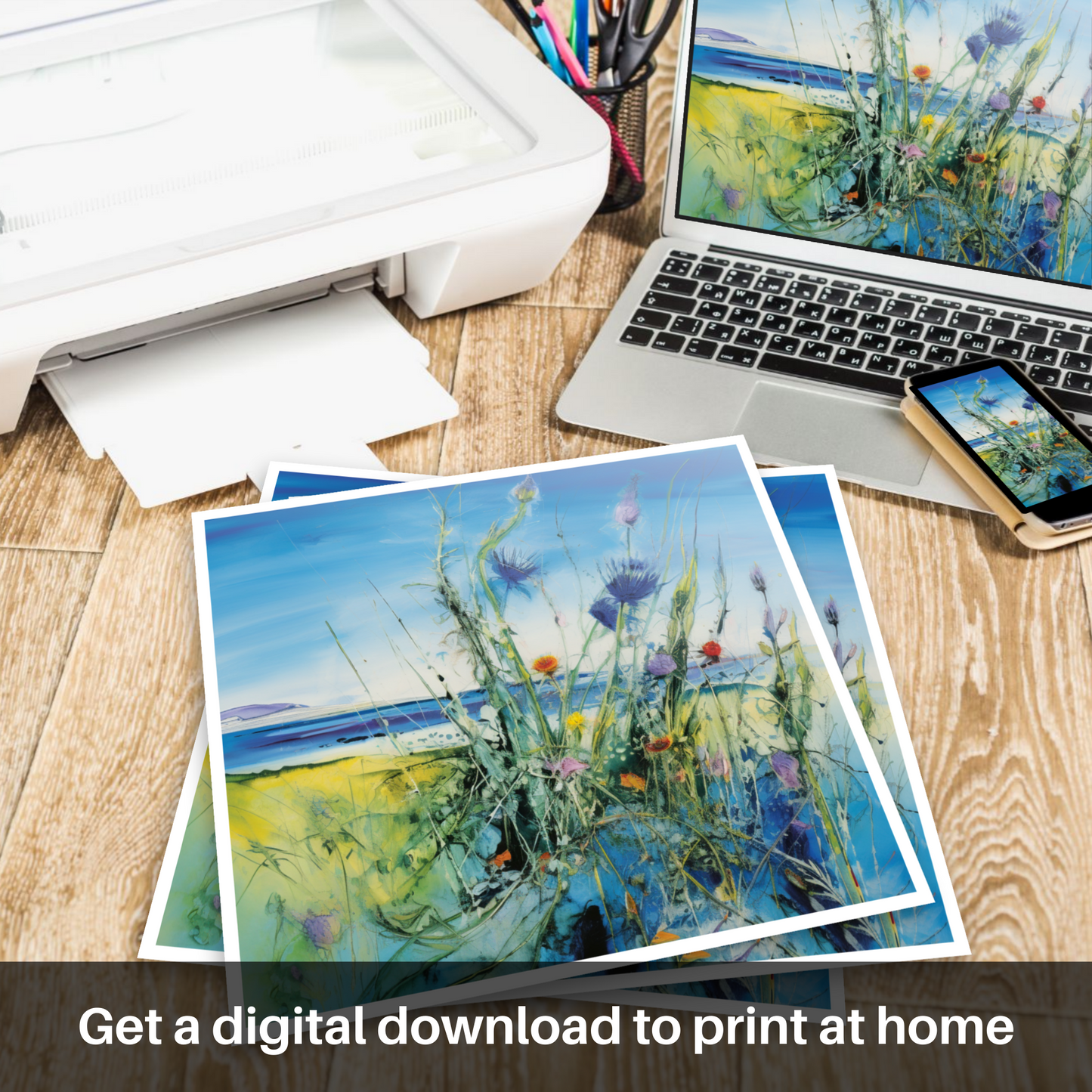 Step into a dreamscape where the wild beauty of Scotland's coastal flora is reimagined through the vivid lens of surrealism. This entrancing print showcases the captivating allure of Viper's bugloss, as it flourishes amongst an array of enchanting Scottish wildflowers. Each bloom is a riot of colour, their forms twisting and elongating in fantastical manners that defy the conventions of the natural world.