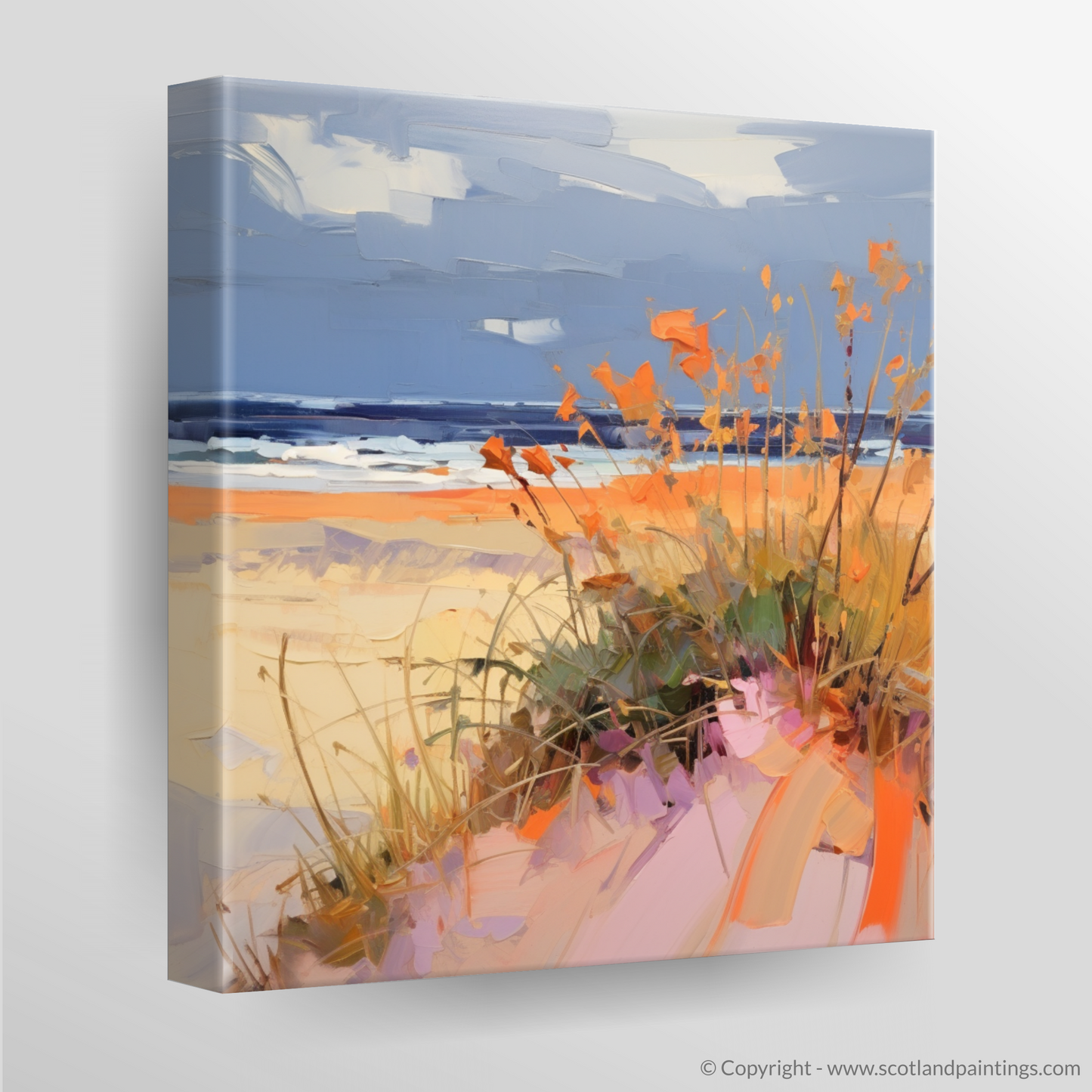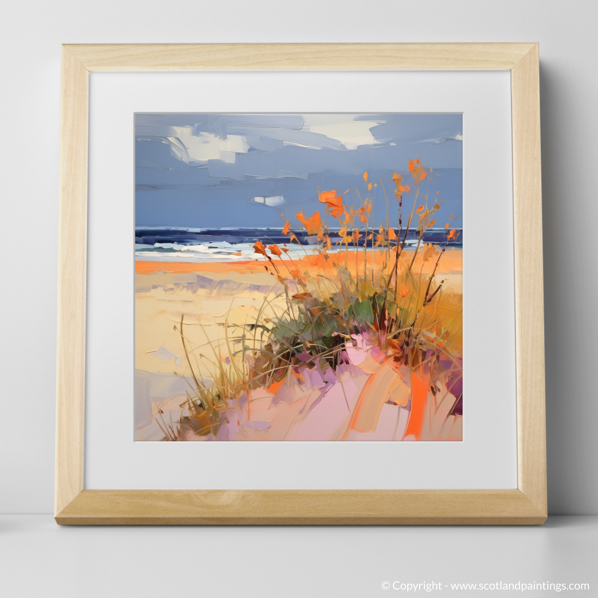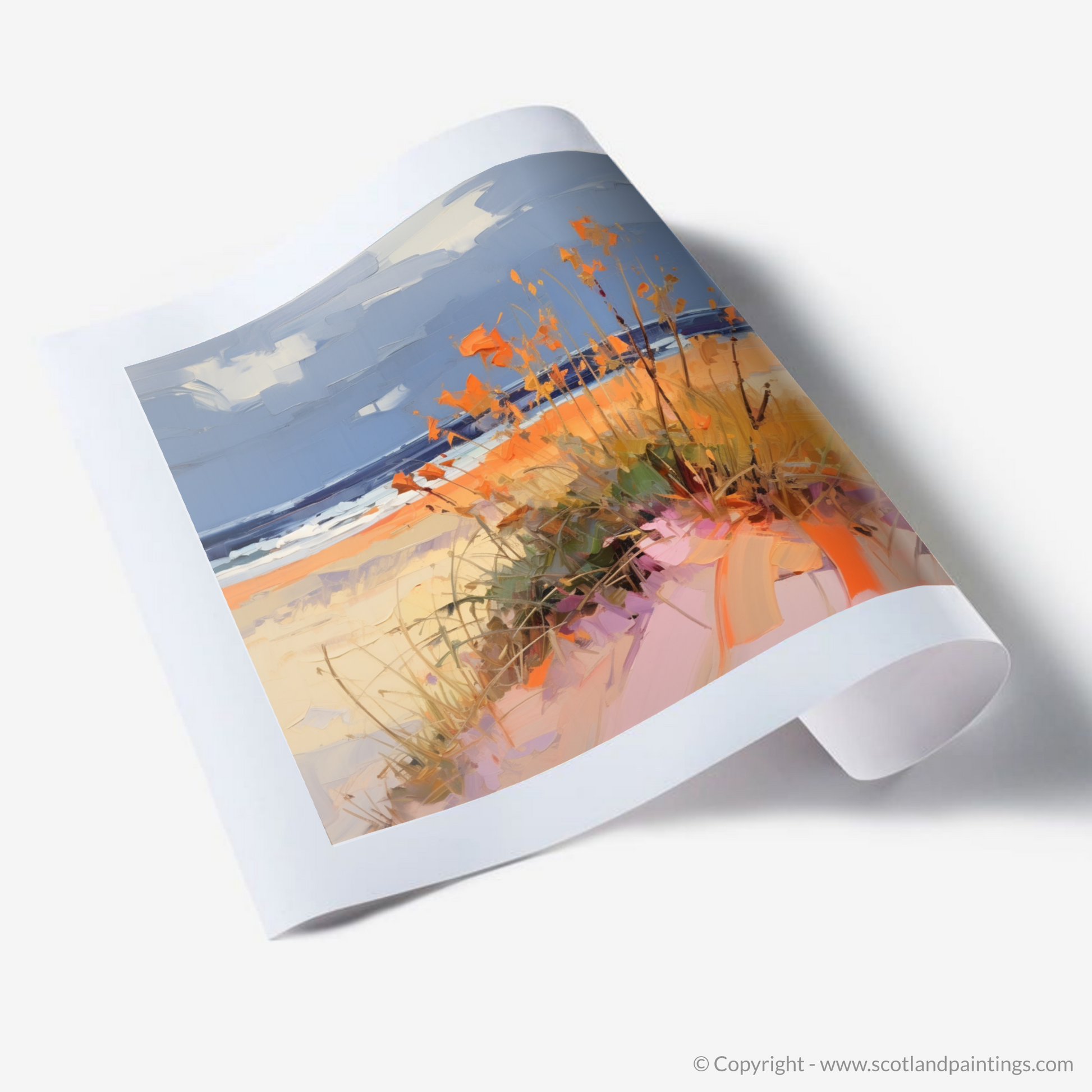 Drawing inspiration from the natural beauty that adorns Balmedie Beach, this exquisite print brings to life the wild elegance of Sea rocket blossoms against the windswept dunes of Aberdeenshire. The eye-catching, contemporary piece captures the vibrant hues of the coastal landscape, engaging the observer with a palette where the warm shades of orange, tawny yellows, and soft pinks contrast with the calming blues and purples on the horizon.