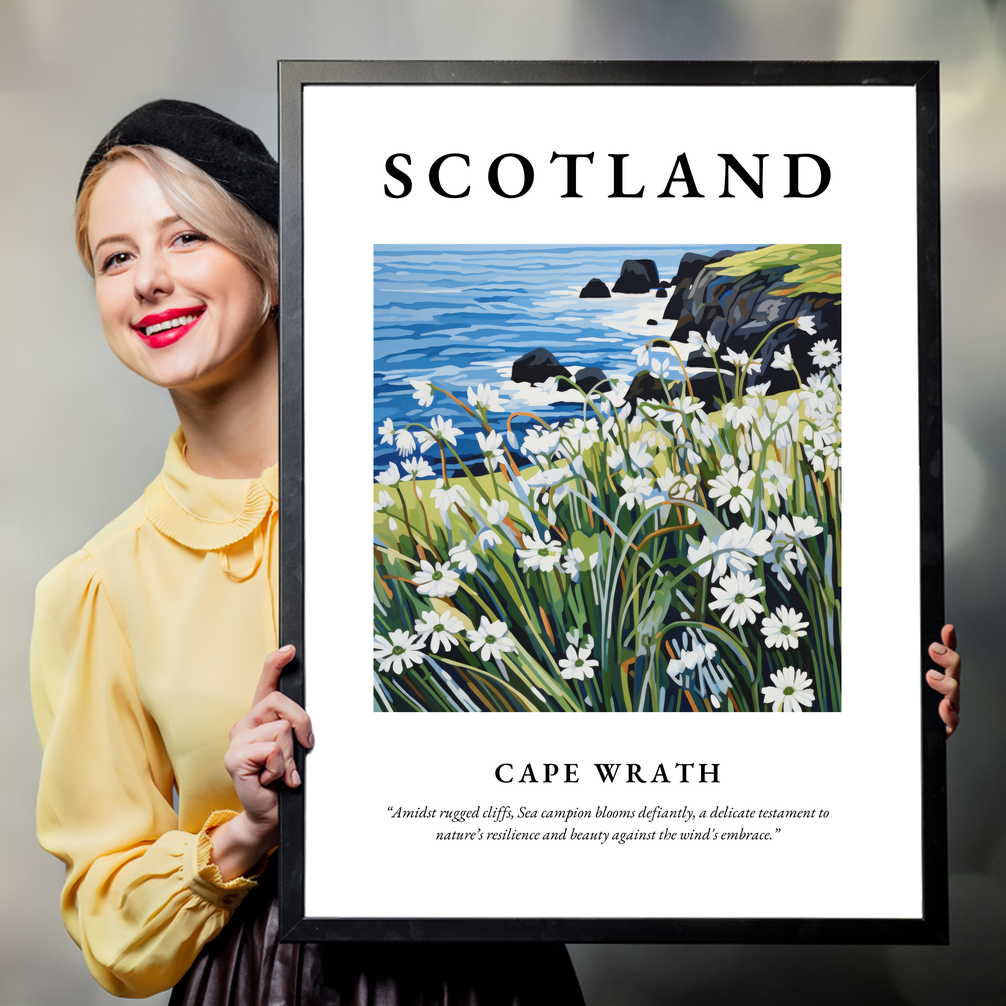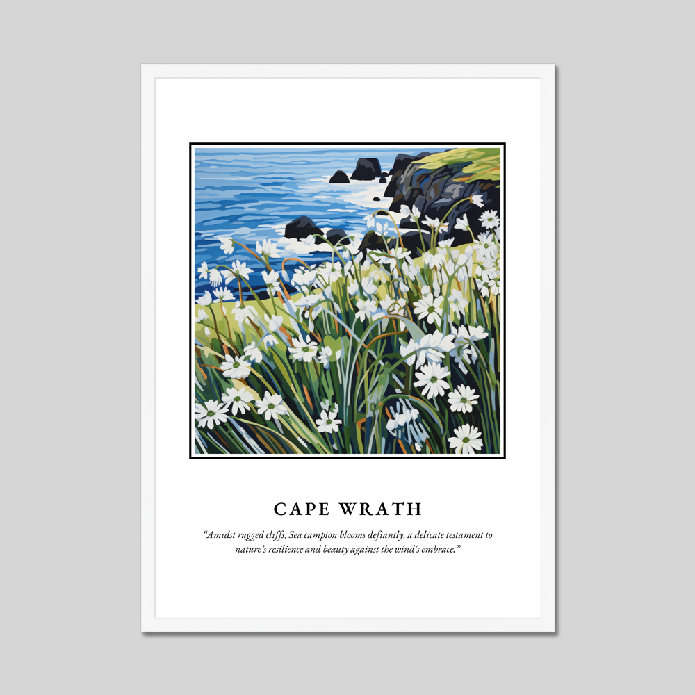 At the top, "SCOTLAND" is emblazoned in bold lettering, immediately evoking a sense of national pride and wonder. The central painting depicts Cape Wrath, a place of dramatic cliffs and sea views. Through sweeping brushstrokes and a vibrant palette, the abstract art style invites viewers to feel the wind’s embrace and the salty spray of the North Atlantic. The foreground features the delicate beauty of sea campion, blooming defiantly amidst the rugged landscape. Beneath the painting, a poignant quote reads: “Amidst rugged cliffs, Sea campion blooms defiantly, a delicate testament to nature’s resilience and beauty against the wind's embrace,” encapsulating the essence of this spectacular location.