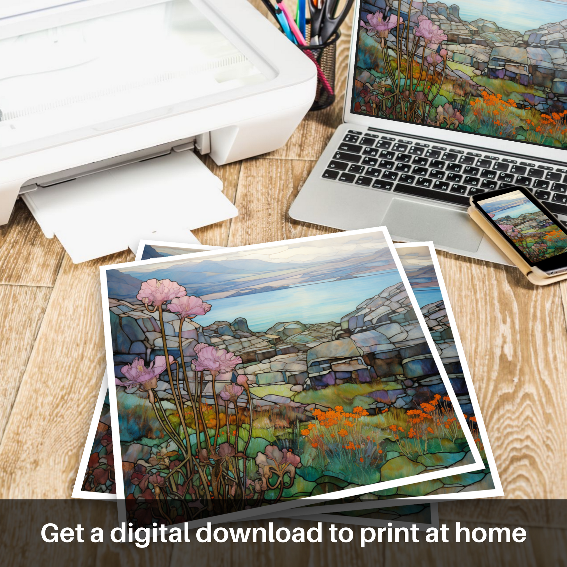 This print offers a journey for the eyes, inviting the viewer to explore each element and appreciate the serene beauty of Scotland's unique flora and formidable cliffs. An art piece that not only serves as a decorative addition to any space but also a reminder of the timeless allure found within nature's own gallery.