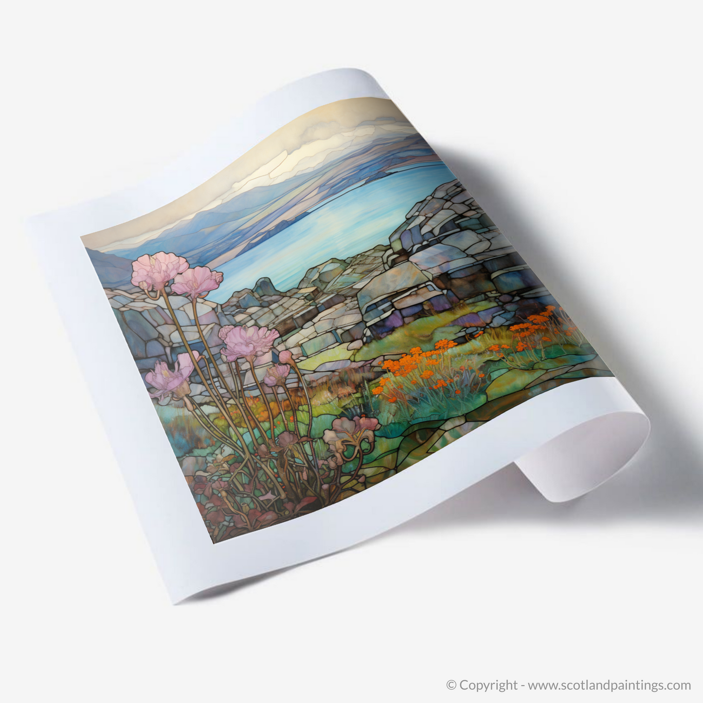 An ode to the serene beauty of the Scottish wilderness, this exquisite print captures the enchanting Roseroot herb poised against the natural majesty of Ben More, Isle of Mull. Stylized in the distinctive sinuous curves and elegant motifs characteristic of Art Nouveau, the piece interweaves flora and landscape to create a symphony of colour and form.