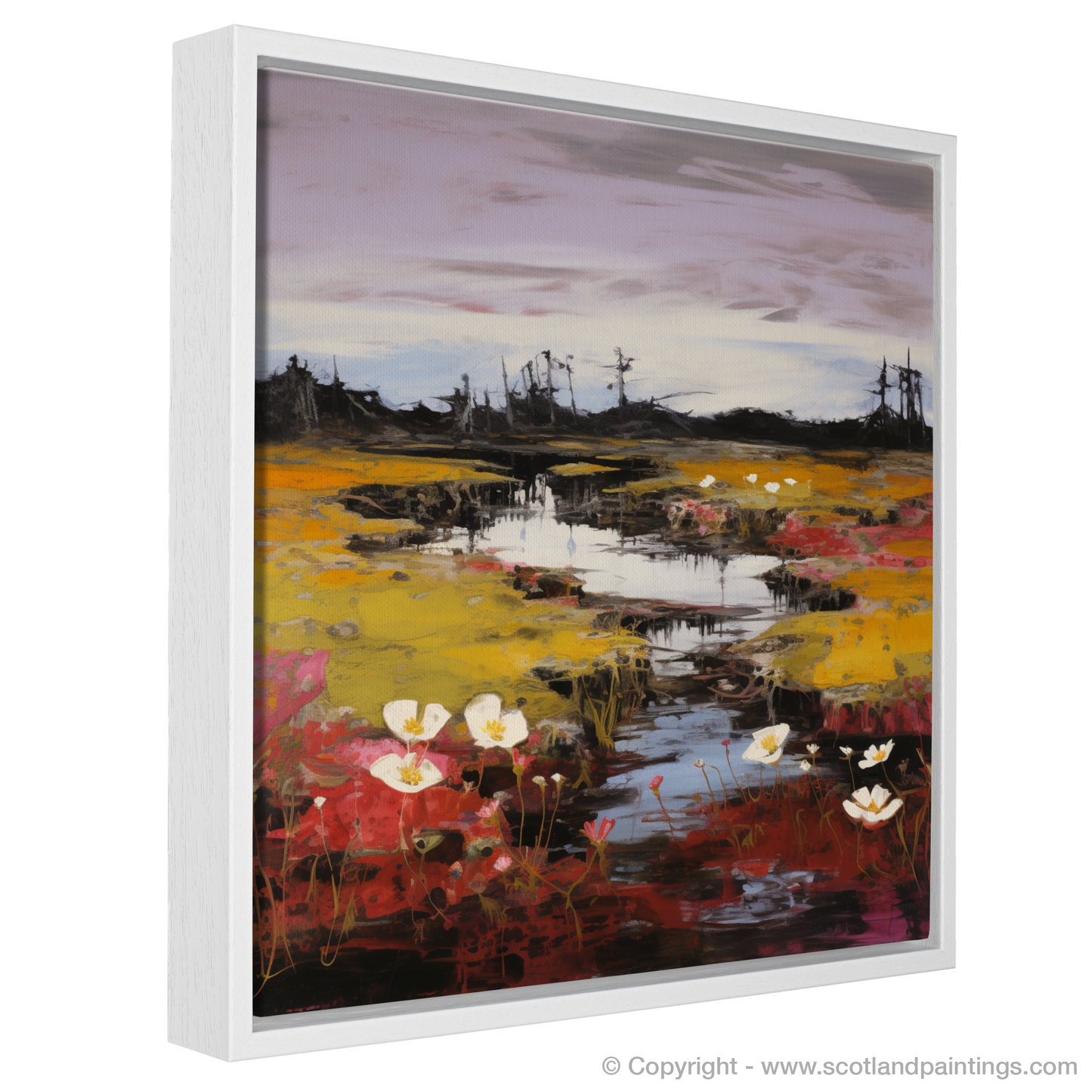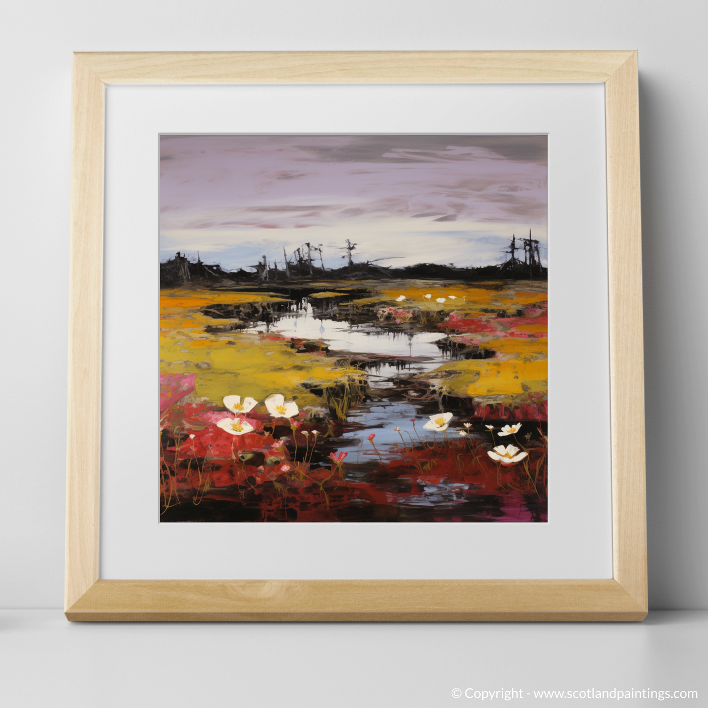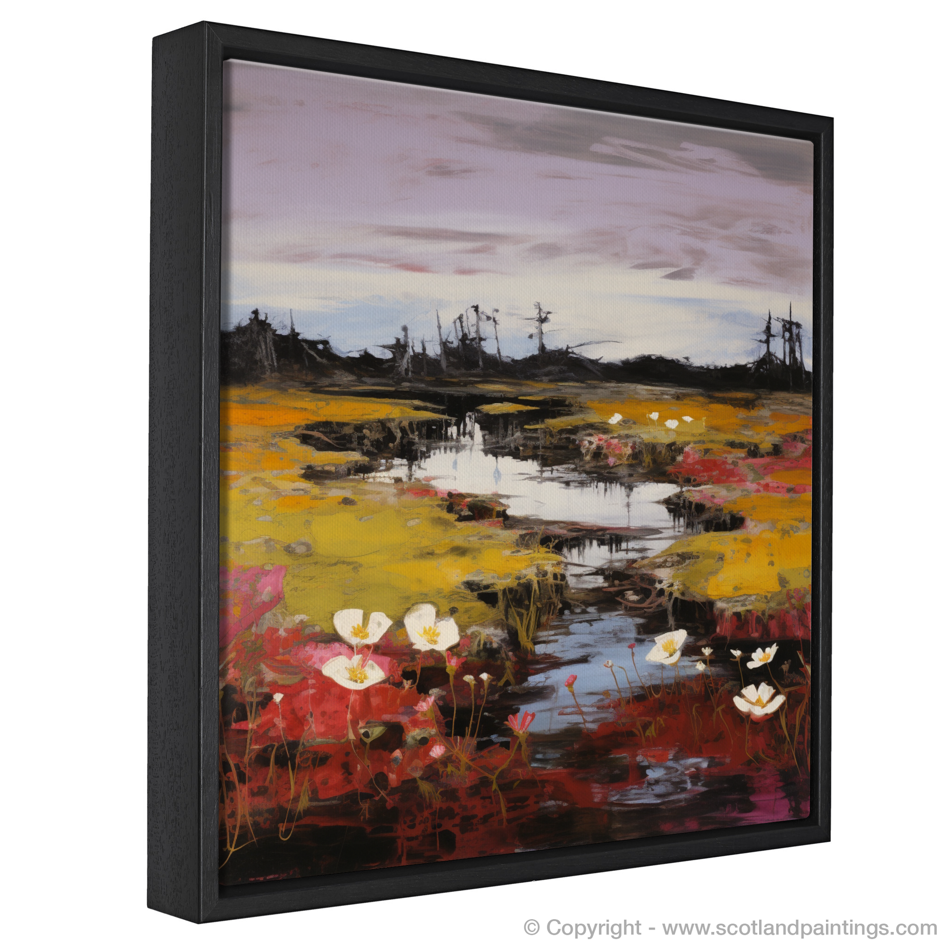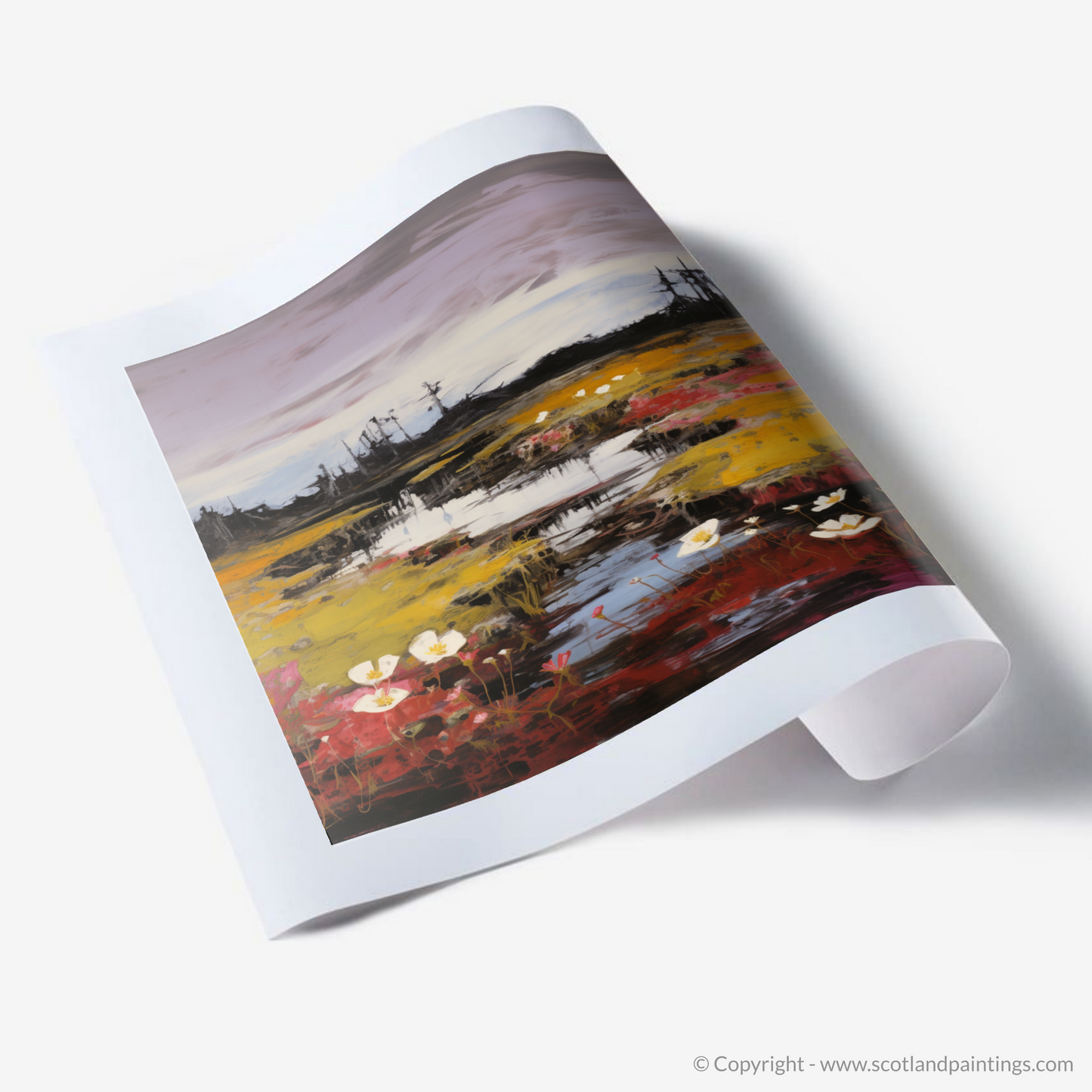 Immerse yourself in the wild heart of Scotland with this evocative print, where the natural charm of Rannoch Moor's flora is captured through bold brushstrokes and a vivid abstract impressionist approach. Splashes of intense colour bring to life the unique specimens of bog cotton, sundew, and butterwort, each bloom seemingly dancing above the dark, peaty waters that reflect the sky's moody hues.