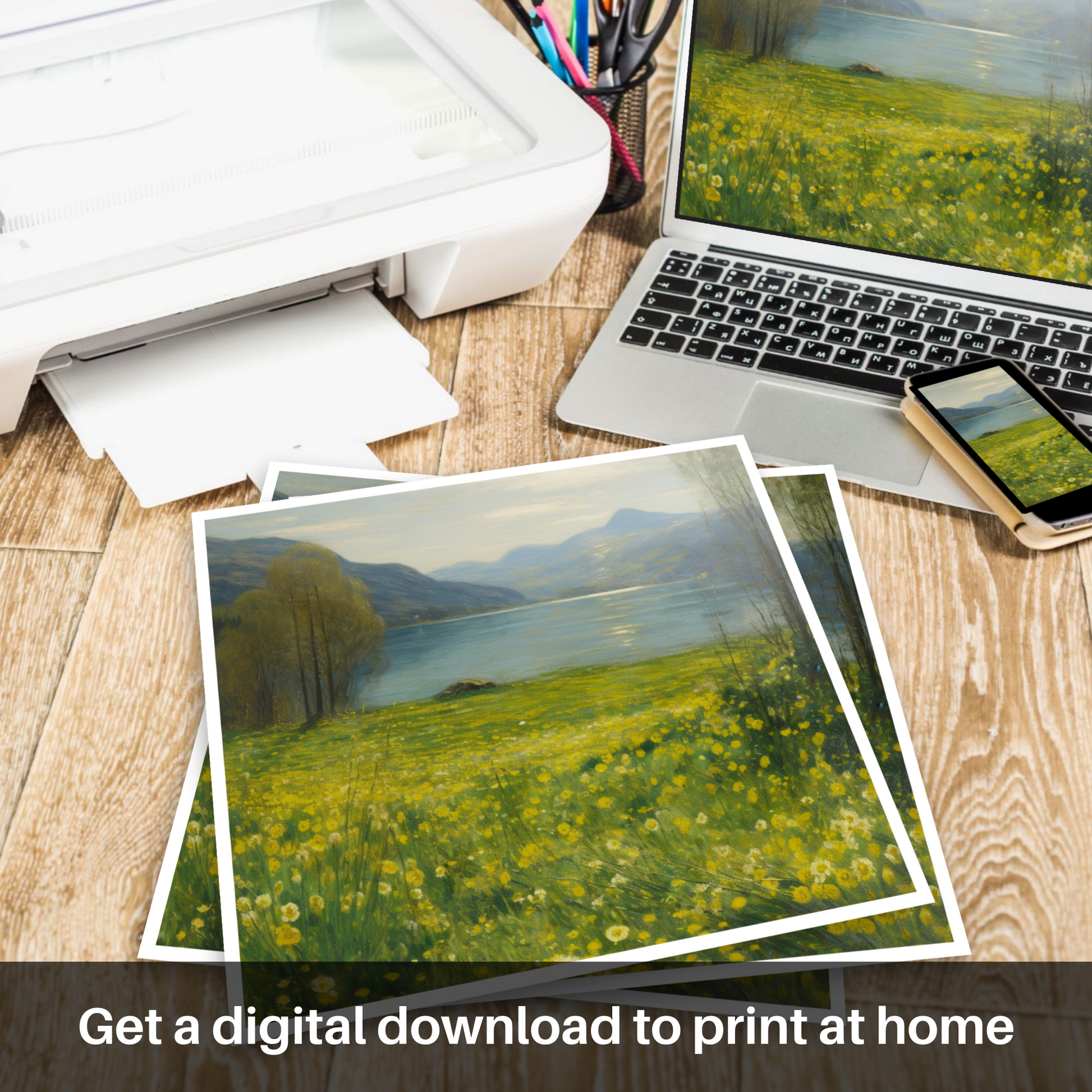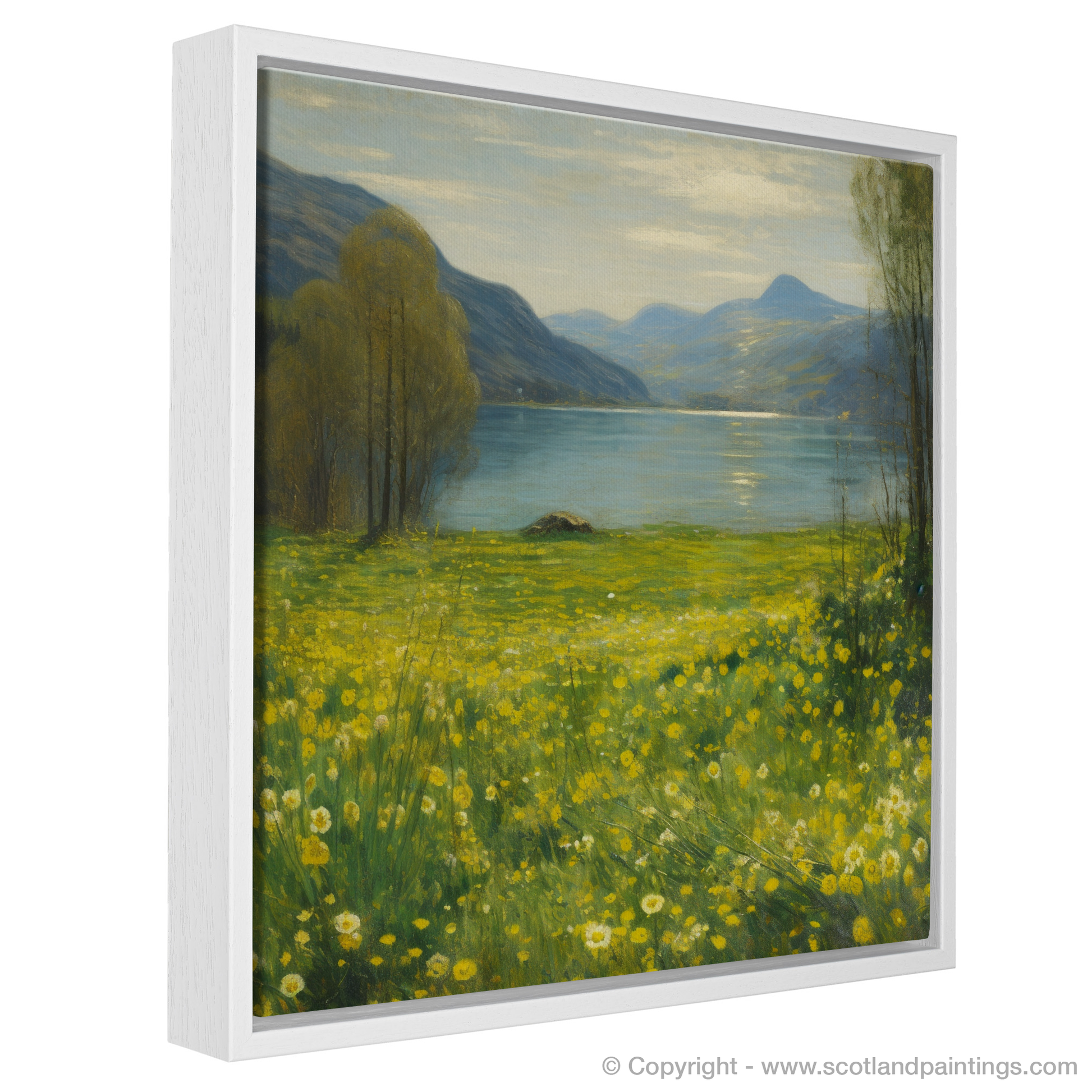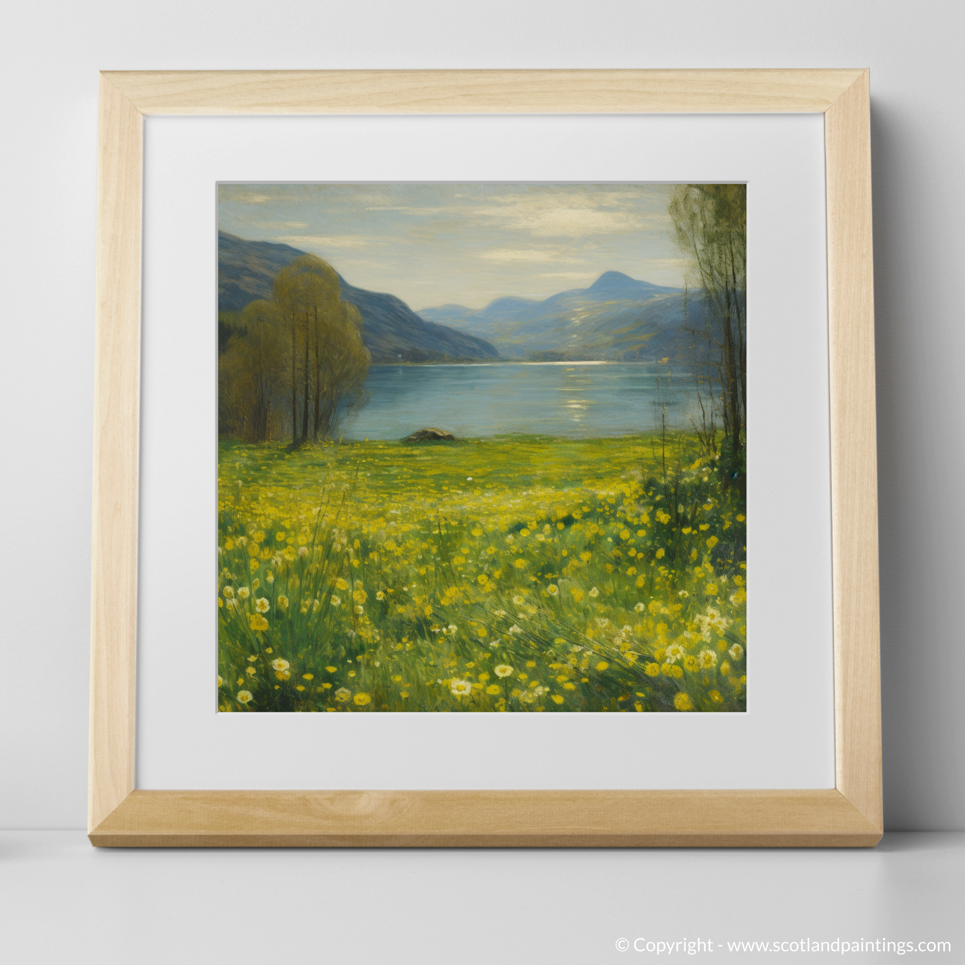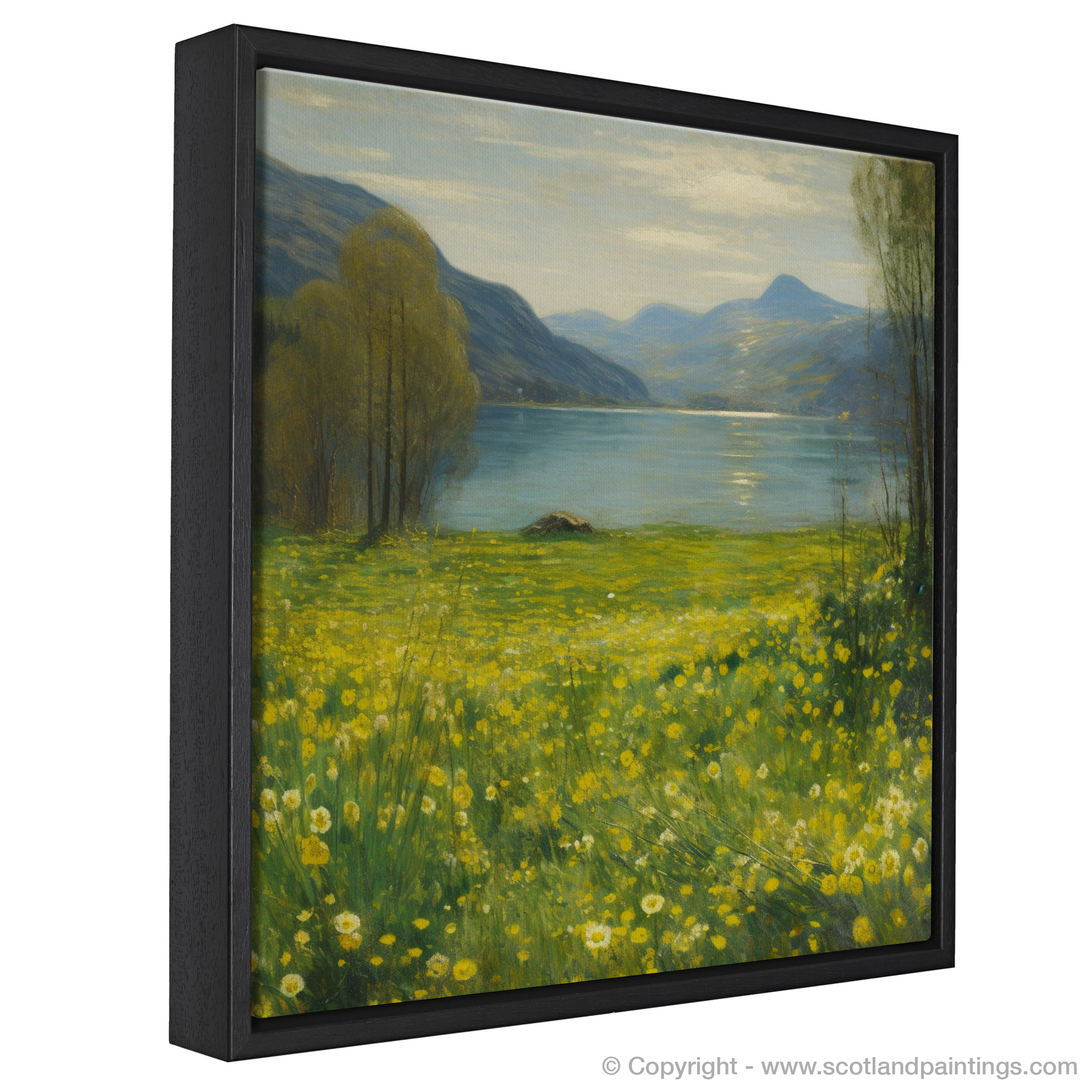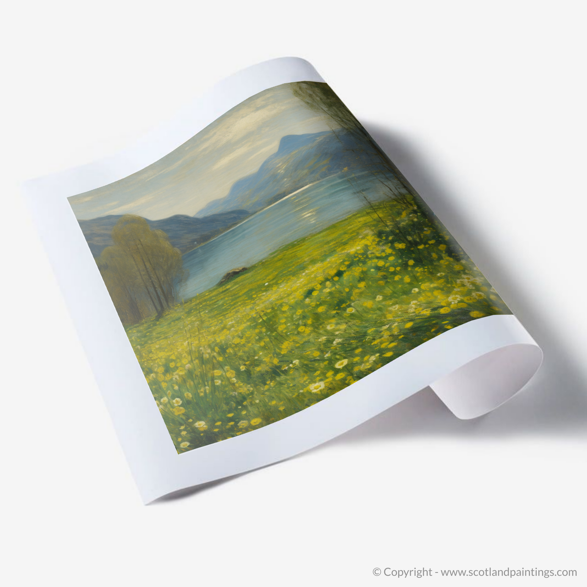 Immerse yourself in the tranquillity of Scotland’s natural beauty with this enchanting impressionistic piece. It captures the vibrant yellow hues of Lesser celandine sprinkled along the refulgent meadow banks of the majestic Loch Tay. The verdant greens of the meadow grass, intertwined with the golden flowers, invite the viewer into a serene, pastoral world, where the simplicity of nature brings peace and joy.