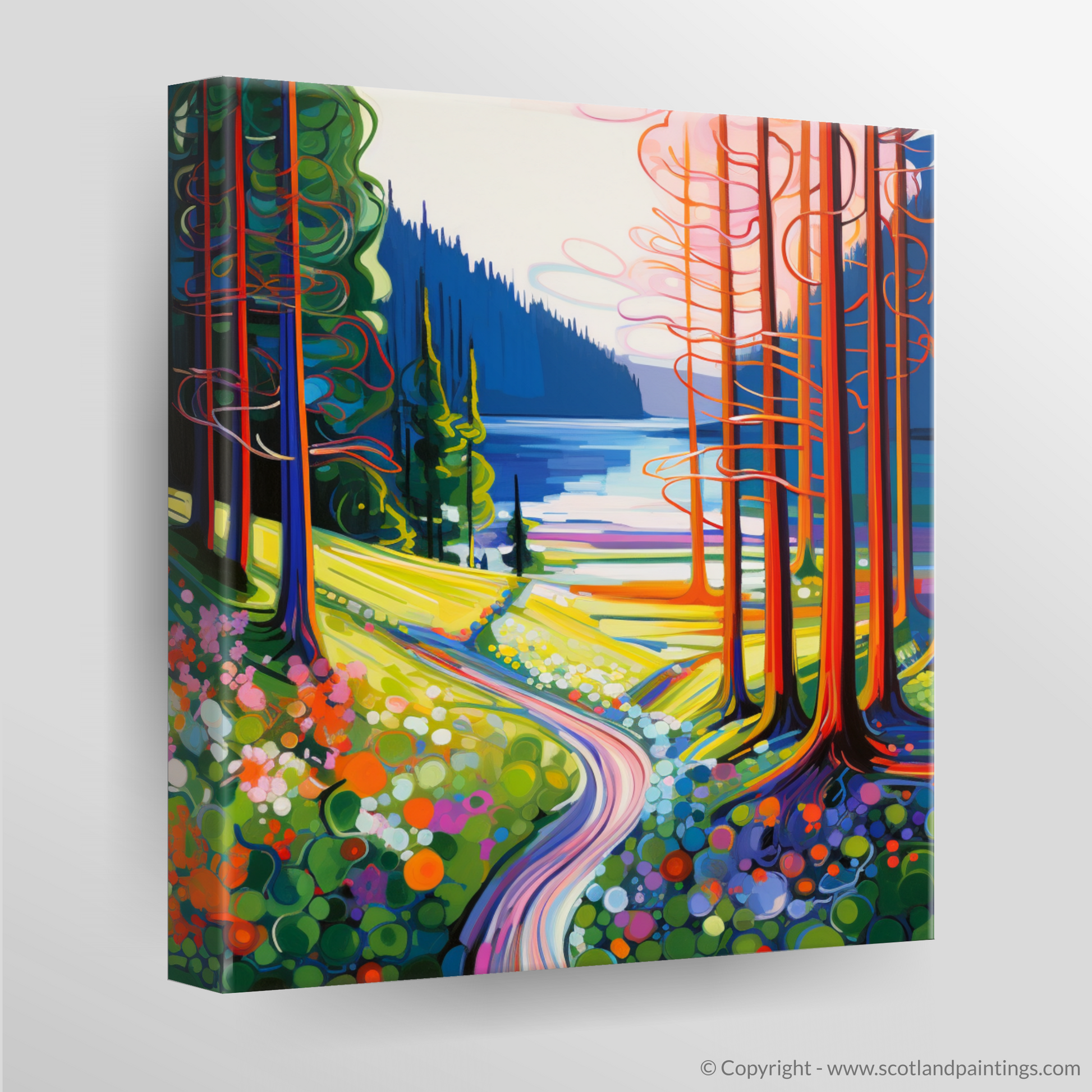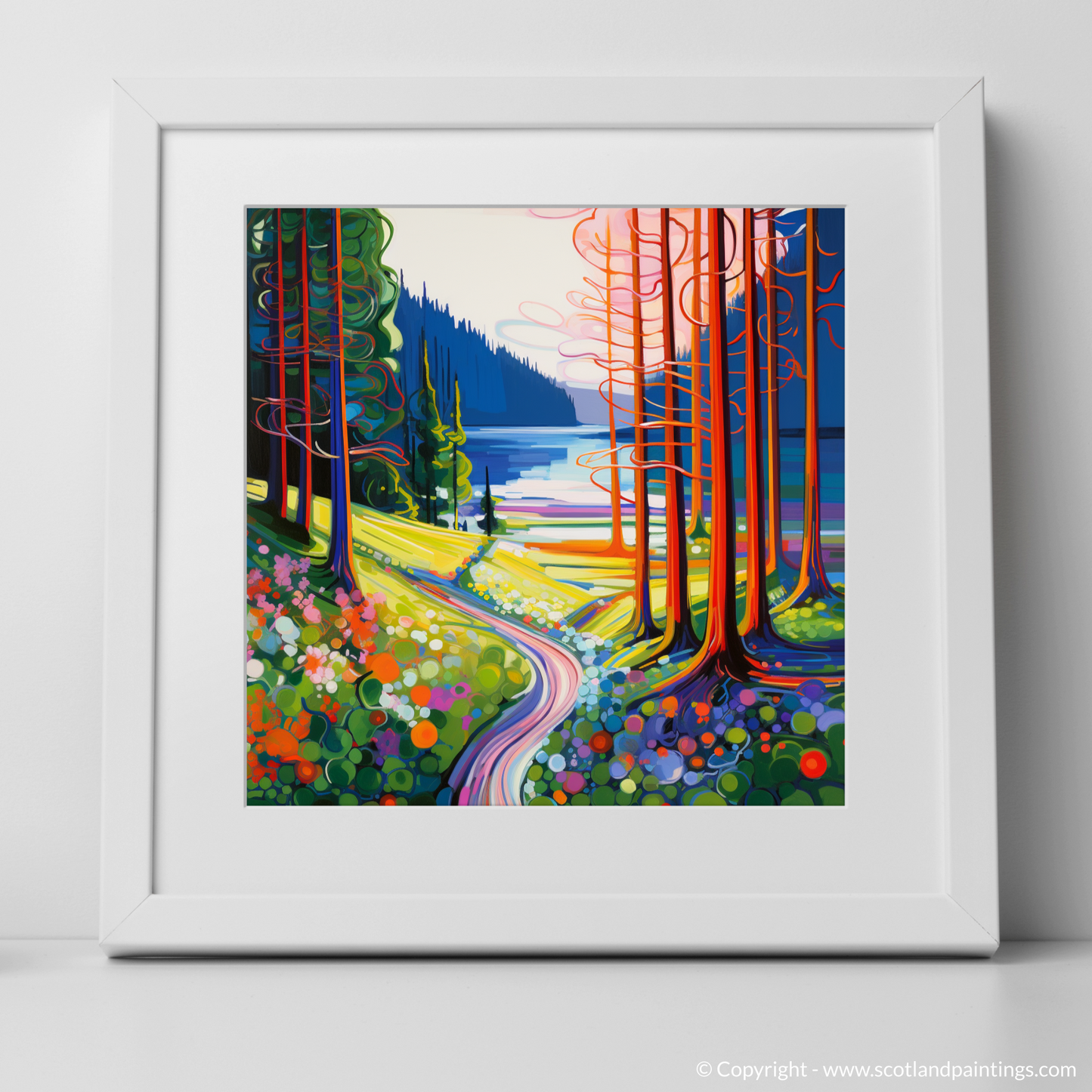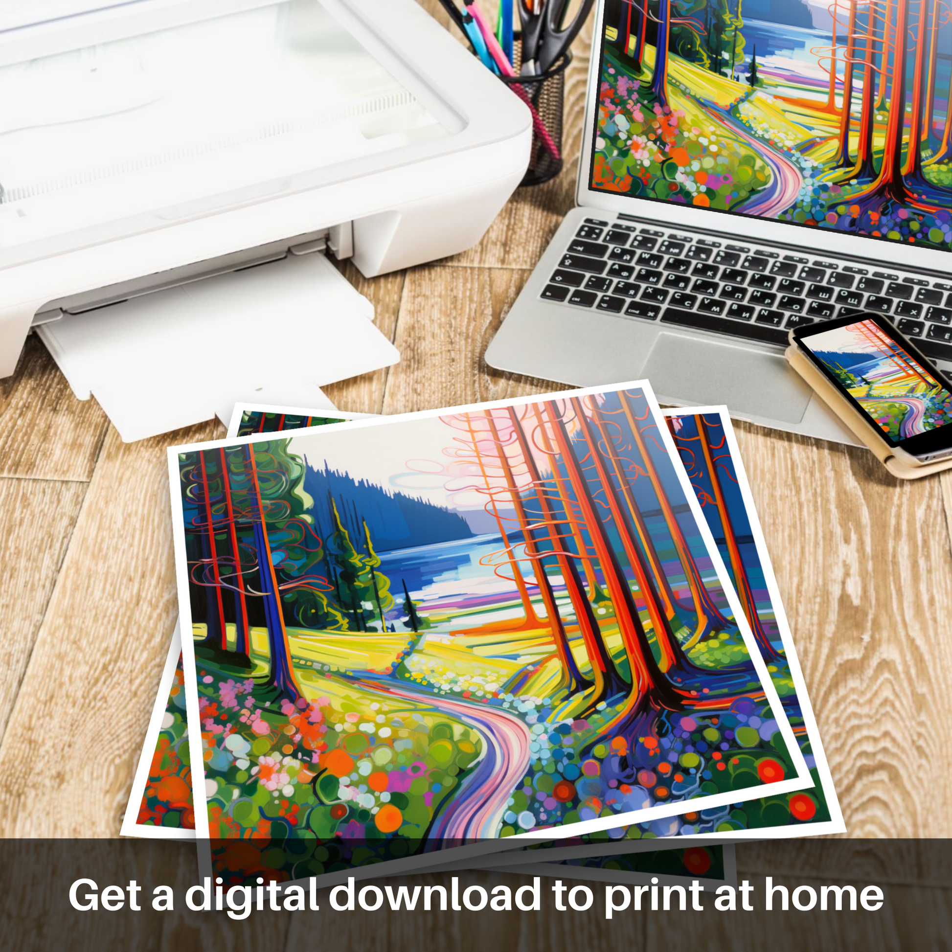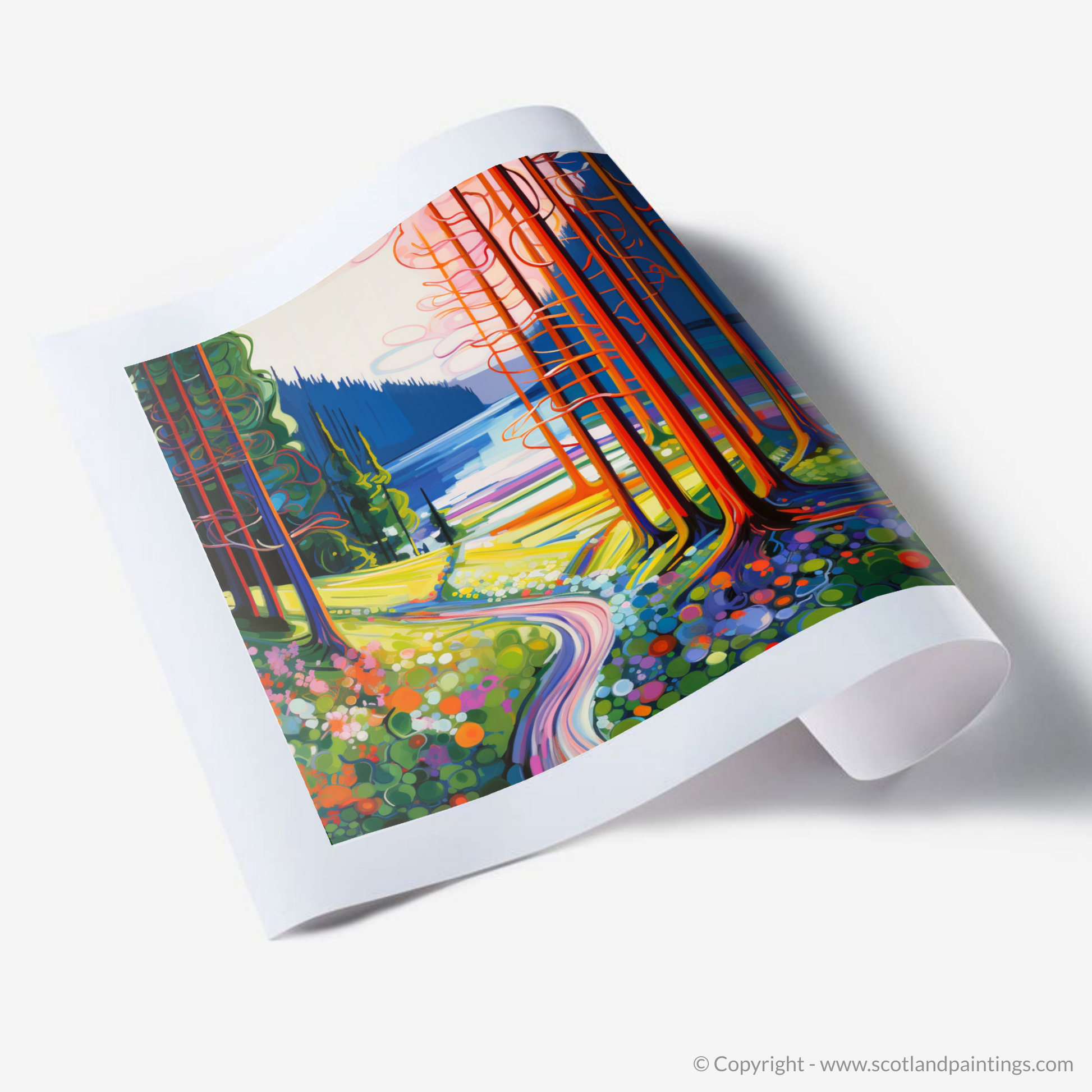 Immerse yourself in the vibrant allure of the Scottish woodlands with this captivating Pop Art styled print that draws inspiration from the idyllic surroundings of Loch Ness. Brushes of bold, expressive colors dance across the canvas, capturing the Speedwell that carpets the forest floor in a myriad of hues. Swirls of pink and aqua invigorate the sky, as if reimagining the wild Scottish atmosphere in a dreamlike state.