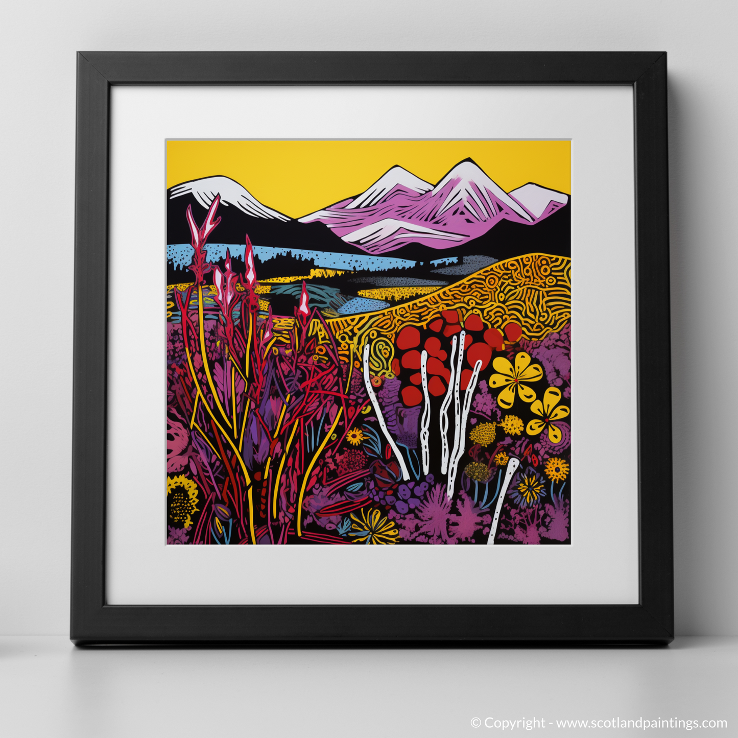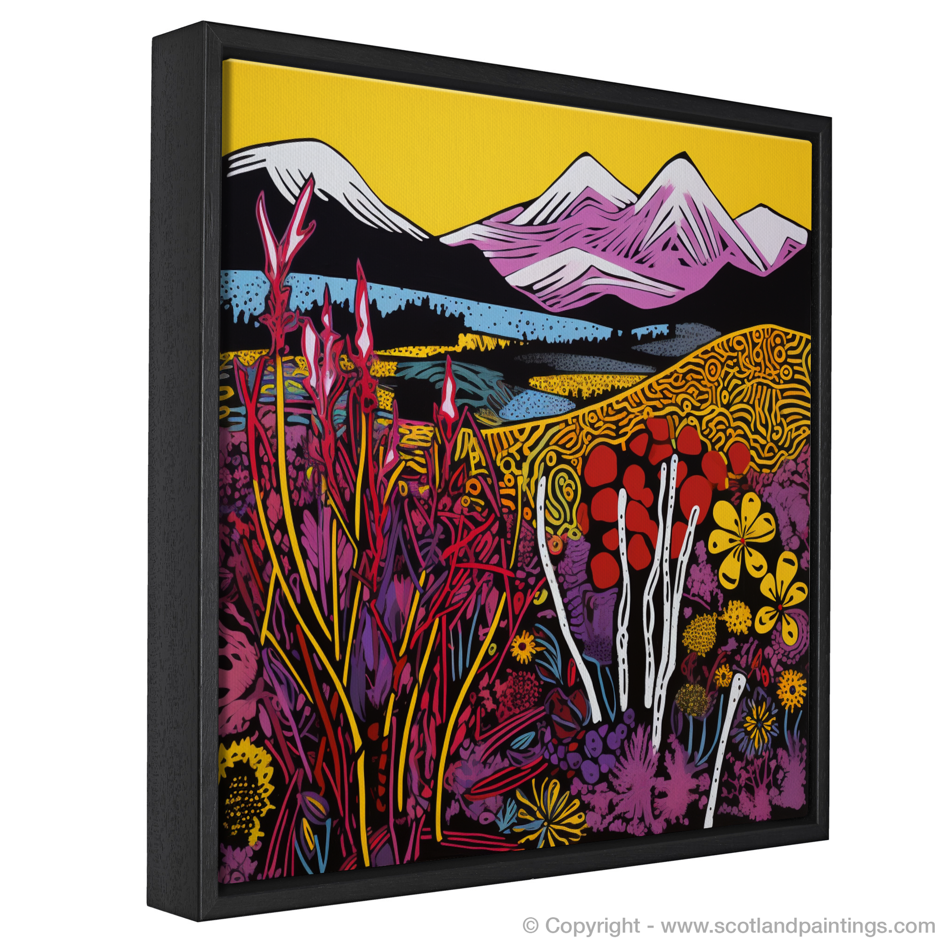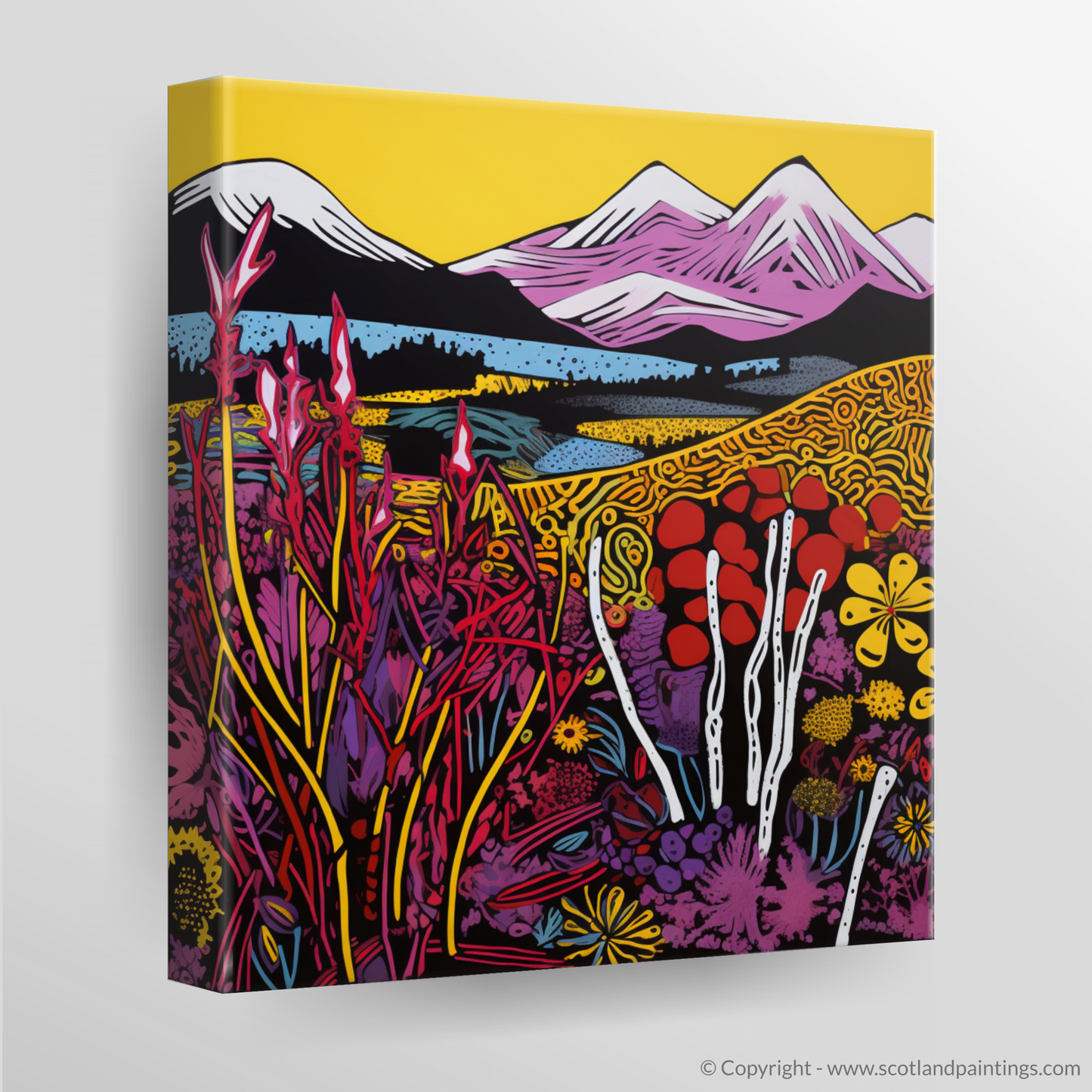 Immerse yourself in the vibrant essence of the Isle of Skye moorlands with a striking print that showcases the unique beauty of Scottish flora. The piece is a dazzling amalgamation of contrasting hues and bold outlines, capturing the vivacious spirit of pop art.