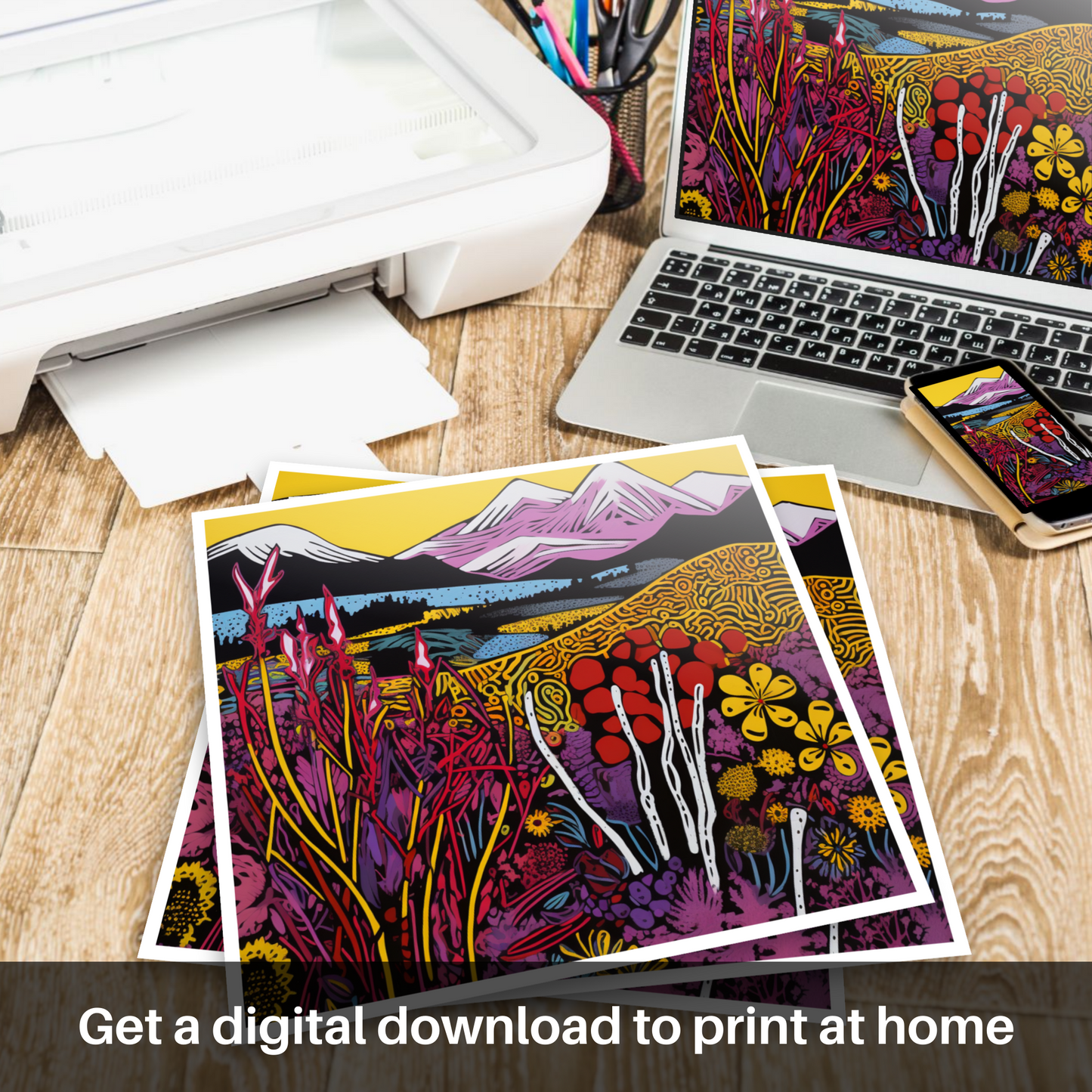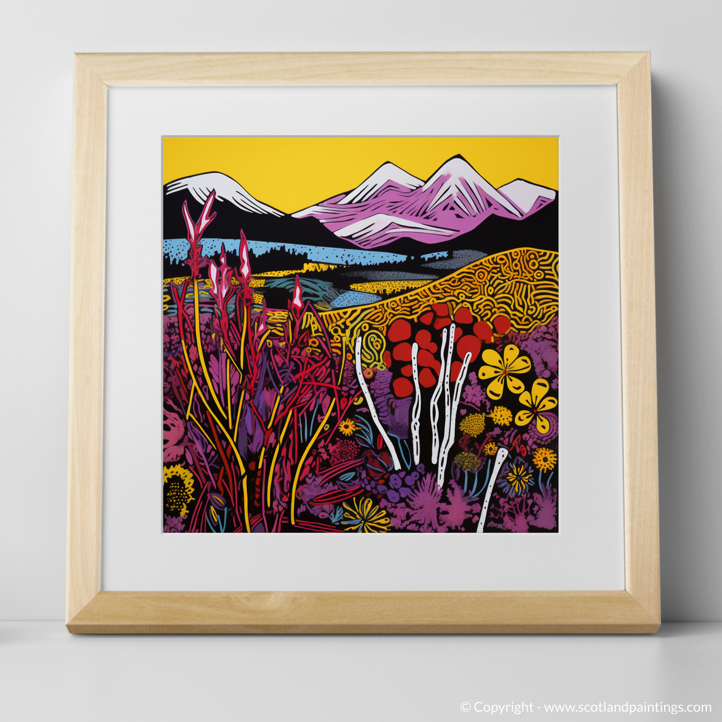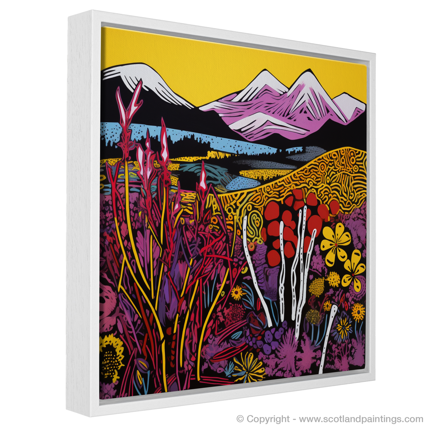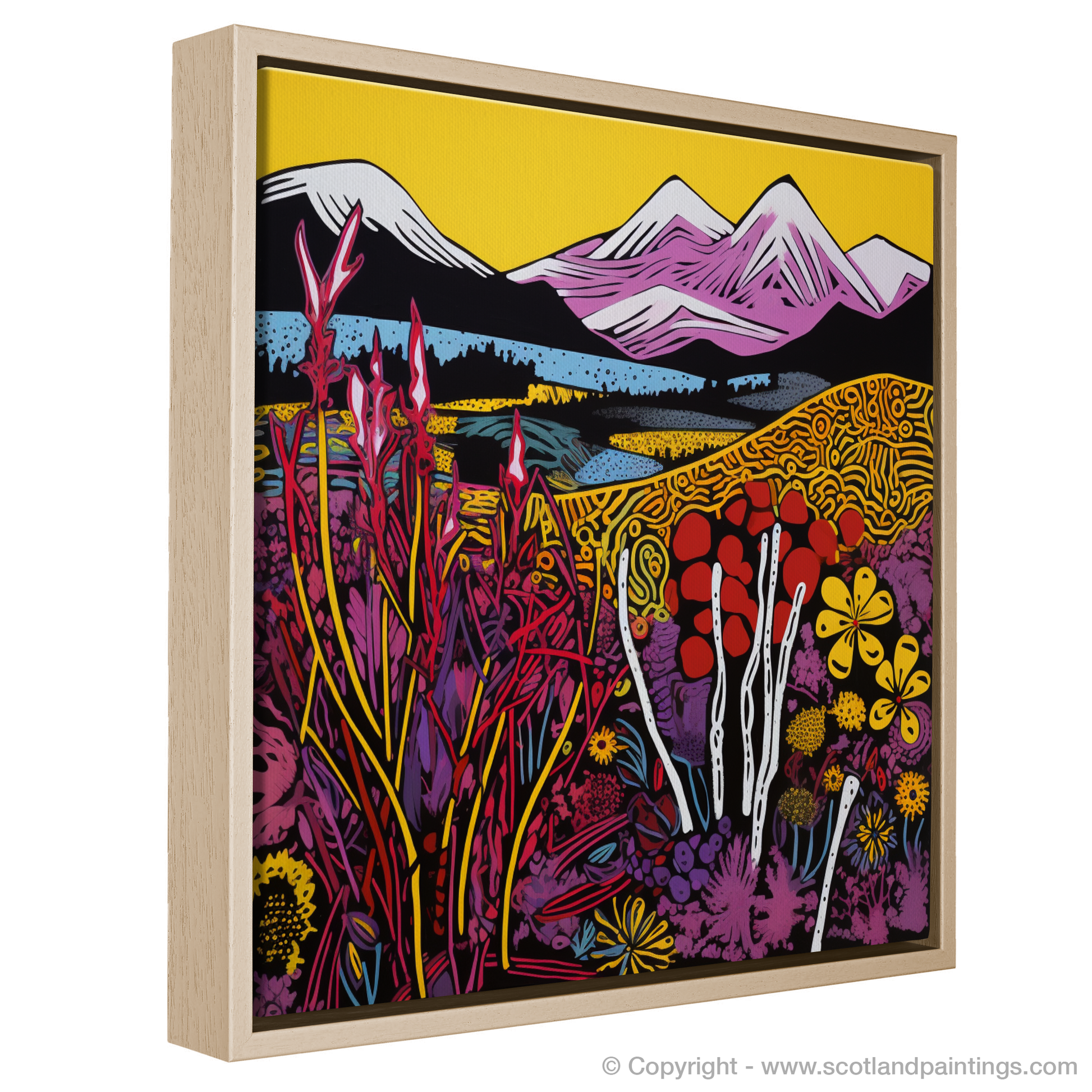 Immerse yourself in the vibrant essence of the Isle of Skye moorlands with a striking print that showcases the unique beauty of Scottish flora. The piece is a dazzling amalgamation of contrasting hues and bold outlines, capturing the vivacious spirit of pop art.
