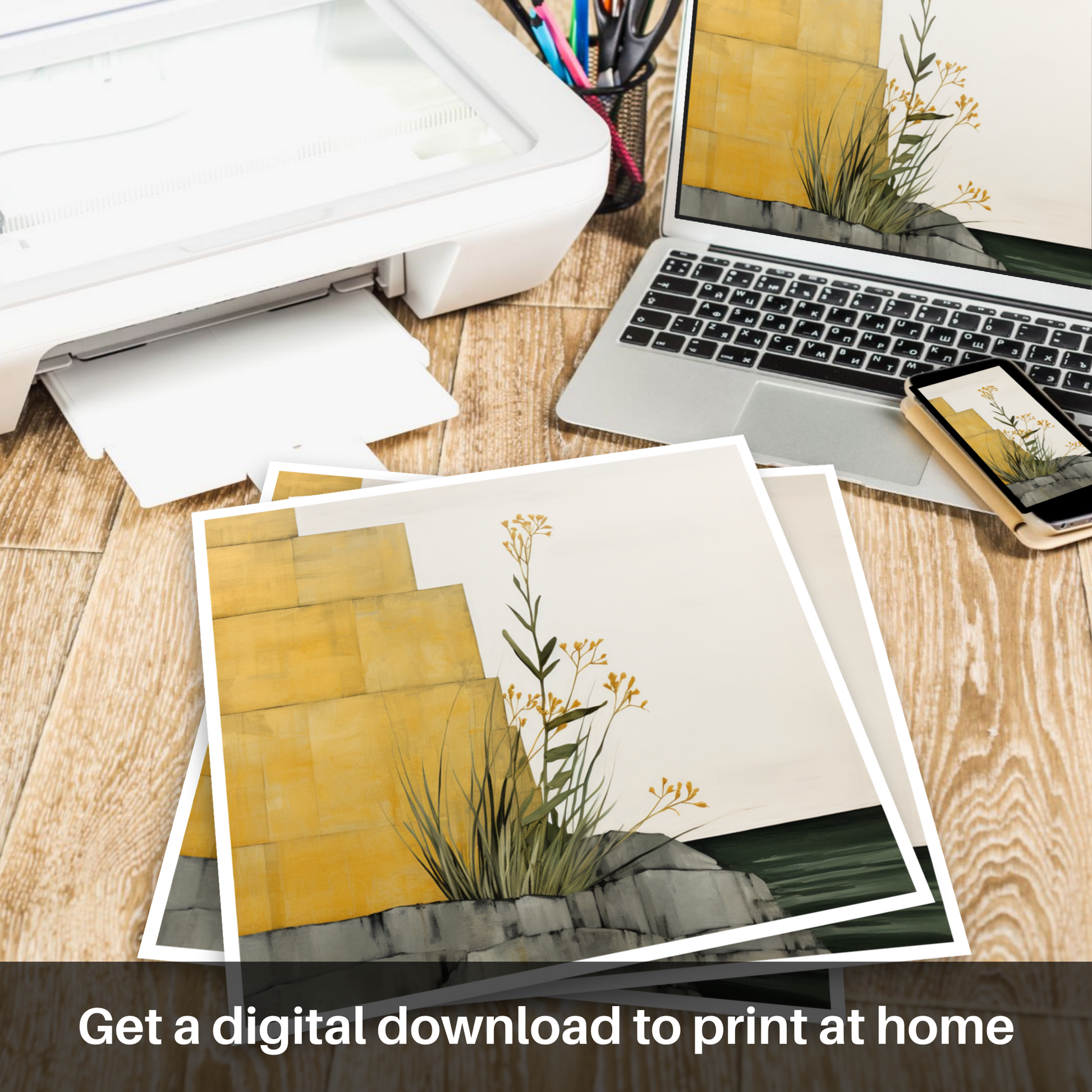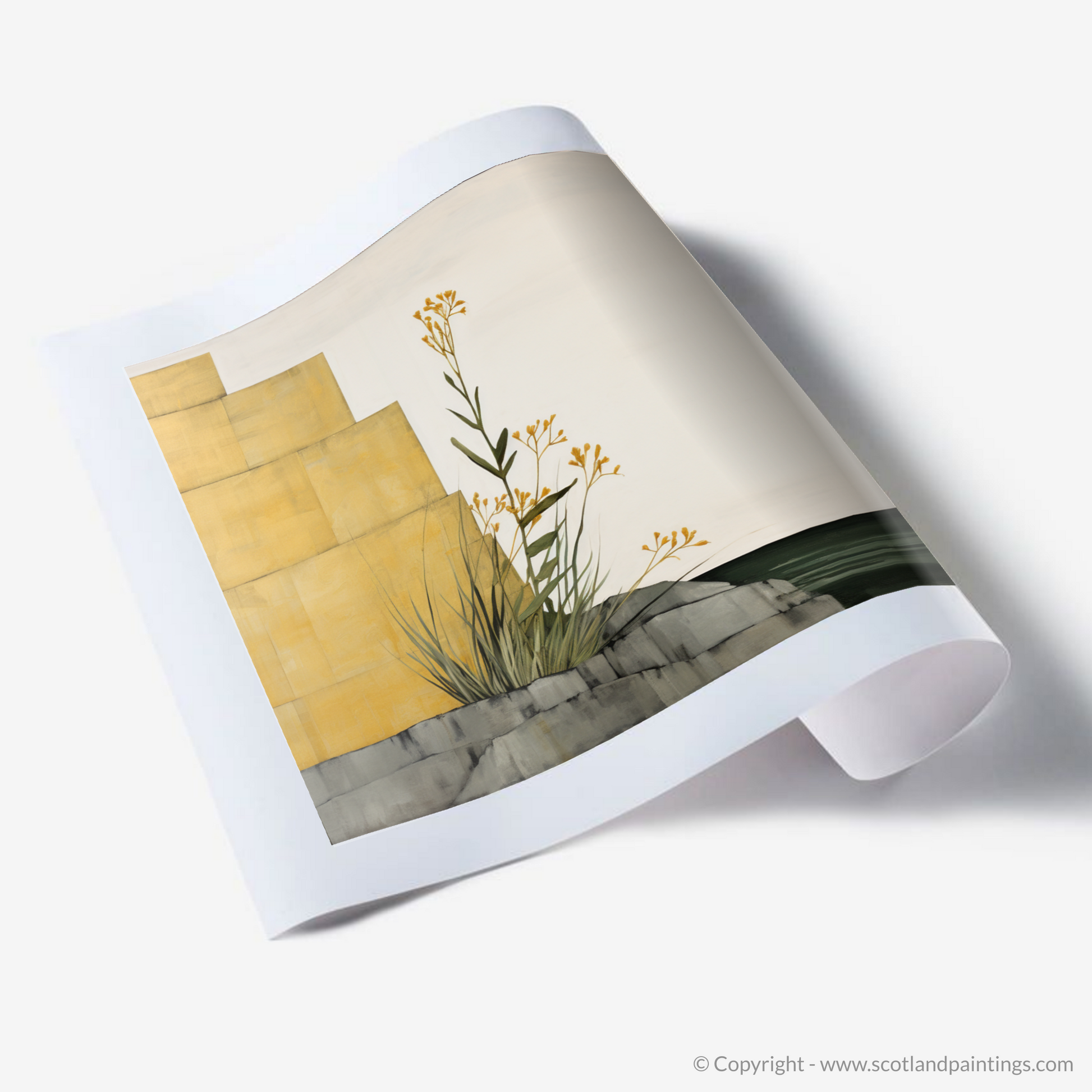 The beauty of the Scottish coastline is distilled into basic shapes and blocks of colour, underscoring the resilience of local flora flourishing in the face of harsh coastal winds. The composition masterfully juxtaposes the organic forms of the samphire with the architectural lines and rectangles evoking the cliffs, reflecting a harmonious balance between nature and structure. This artwork promises to offer a statement of tranquility and understated elegance, perfect for those who seek to bring a touch of Scotland's natural splendour into their living or working spaces. Whether for a lover of botany, a devotee of minimalism, or an aficionado of Scottish landscapes, this print is poised to enchant and inspire.