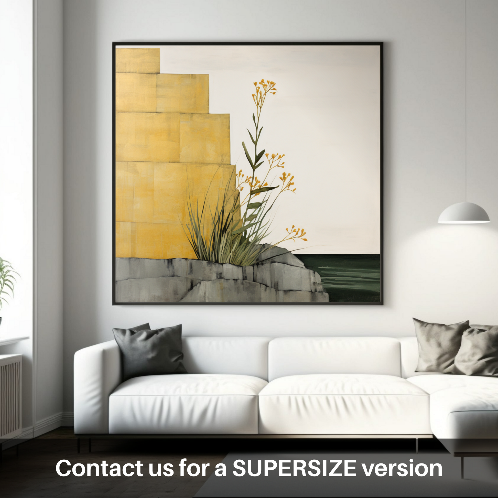Imbued with an aura of serene simplicity, this minimalist piece captures the essence of the rugged beauty found on the cliffs of Berwick-upon-Tweed. Dominating the composition is a stylised representation of Golden Samphire, its slender stems and delicate blooms rising gracefully against the stark geometric contrast of the cliffs. The warm, amber tones of the plant's flowers are a breathtaking focal point amidst the subtle shades of grey and the deep, contemplative greens that symbolise the sturdy cliff base and churning sea below.