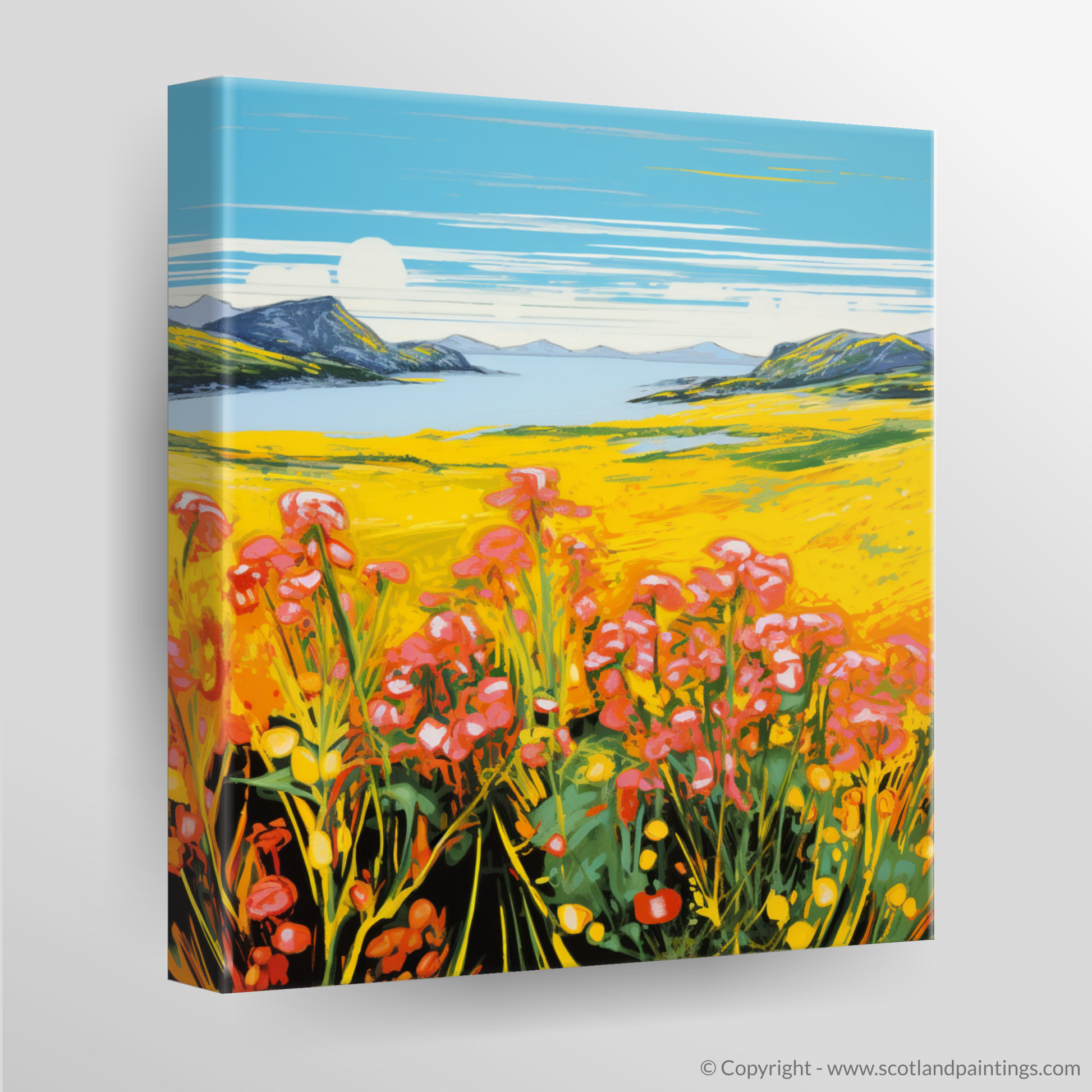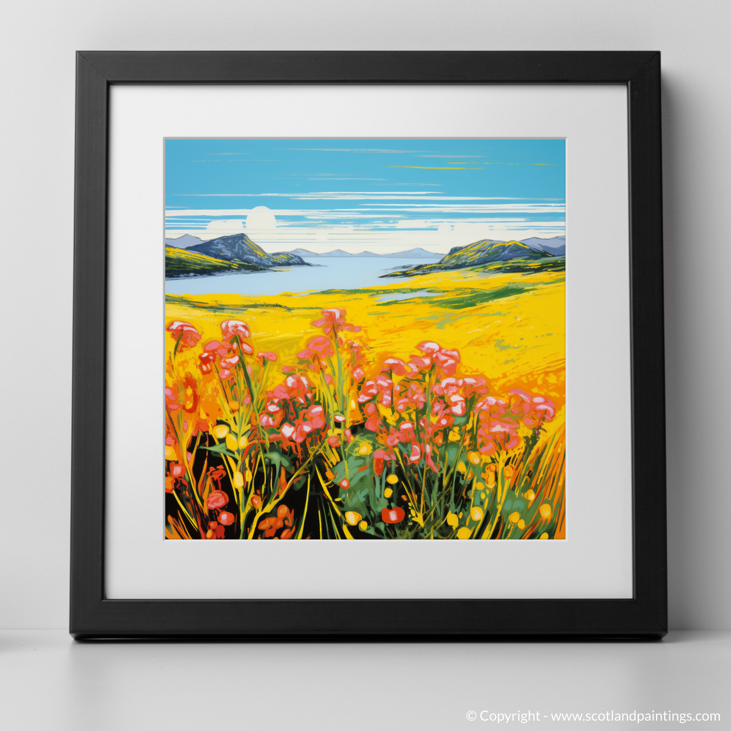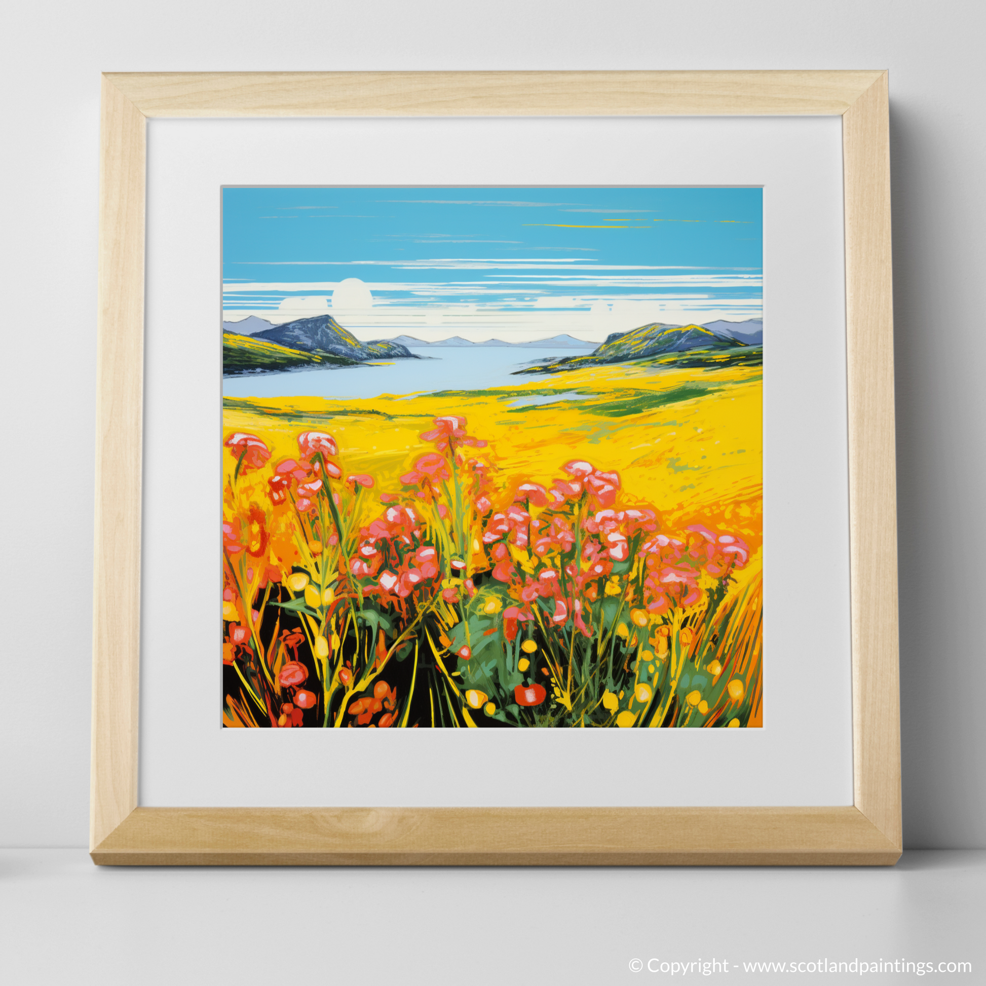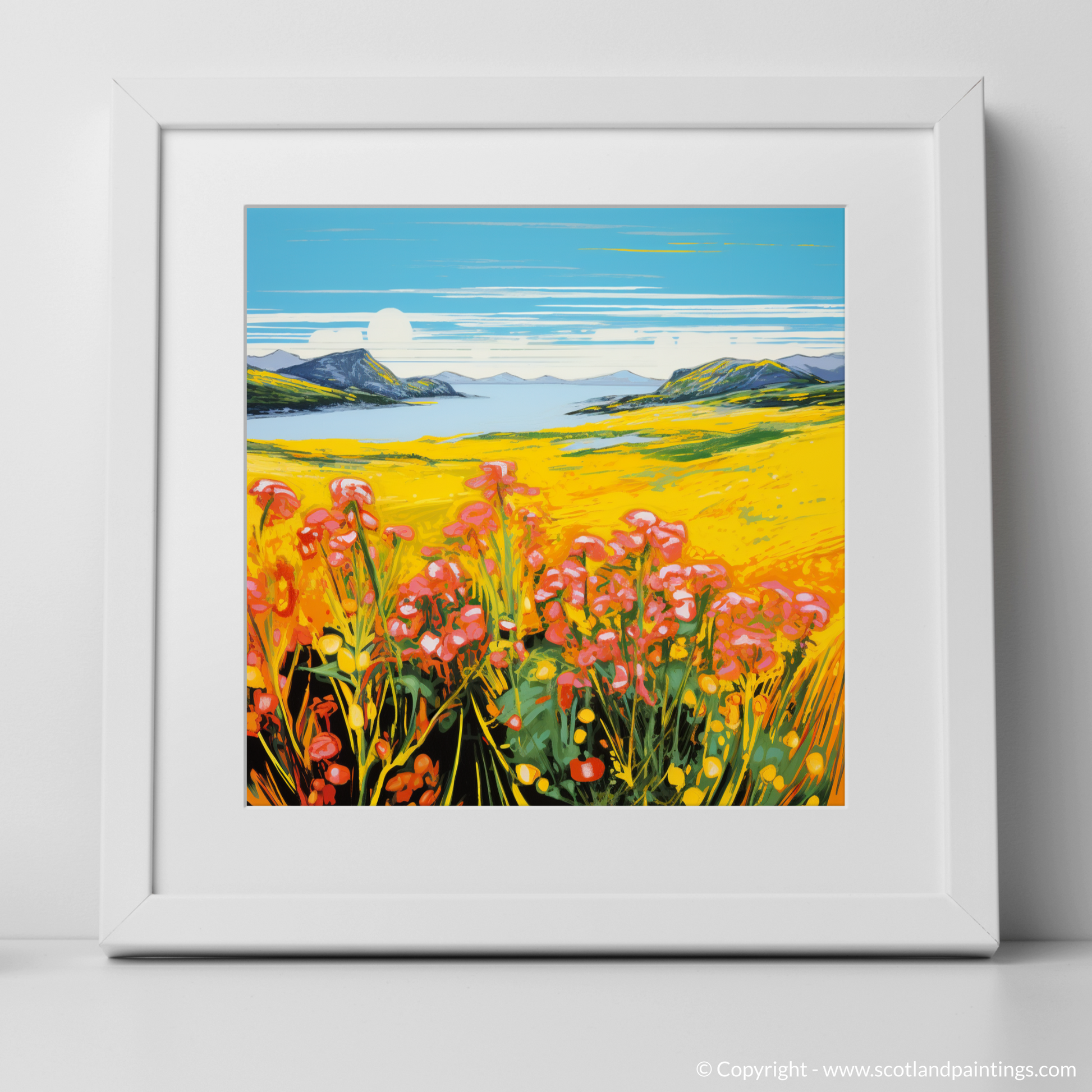 The print exudes an electrifying visual energy reminiscent of the Pop Art era, with its intense colour palette bringing to life the sweeping yellows of the flower-speckled meadows. Vivid pinks and reds of blossoms punctuate the scene, creating a striking contrast against the lush greens and deep blues that depict the Machair's harmonious surroundings.