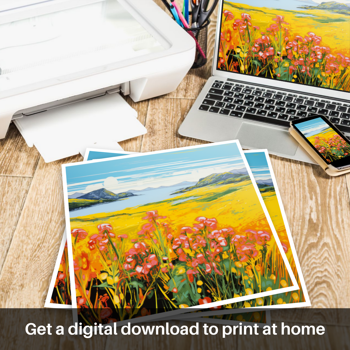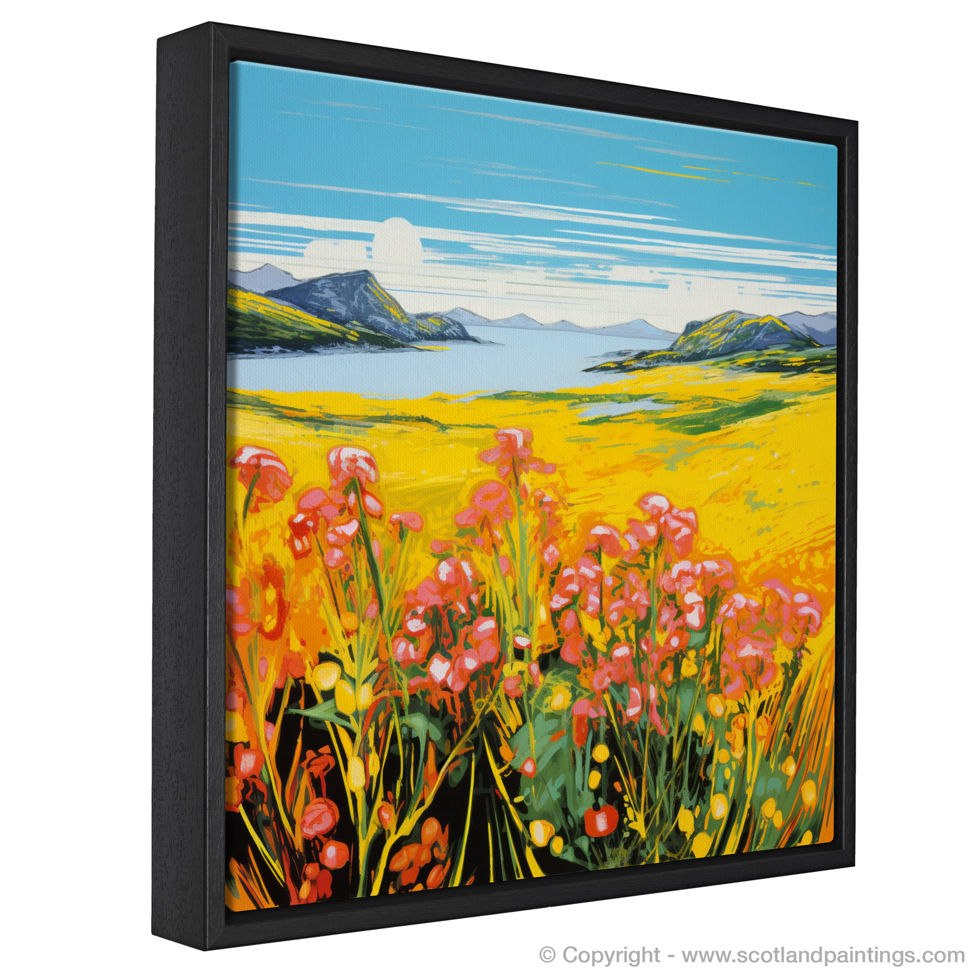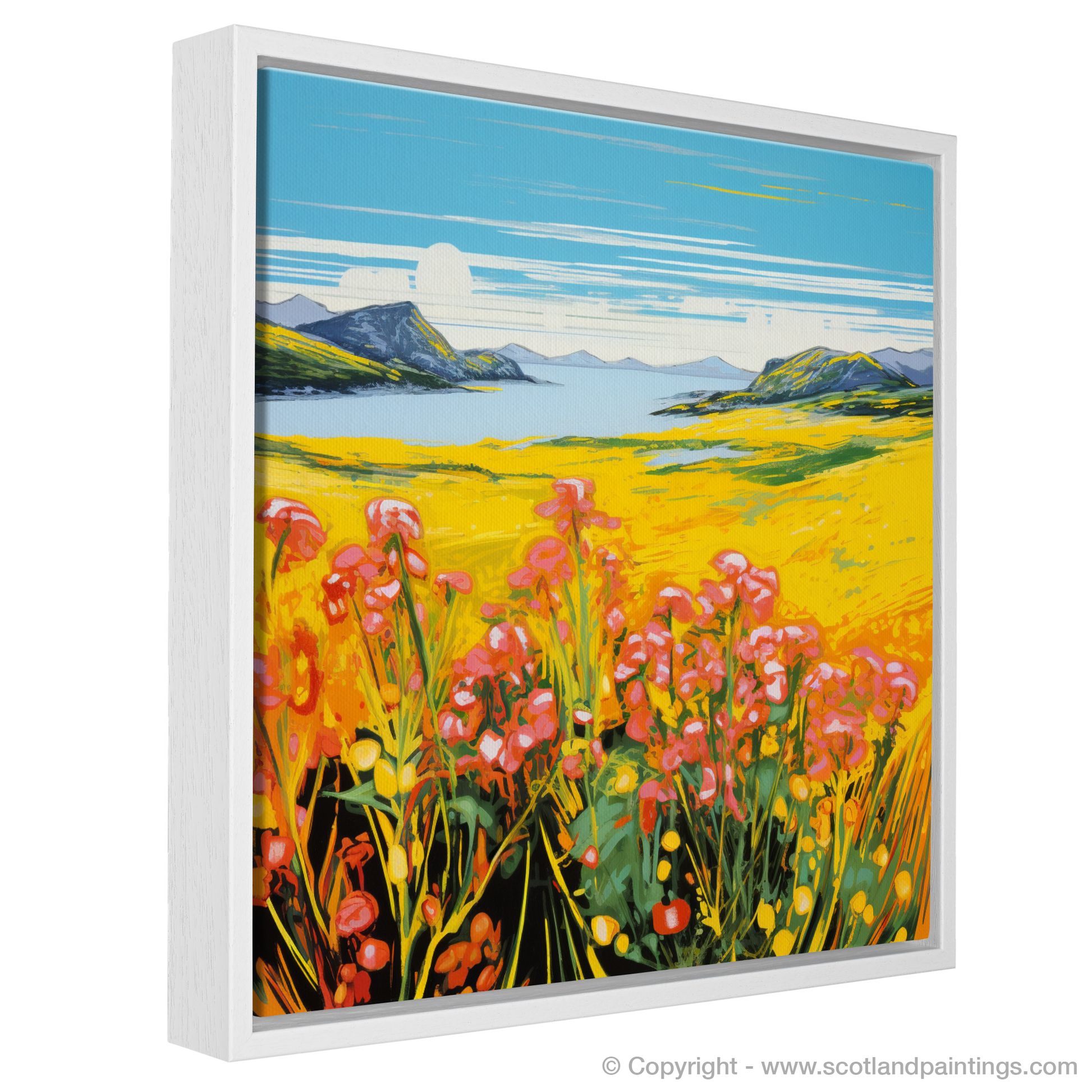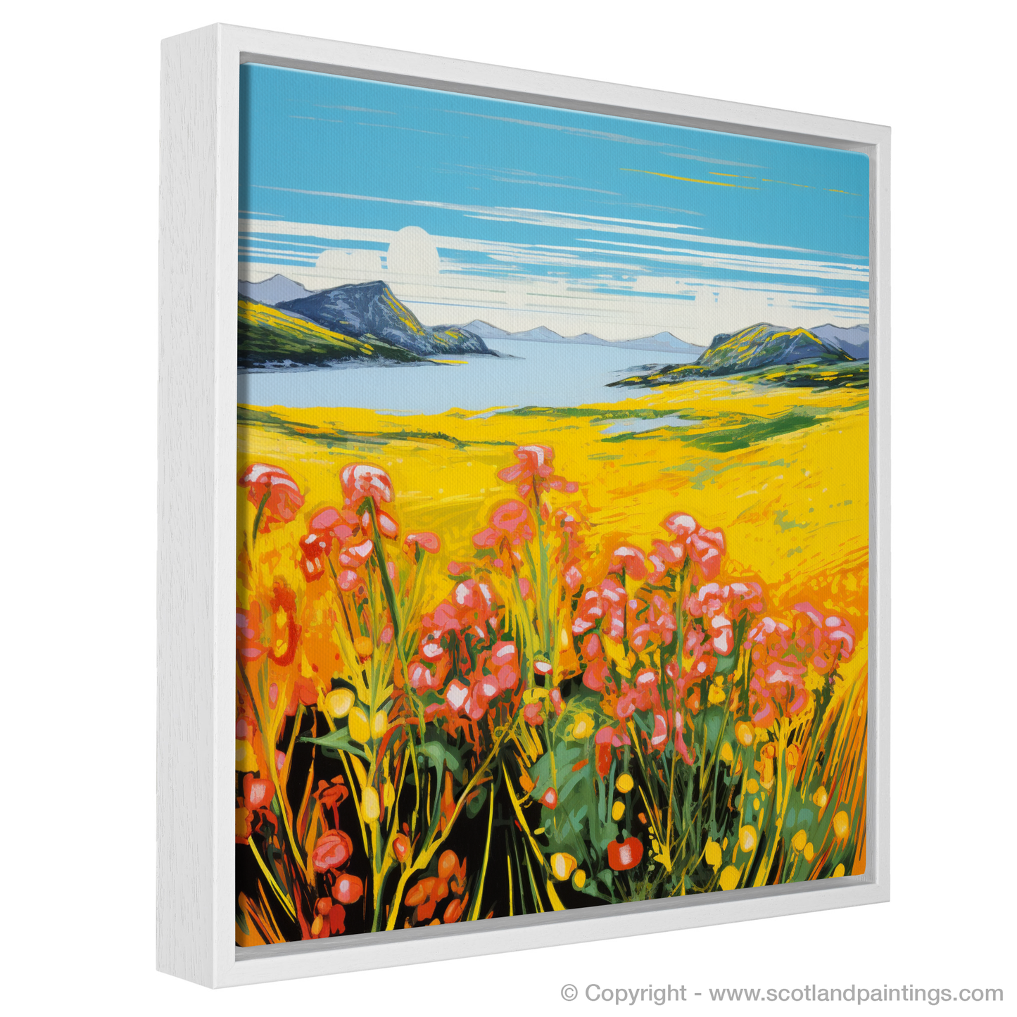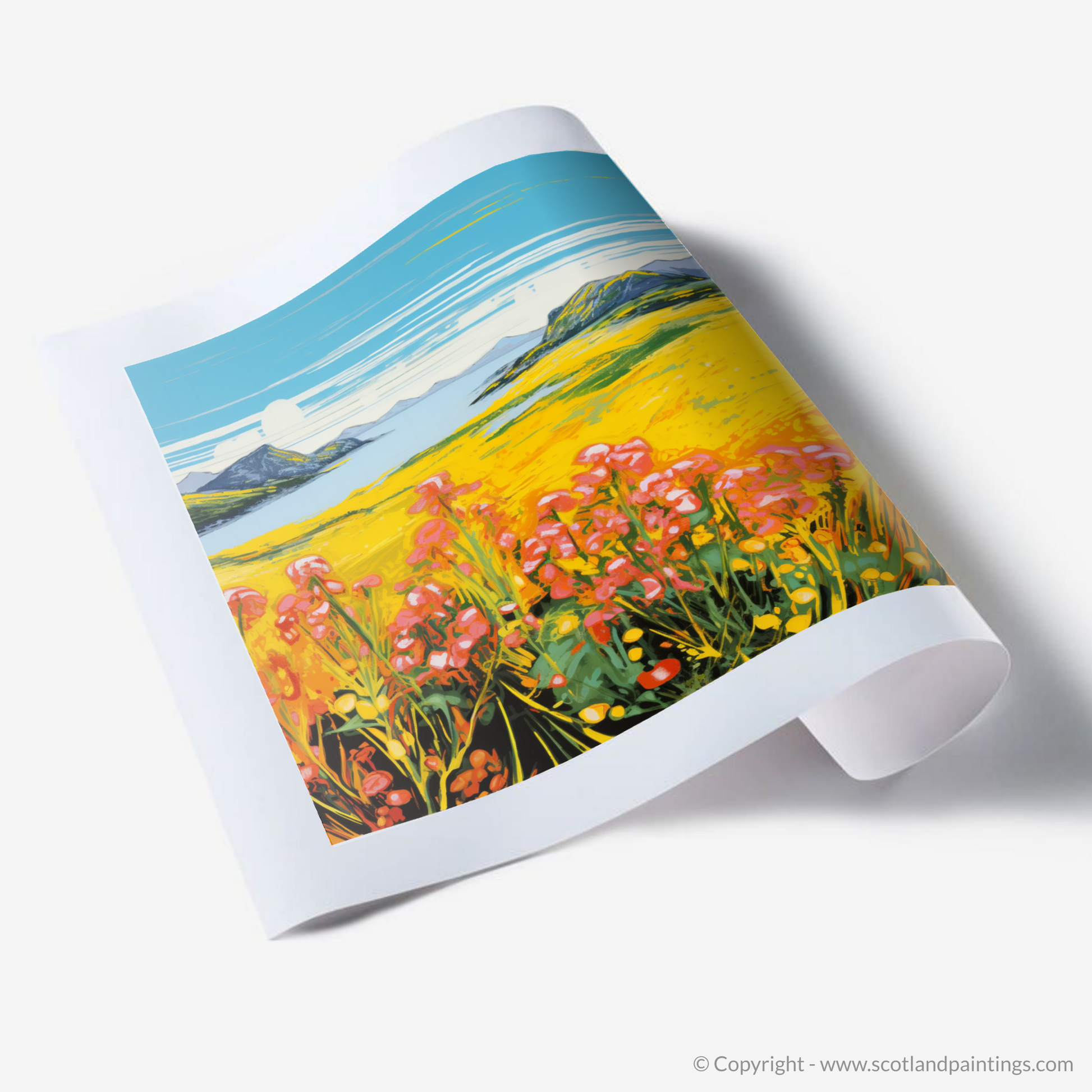 The print exudes an electrifying visual energy reminiscent of the Pop Art era, with its intense colour palette bringing to life the sweeping yellows of the flower-speckled meadows. Vivid pinks and reds of blossoms punctuate the scene, creating a striking contrast against the lush greens and deep blues that depict the Machair's harmonious surroundings.