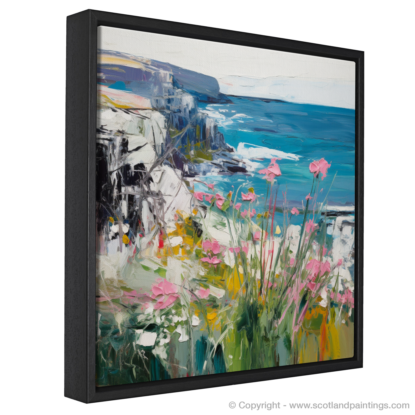 Unyielding rocky cliffs depicted in broad, confident strokes of black and grey carve through the painting, their stoic presence a striking contrast to the floral foreground. The cliffs reach out into a sea painted in glorious shades of blue, their varied hues capturing the ocean’s mercurial moods—from the deepest of azures to the frothy whites where the waves kiss the land.