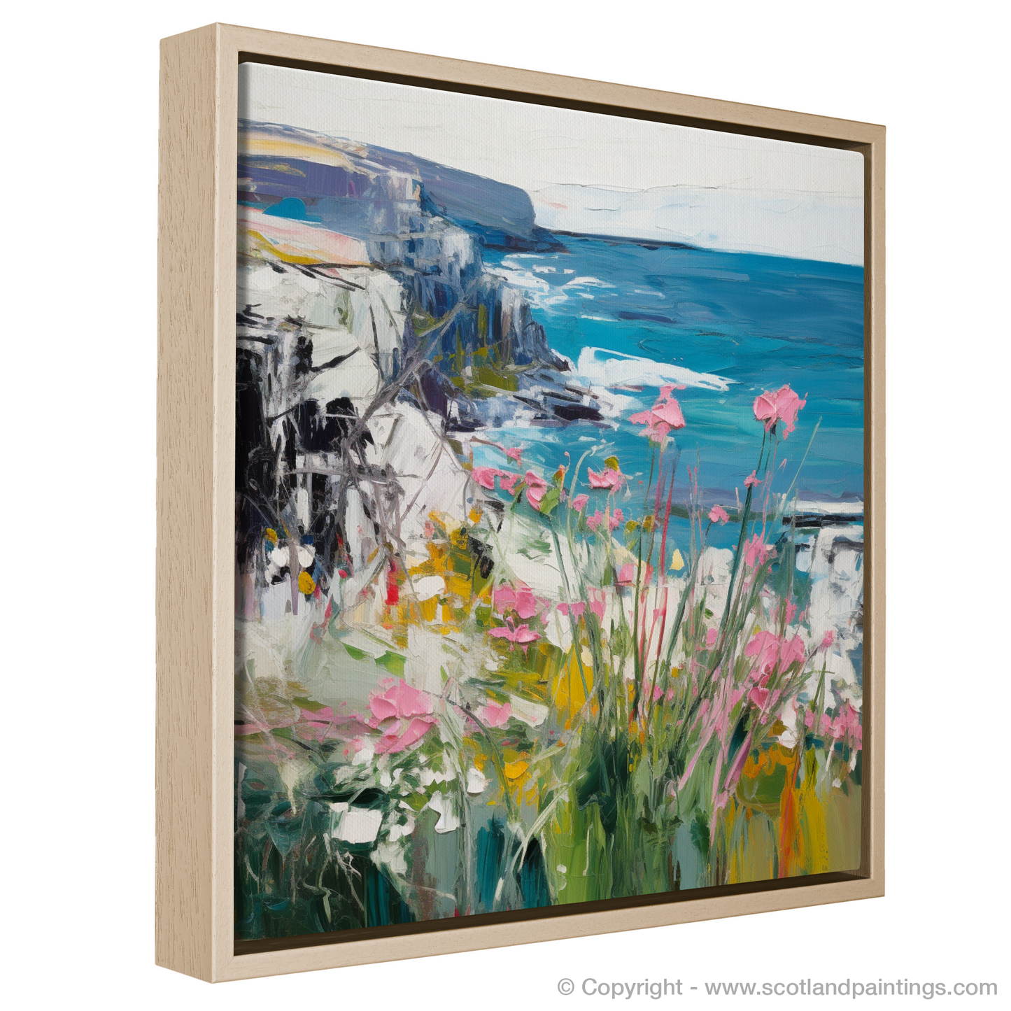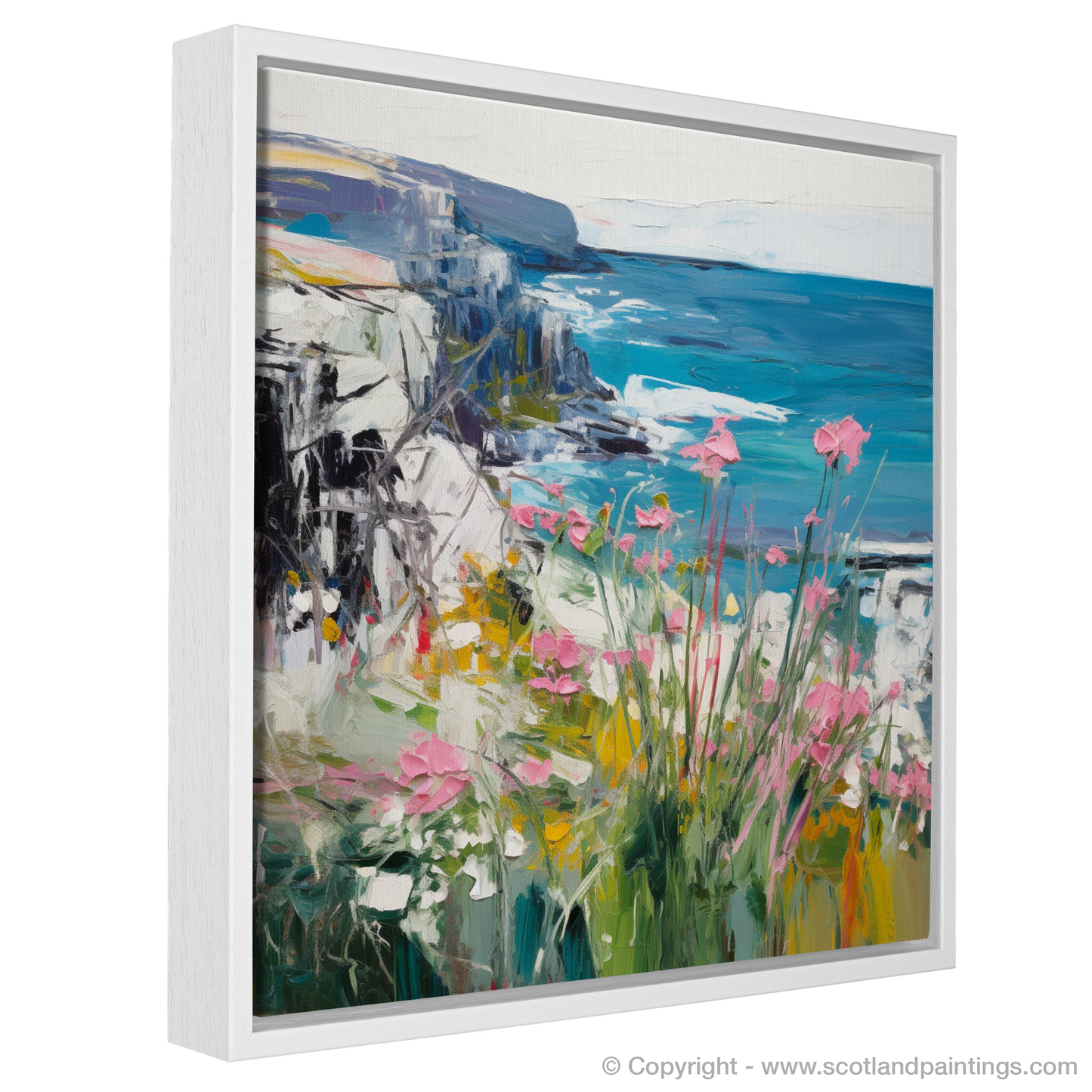 At the heart of the composition, the dynamic interplay of flourishing pink thrift brushes against the canvas like wild ballerinas dancing in the coastal breeze. Interspersed with the delicate white blossoms of sea campion, the petals pirouette atop whorls of greenery that hint at luscious samphire thriving amidst this rich tapestry of flora.