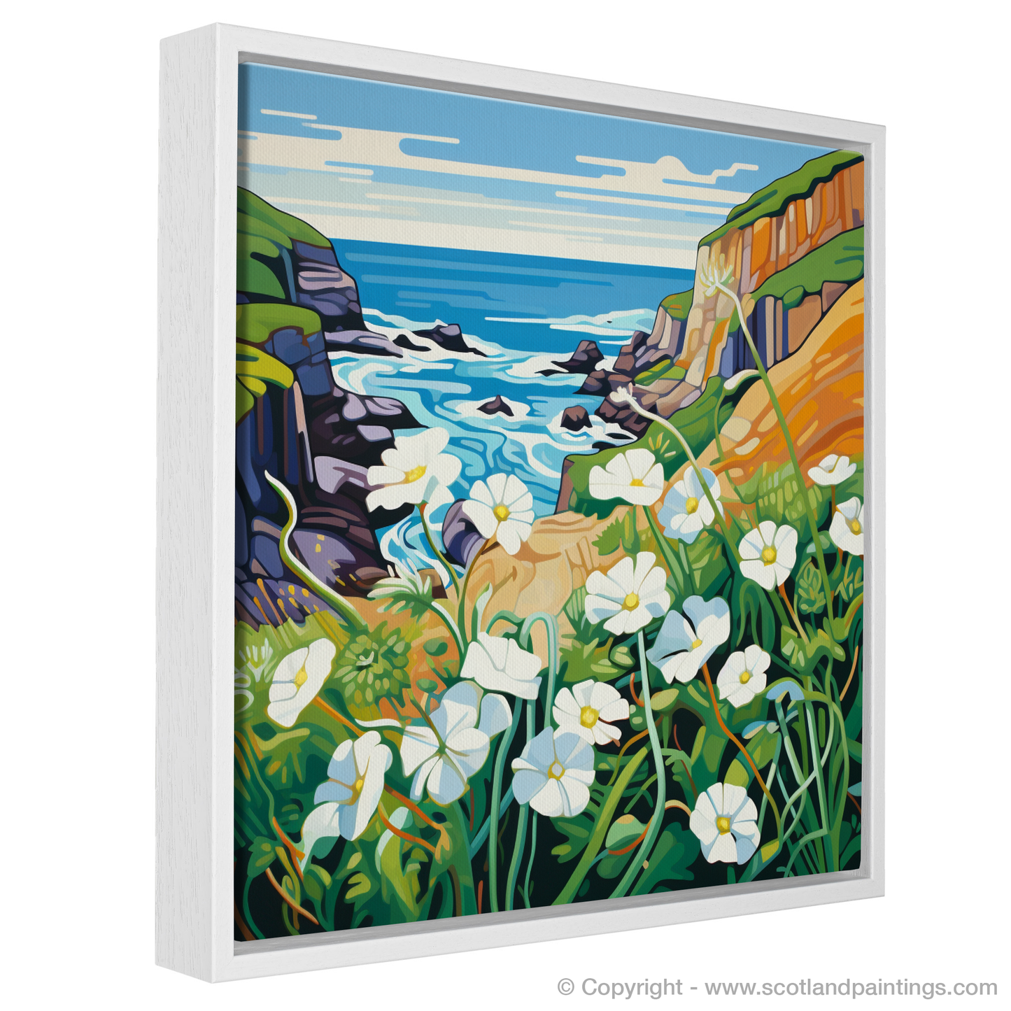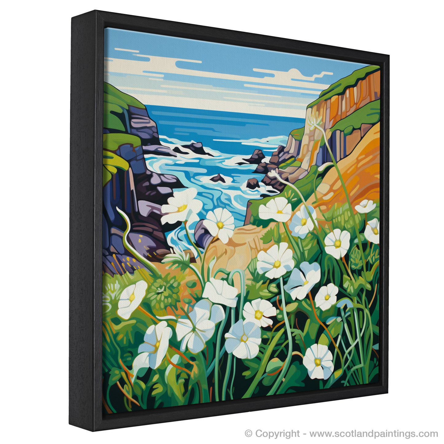 Luscious greens of the clifftop grasses lay the foundation for the star-like blossoms of the Sea Campion, each petal glowing with a pure, crisp white, offset by sunlit yellows at their centres. The artist's stylised approach elevates the scene, lending a graphic vibrancy to the rugged and steep cliffs that form an imposing backdrop to these fragile florals.