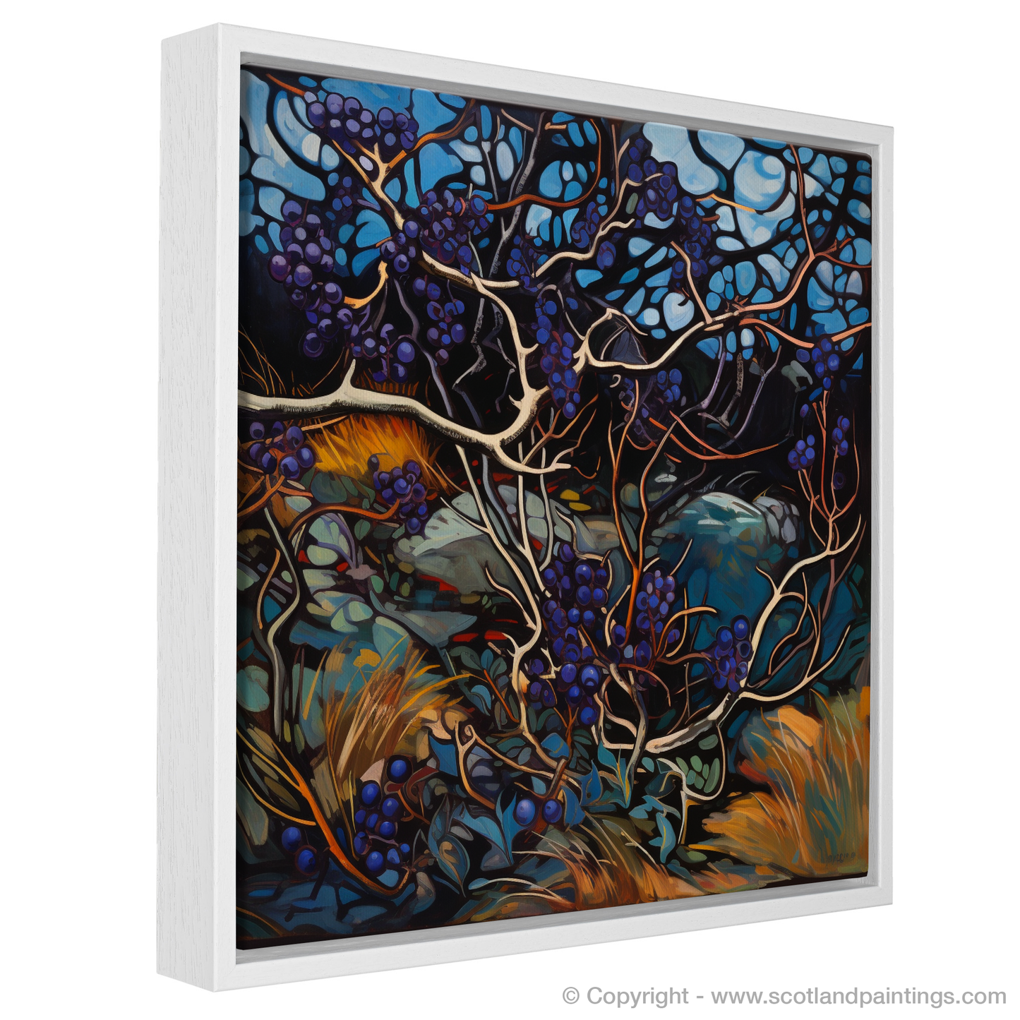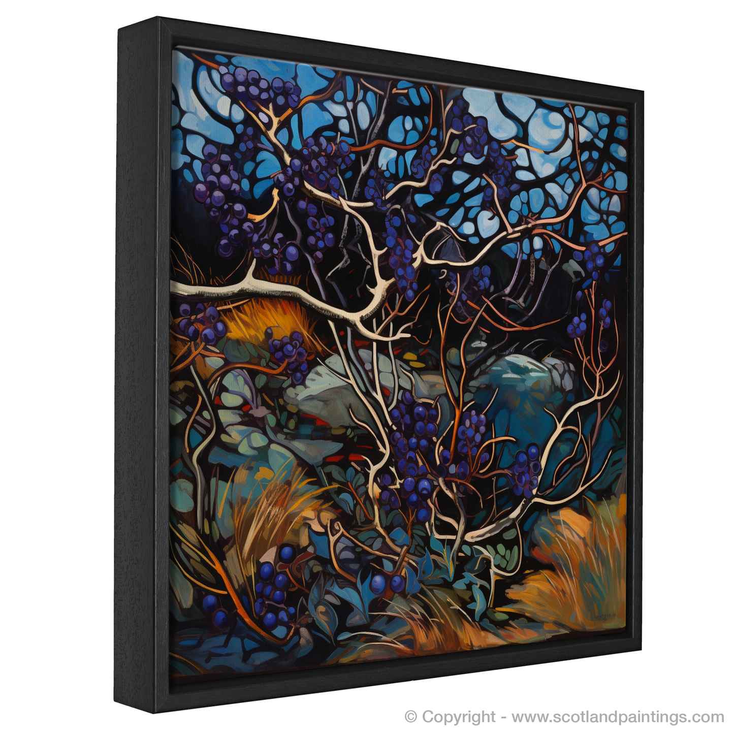 The print showcases a rich interplay of colour and form, encapsulating the essence of the bilberry bush with a fresh perspective. Deep blue hues cluster to represent the plump, ripe berries that are scattered throughout the intertwining branches. Splashes of white cut through the foliage, evoking the starkness of the branches against the dusky backdrop of the forest park's famed heathlands.