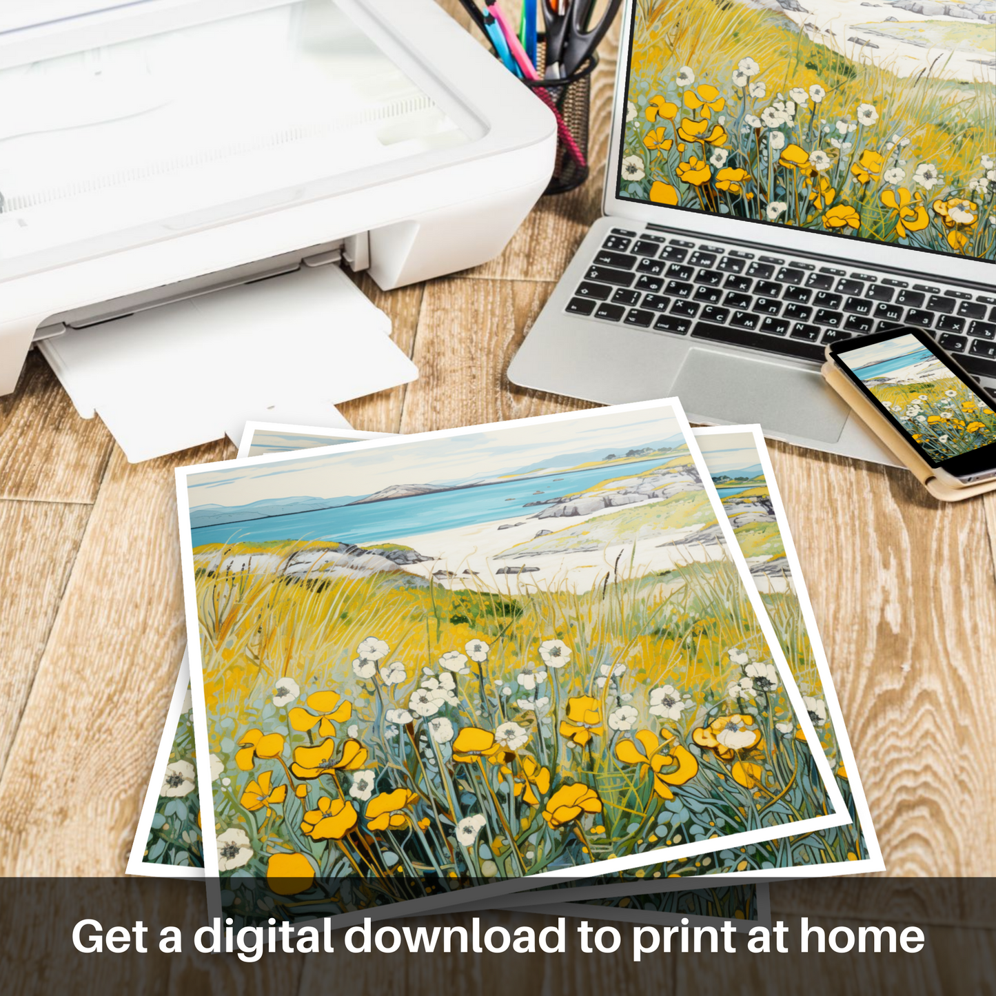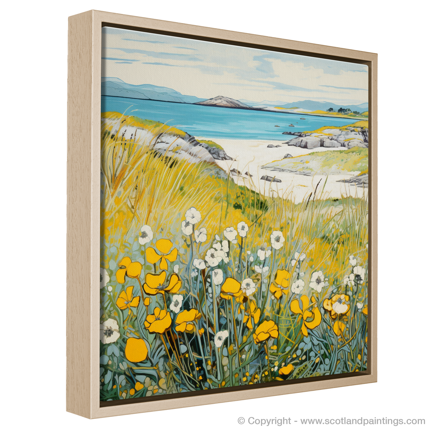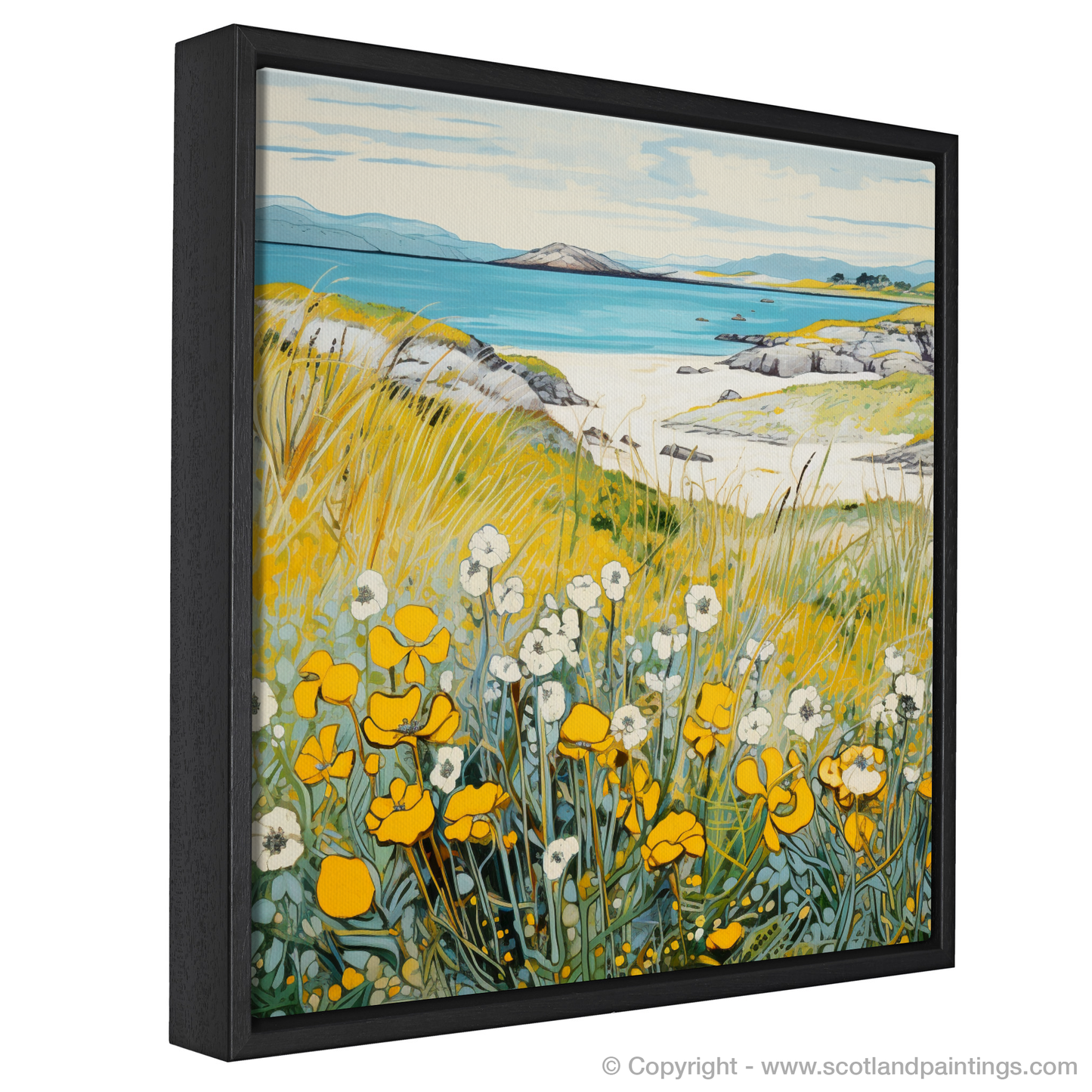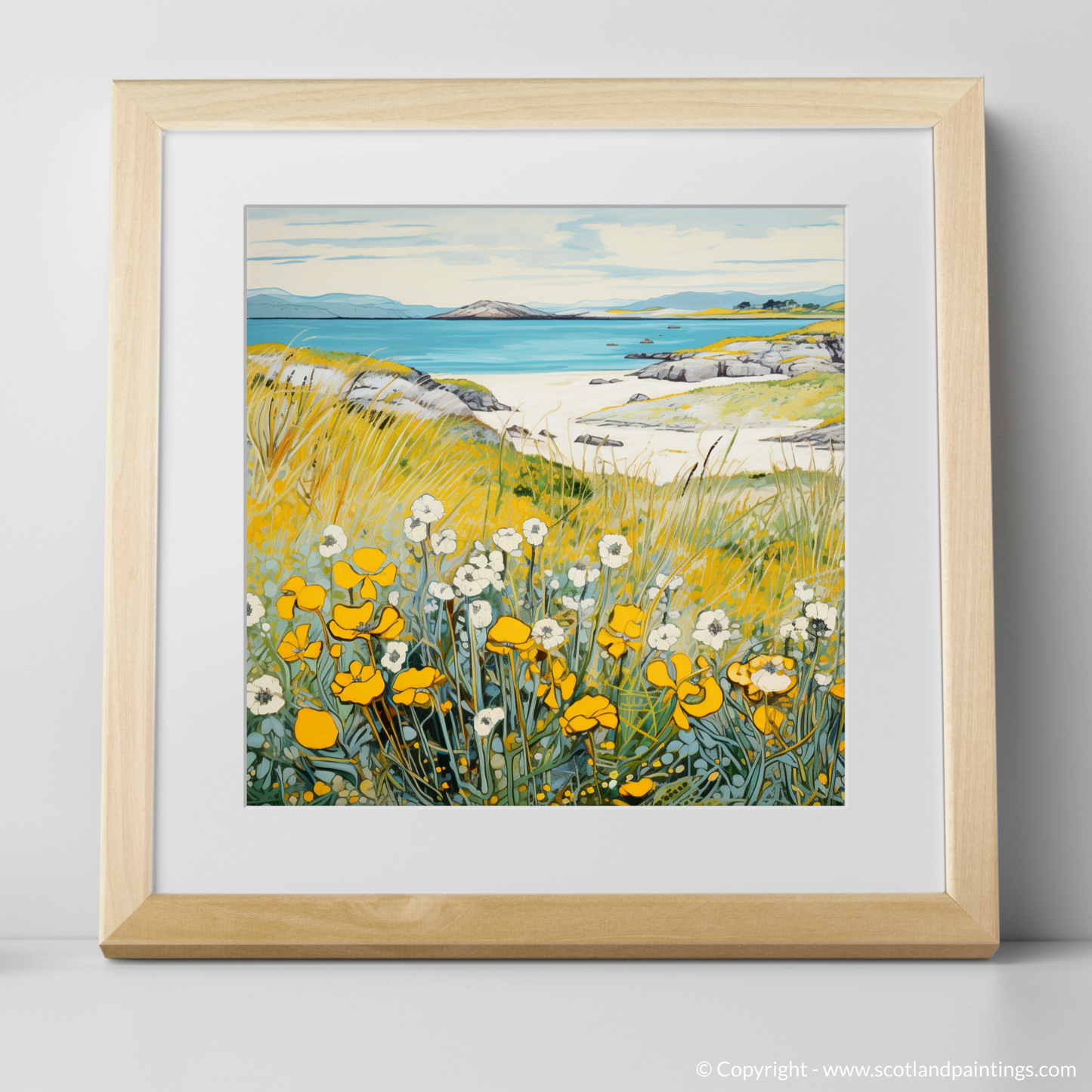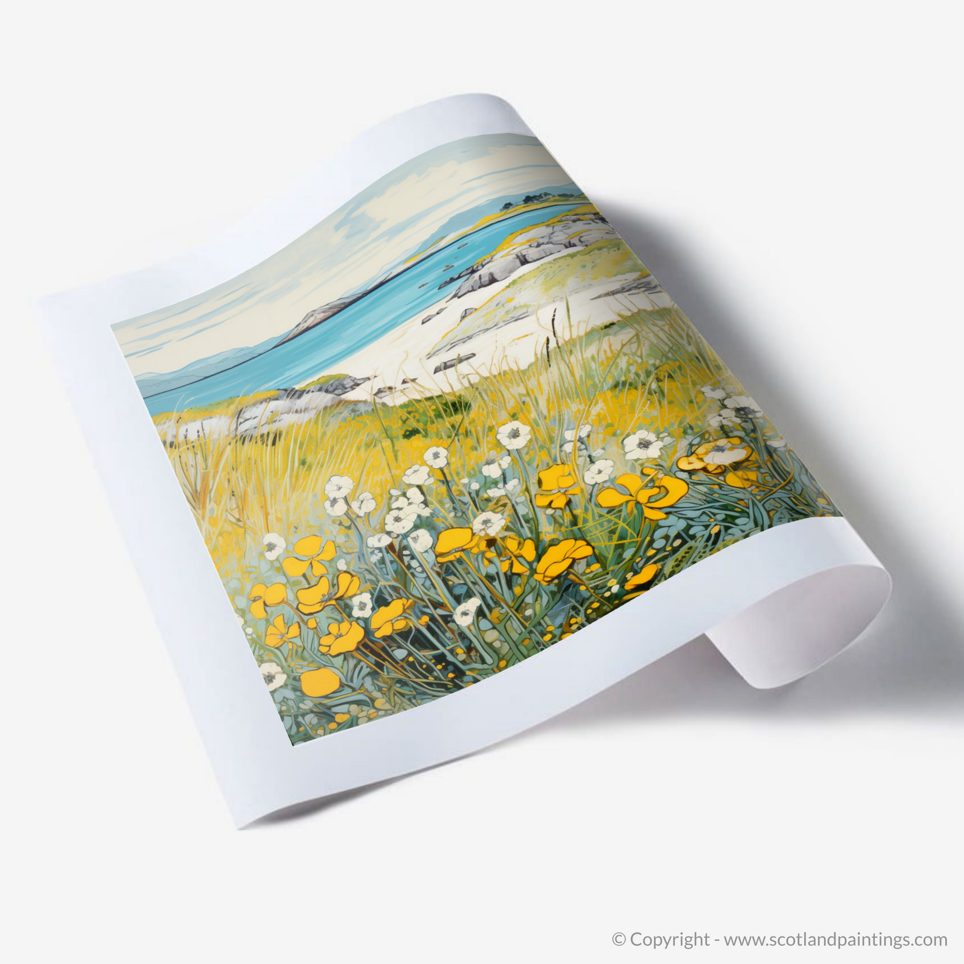 Capture the tranquil essence of Scotland's natural beauty with this exquisite print, a celebration of the delicate Lady's bedstraw adorning the coastal landscapes of Barra. Our offering evokes the charm of the Machair, a unique Scottish habitat characterised by its verdant grasses and wildflowers that flourish upon gentle slopes leading to the sea.